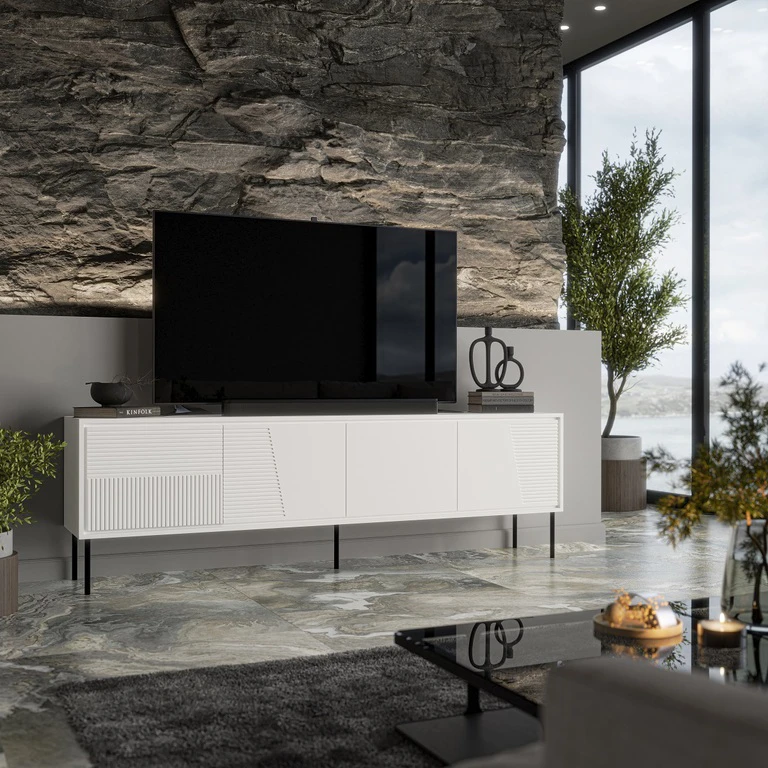 The Abi cabinet is a modern, white TV stand that will turn heads. It will fit perfectly into modern interiors. Its simple form is enhanced by a fashionable milled front, giving the entire piece a unique character. A key advantage of this piece is its high legs, made of powder-coated steel, which add visual lightness and stability. This solution also makes cleaning underneath the unit easier. The cabinet is divided into three spacious niches, allowing you to easily store essential accessories and small items. The cabinet is also available in cashmere and black. Chests of drawers can be ordered to complement the cabinet in three colors.