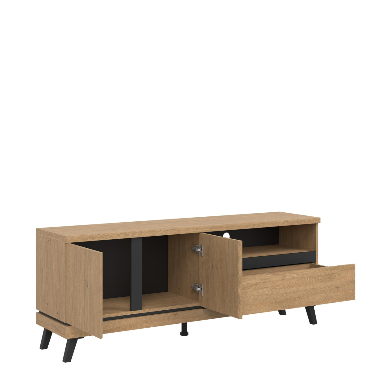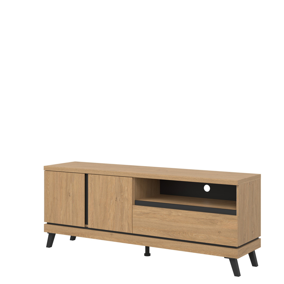 Width 159.5 cm Depth 39 cm Height 62.5 cm Product weight with packaging 44.35 kg Manufacturer’s code / symbol AT01 Collection name ATE Name in the b2b system ATE AT01 STONE OAK/BLACK RTV KPL Number of product packages 3 Style Modern Equipment Assembly instructions / assembly accessories Assembly For self-assembly Body color Stone oak / Black Body material / type / thickness 16 mm furniture board Top of body material / type / thickness 32 mm furniture board Bottom crown of body material / type / thickness 16 mm furniture board Base of body material / type / thickness 16 mm furniture board Back wall material / type / thickness 2.5 mm HDF furniture board Back wall – visible part color Black Front color Stone oak Front material / type / thickness 16 mm furniture board Front hinge ⌀ 35 mm adjustable in three planes Front handle / finish / color Milled / stone oak Hole for TV cables ⌀ 50 mm Soft-close door system As standard Full extension drawer guides Leg / finish / color Non-adjustable / plastic / black Leg height 120 mm Additional leg / finish / color Adjustable middle / plastic / black Number of doors 2 Number of drawers 1 Number of open niches 1 Number of closed niches 1