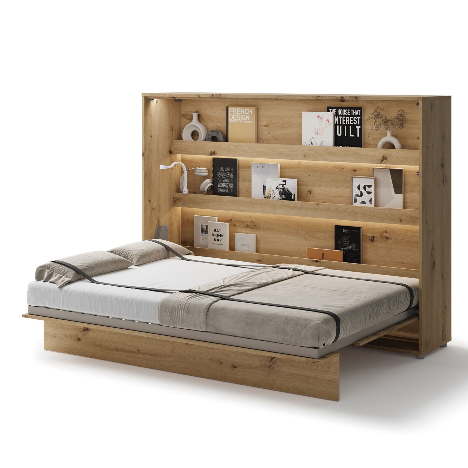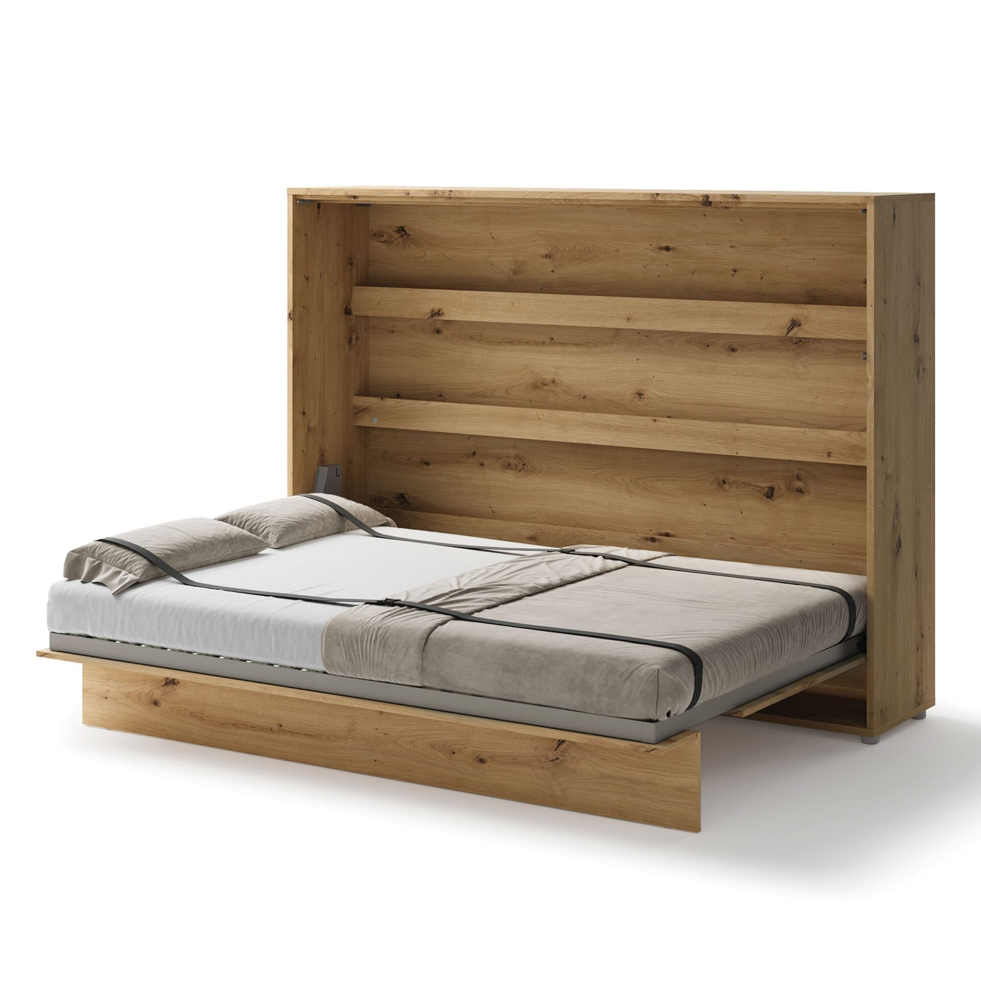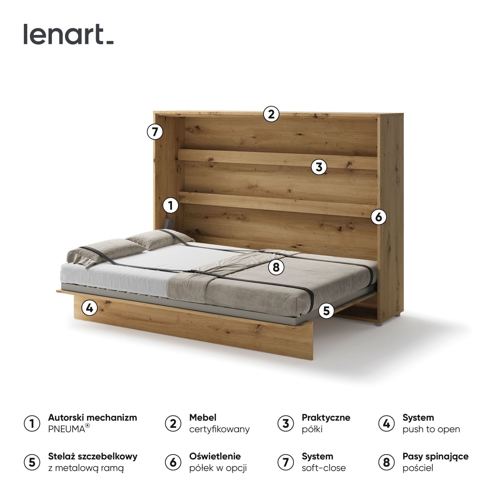 Lenart BED CONCEPT BC-04 Horizontal Wall Bed 140 cm is a comfortable wall bed that easily saves space. The Lenart brand has created a piece of furniture that transforms a living room into a comfortable bedroom in moments. The Artisan Oak finish combines functionality with a natural, warm finish that perfectly complements both modern and classic interiors. The BED CONCEPT BC-04 model is designed for a 140 cm wide mattress, making it an ideal choice for a couple or as a wide, comfortable bed for one person. Additional shelves inside the unit allow for storage of books, decorations, and everyday essentials. The stable metal frame, wall-mounted frame, and pneumatic lifts ensure comfort, safety, and durability. The wall bed was awarded the 2019 Gold Medal at the Poznań International Fair, confirming its high quality and innovation. It is a practical solution that saves space while offering complete sleep comfort. The Artisan Oak finish adds a cozy and elegant touch to any interior.