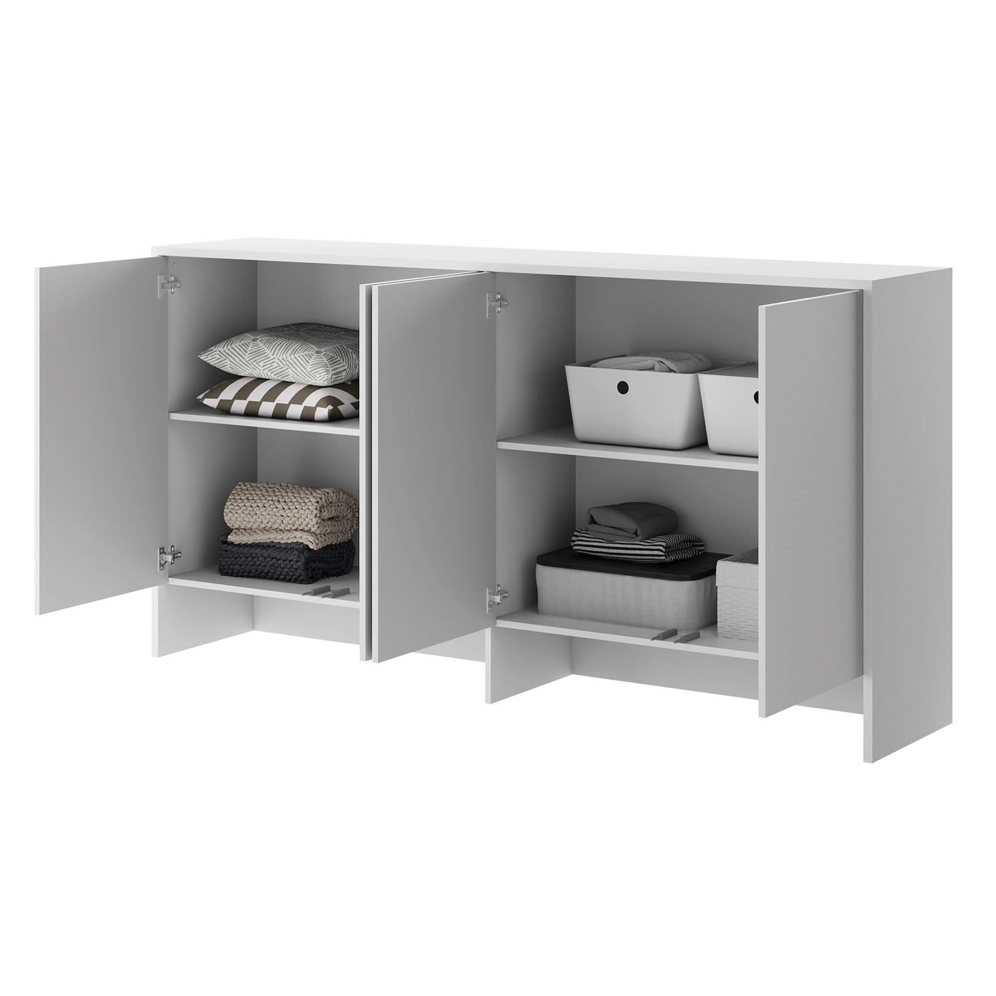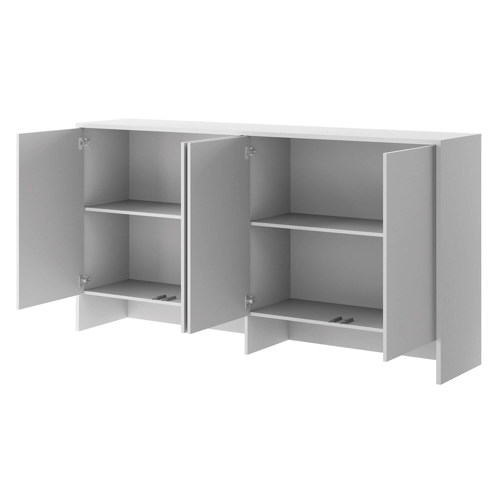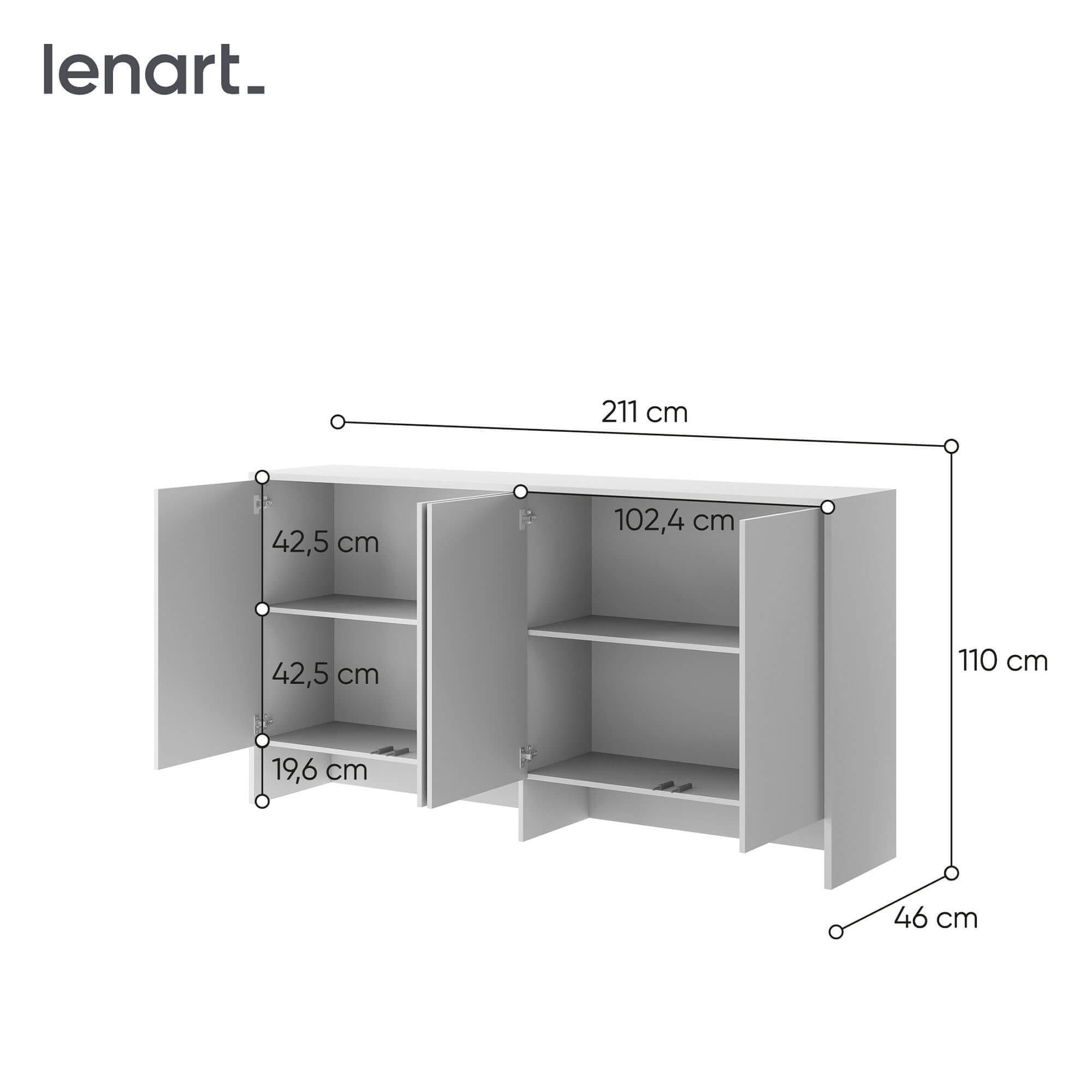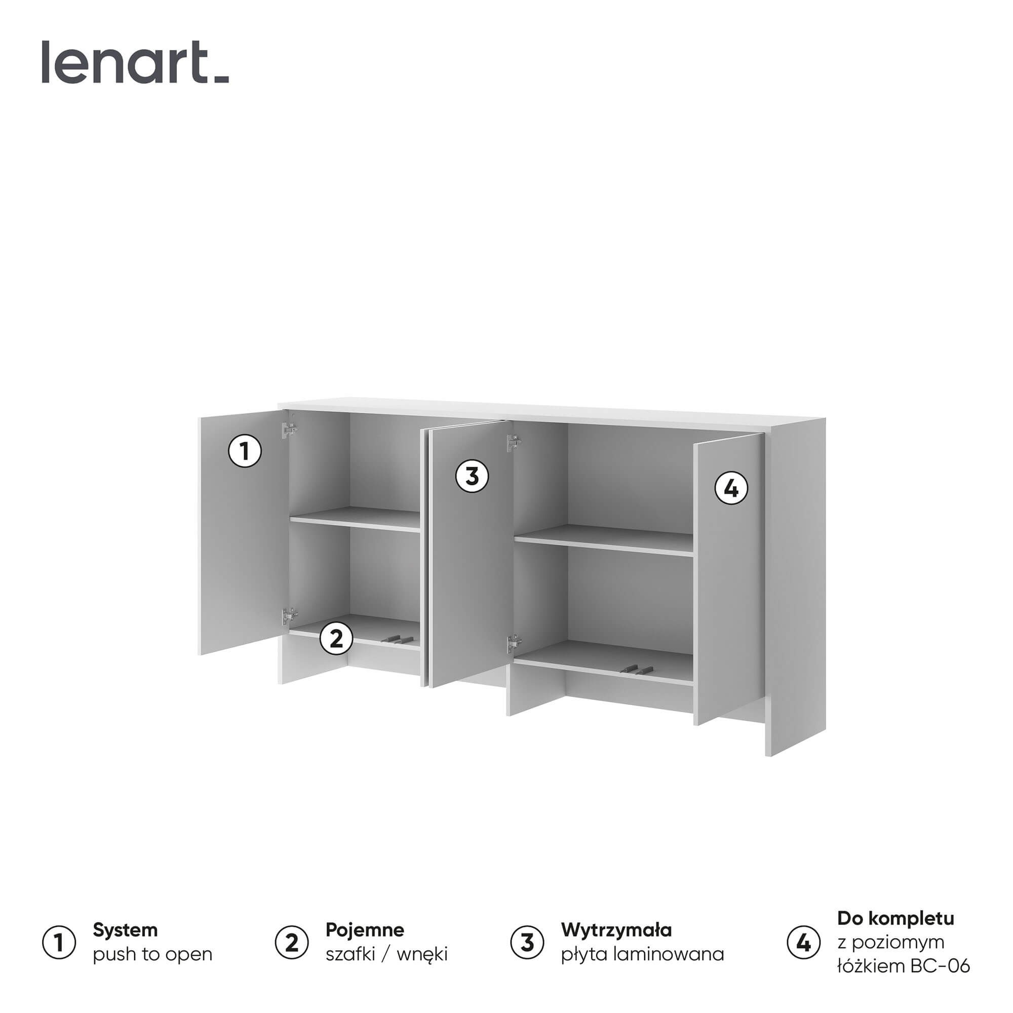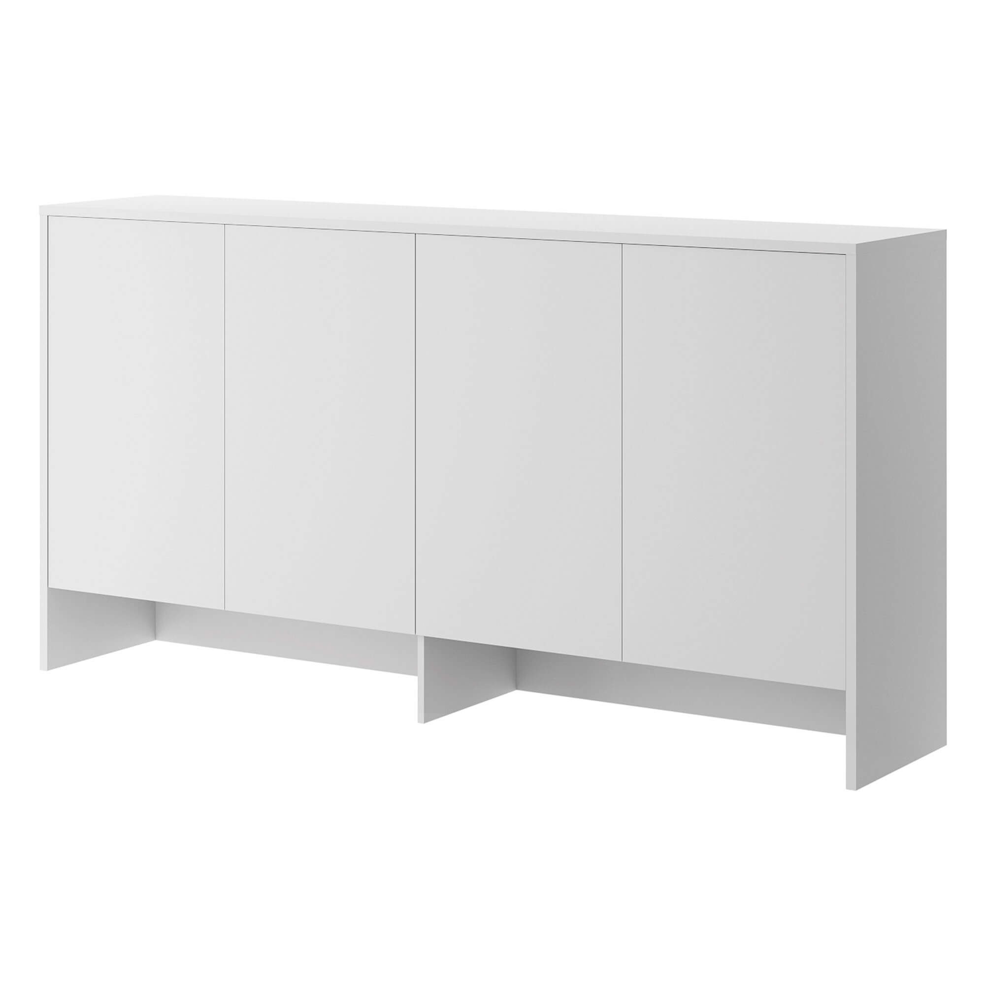 The Lenart BED CONCEPT BC-11 is an extension designed for the BC-06 wall bed. It’s a functional piece of furniture that allows you to fully utilize the wall space, providing additional storage space. The Lenart brand combines modern design with practical solutions, making this extension perfect for a bedroom, teenager’s room, or living room. The BC-11 extension has four side-opening fronts, which reveal spacious shelves. It’s the perfect place to store clothes, bedding, books, or other accessories you want to keep organized and within reach. Combined with the BC-06 wall unit, it creates a cohesive, elegant unit, perfectly suited to modern interiors. The unit is made of laminated board with ABS edging, ensuring durability and resistance to damage. The neutral white color adds a lightness to the room, visually expanding it, and complements a variety of arrangements. The unit measures 211 cm wide, 110 cm high, and 46 cm deep, making it spacious without overwhelming the space.