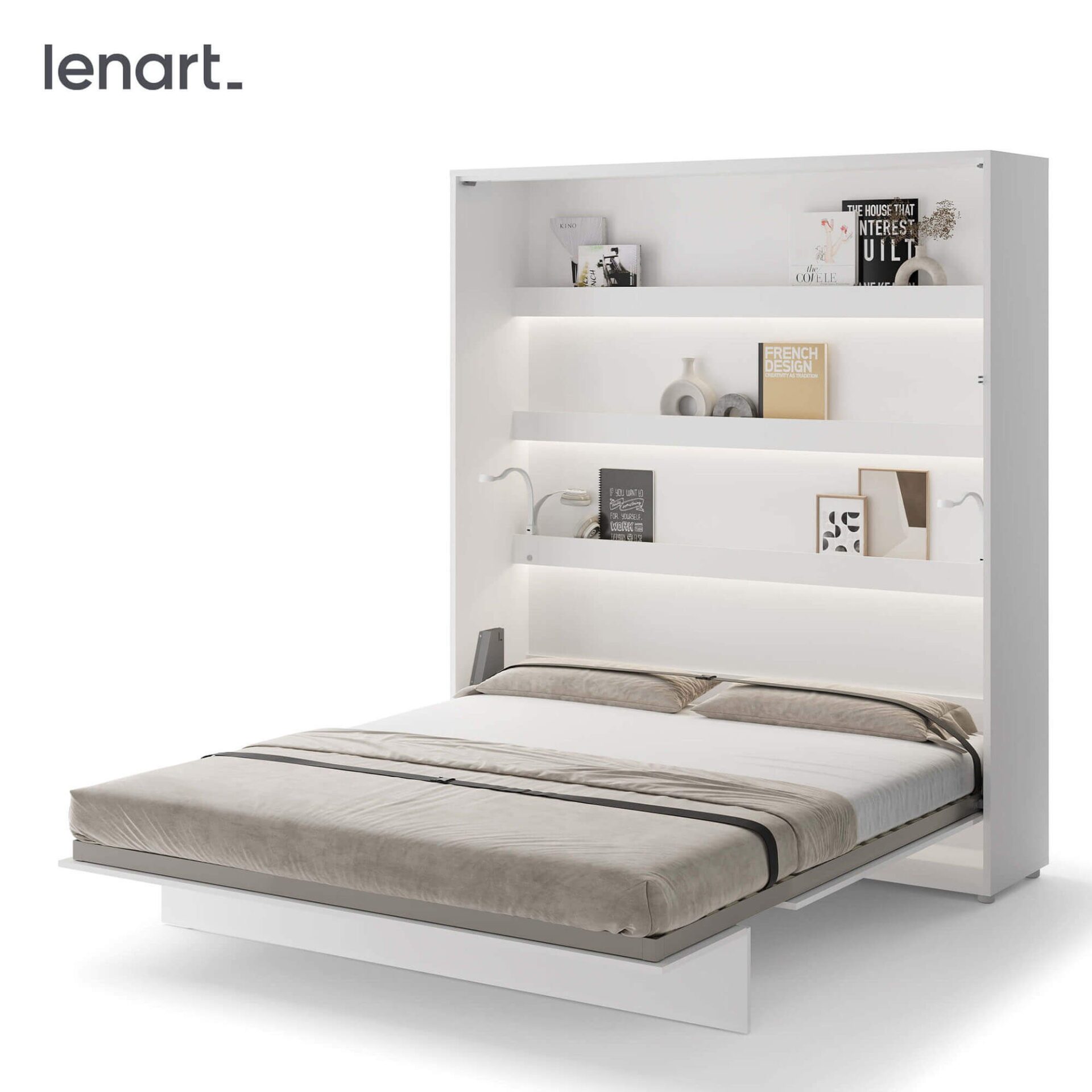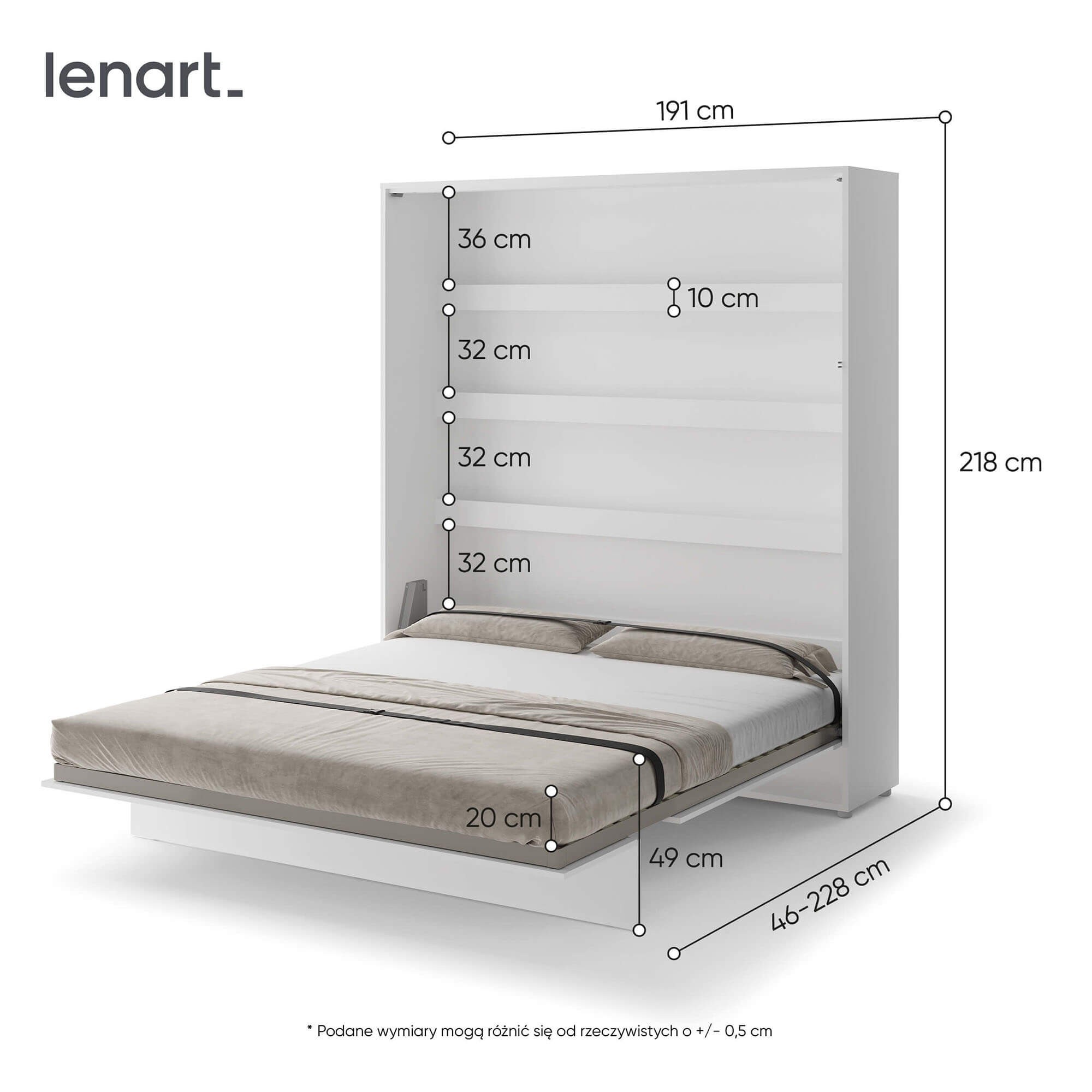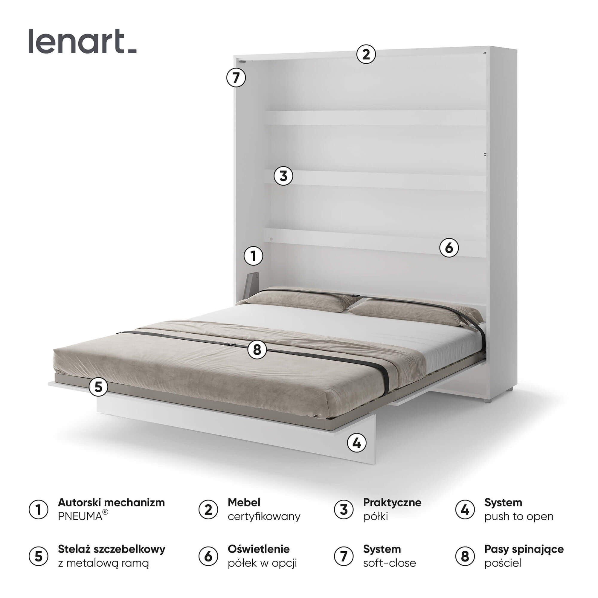The Lenart BED CONCEPT BC-13 is a vertical wall bed designed for a 180 cm mattress. Lenart designed this model to combine the comfort of everyday sleep with modern design and space-saving functionality. The white version perfectly brightens and visually enlarges the interior, making it suitable for both small apartments and spacious interiors. The BC-13 model stands out with its practical mechanism – opening and closing is easy and safe thanks to pneumatic lifts. The stable metal frame, slatted base, and straps securing the bedding make the bed as comfortable as a traditional model, while allowing you to instantly regain space in the room. An additional advantage is the internal shelves, which can serve as a practical storage space for books, a phone, or decorations. The BC-13 wall bed has received an award. The furniture is made of laminated board and MDF, resistant to damage and moisture, and the fronts and frames are protected with ABS edging. Genuine leather handles emphasize the meticulous finish. Additionally, the soft-close system makes closing almost silent.