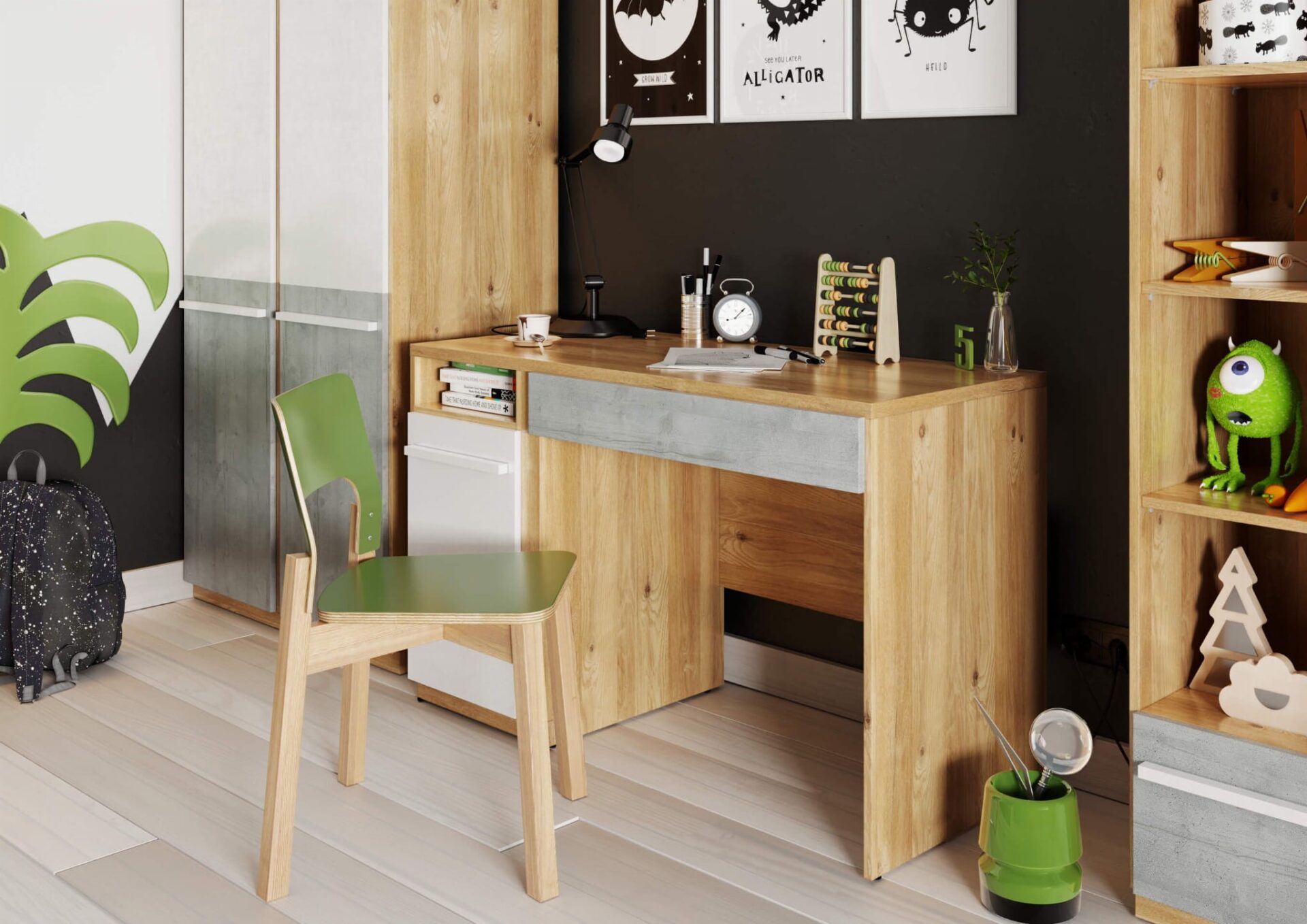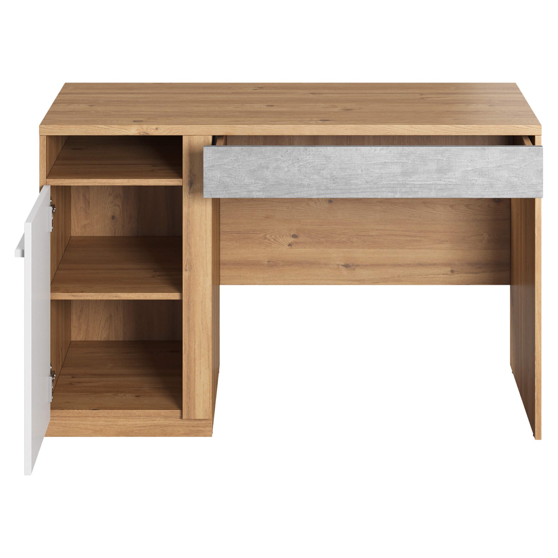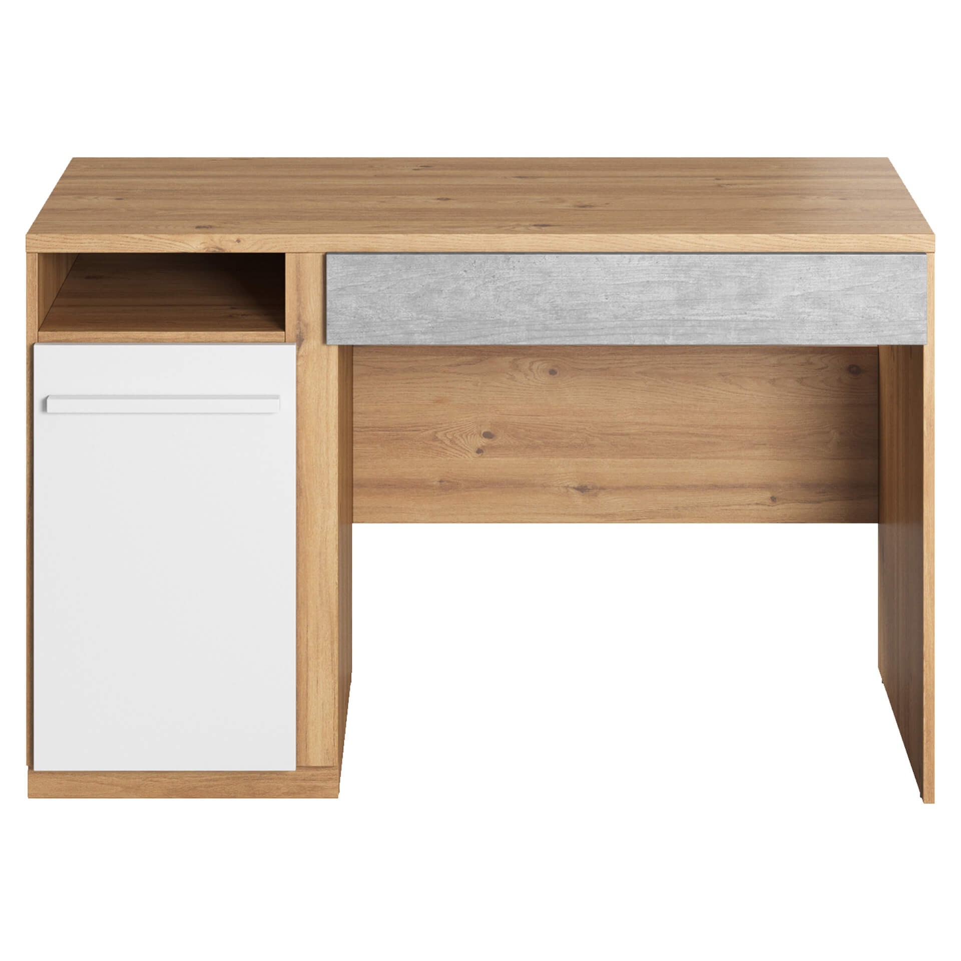 Model: PN-06 Color: nash oak/mitu gray/white Dimensions: Width: 120cm Height: 76cm Depth: 55cm Basic information: body name: PN-06 collection name: PLANO body index: PN6DBB colors: nash oak/mitu gray/white furniture type: desk body characteristics: 1D1S width: 120 cm height: 76 cm depth: 55 cm body weight: 39 kg assembly: assembly required collection style: modern interior type 1: youth room equipment: 2x shelf number of drawers: 1 number of doors: 1 Fittings: hinge: concealed regular handle: MDF strip drawer runner: ball bearing runner foot / leg: slide with nail lighting included: none Execution: body: laminated chipboard: 16mm; 25mm body edge finishing: A 0.45mm body color: nash oak top: laminated chipboard; 25mm top edge finishing: A 0.45mm number of glued top edges: 4 top color: nash oak back wall: laminated chipboard; 16mm finishing of the visible part of the back wall: laminate finishing of the invisible part of the back wall: raw back wall mounting: nuta back wall color: white/nash oak shelf: laminated chipboard; 16mm shelf edge finishing: A 0.45mm number of glued shelf edges: 1 permissible shelf load: 5kg shelf color: nash oak number of shelves: 1 front: laminated chipboard; 16mm front edge finishing: S 1.70mm front color: white / mitu grey drawer interior finishing: white ribbon drawer bottom: HDF board; 3mm Important: This desk is made to order. Cancellations are not possible after 48 hours of placing your order. Please shop carefully.