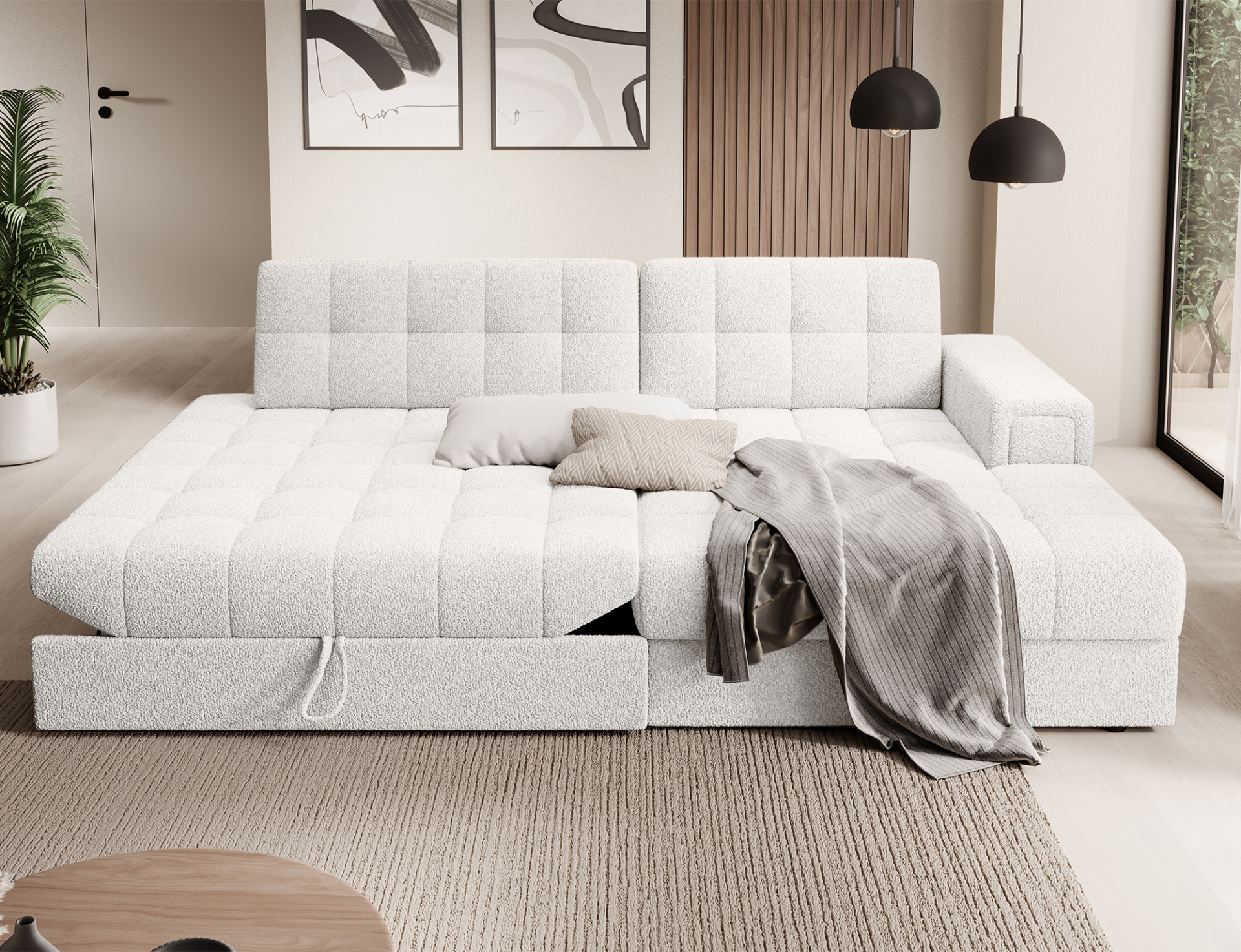 The Blezalt corner sofa is a perfect blend of modern design, functionality, and comfort. Its dimensions of 240x150x82 cm provide space for daily relaxation, while the sleeping function and bedding storage make it an ideal choice for any interior. The T2540 polyurethane foam seat and B-type wave springs guarantee comfort and resistance to deformation, while the foam filling in the backrest adapts to the body, providing optimal support. Thanks to the Delfin folding mechanism, the corner sofa transforms into a comfortable bed in seconds, and the bedding storage allows for storage of additional textiles. The upholstered back makes it look elegant from every angle, while black plastic legs add stability and lightness. Perfect for living rooms, den, and modern interiors, it offers comfort and style for years to come.