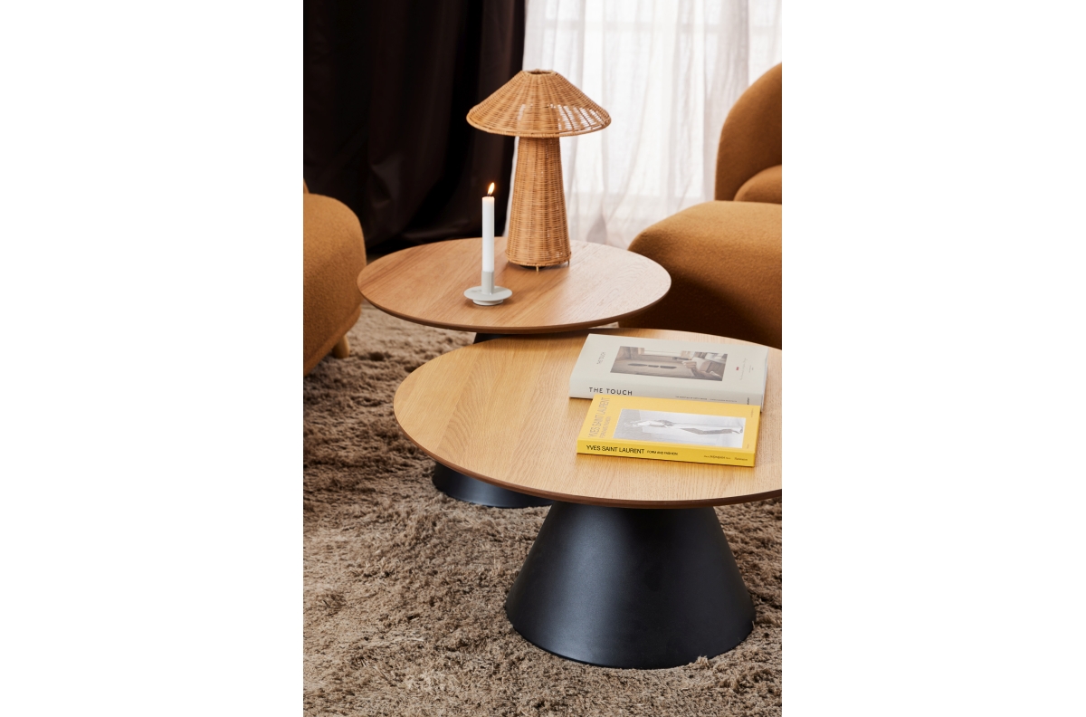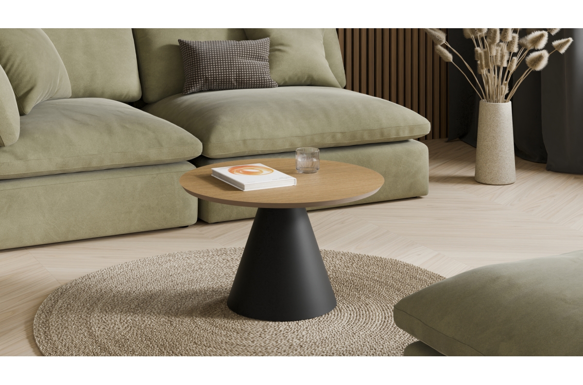 The BOSCO coffee table is an elegant piece of furniture with a modern form that combines simplicity with refined design. It features a round veneered top mounted on a solid, conical steel leg, giving it a sculptural appearance and exceptional stability. The harmonious composition of shapes makes the table a perfect fit for both modern and minimalist interiors. BOSCO is not only a, FUNCTIONal piece of furniture but also a stylish decorative accent.