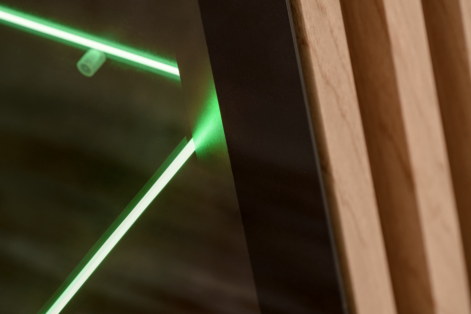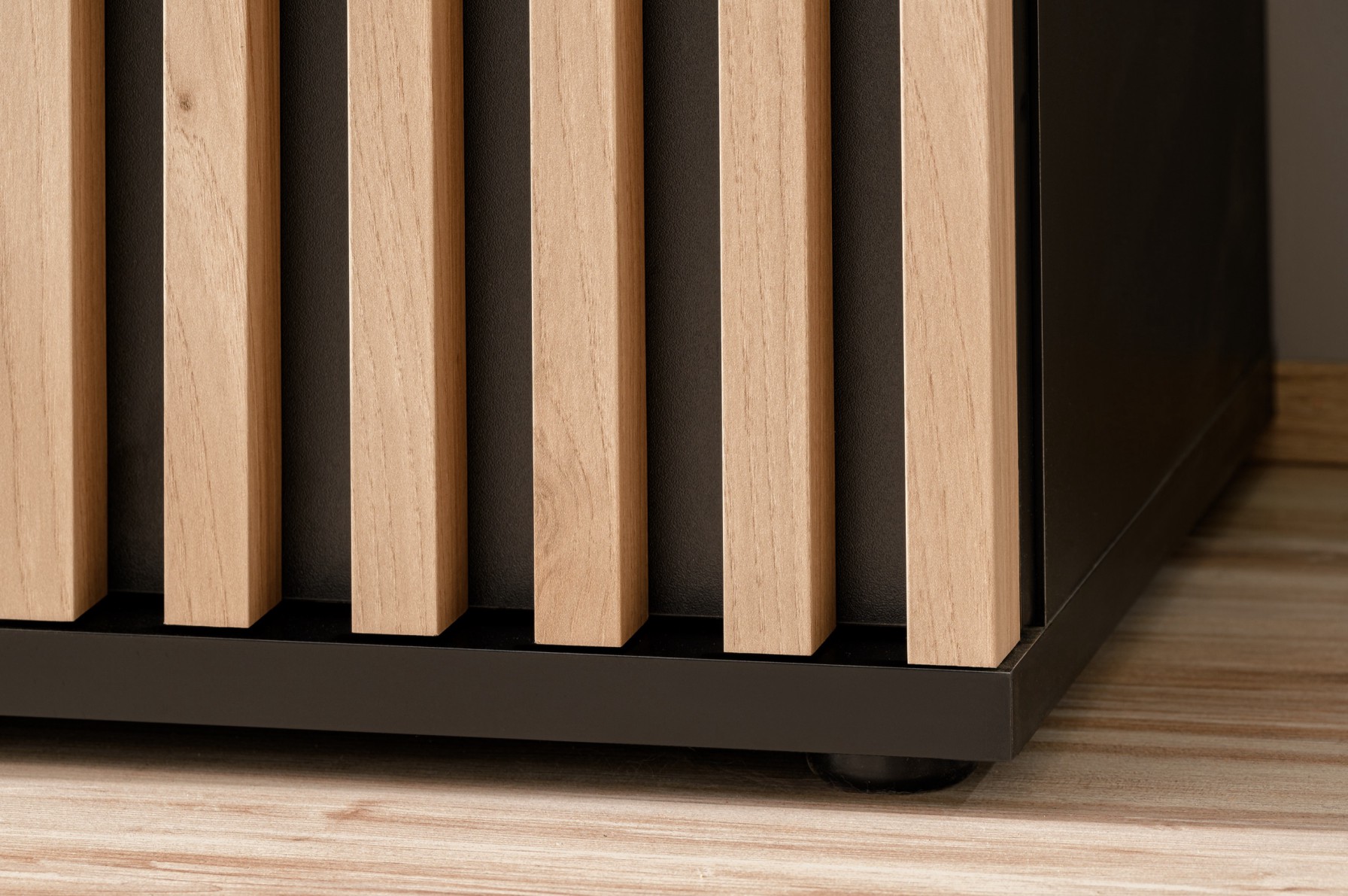 Tall Display Cabinet: Glass doors with a black aluminum frame, behind them 4 glass shelves with white LED lighting. Solid door: slatted front, 4 standard shelves inside. Low Display Cabinet: Glass doors with a black aluminum frame, behind them 2 glass shelves with white LED lighting. Solid door, slatted front, 2 standard shelves inside. TV Cabinet (3 doors): 2 doors – slatted front, behind each door is 1 compartment. In the center is one glass door with a black aluminum frame, behind it is a glass shelf illuminated by a white LED.
