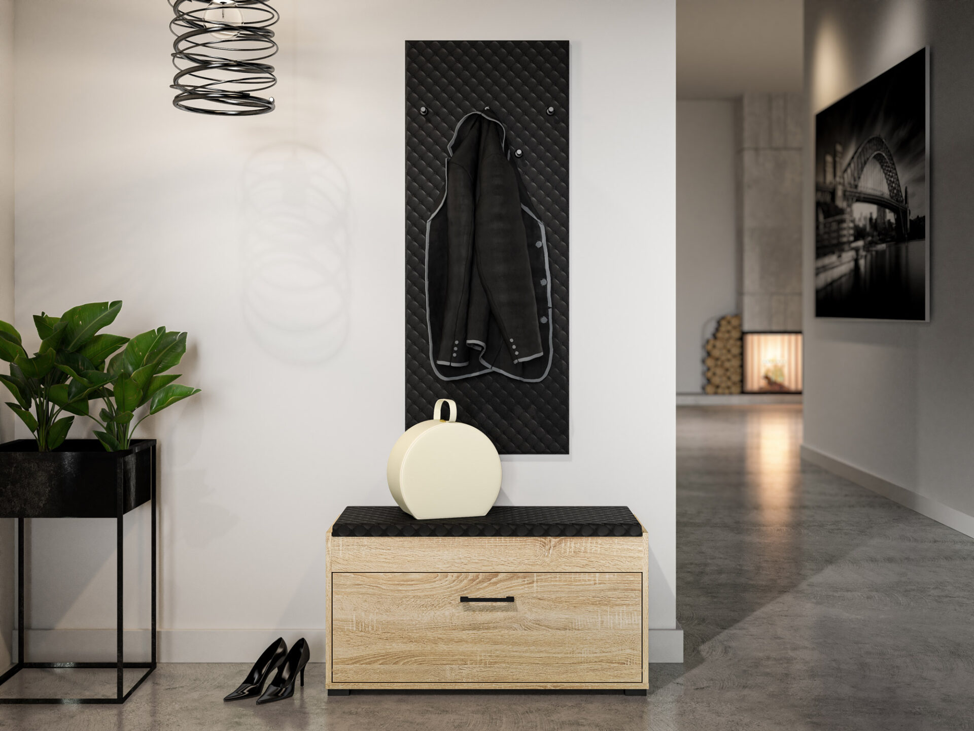 The Caro 19 coat rack is a compact piece of furniture for any hallway. Its soft, upholstered surface makes it a comfortable support. The unique texture and quilted faux leather material add a touch of elegance to any interior. This piece of furniture consists of five coat racks. This type of coat rack guarantees quick and easy access to needed clothing.