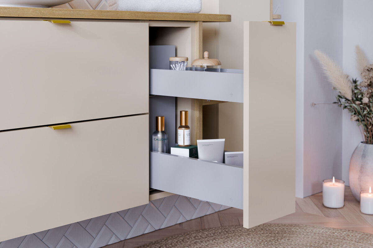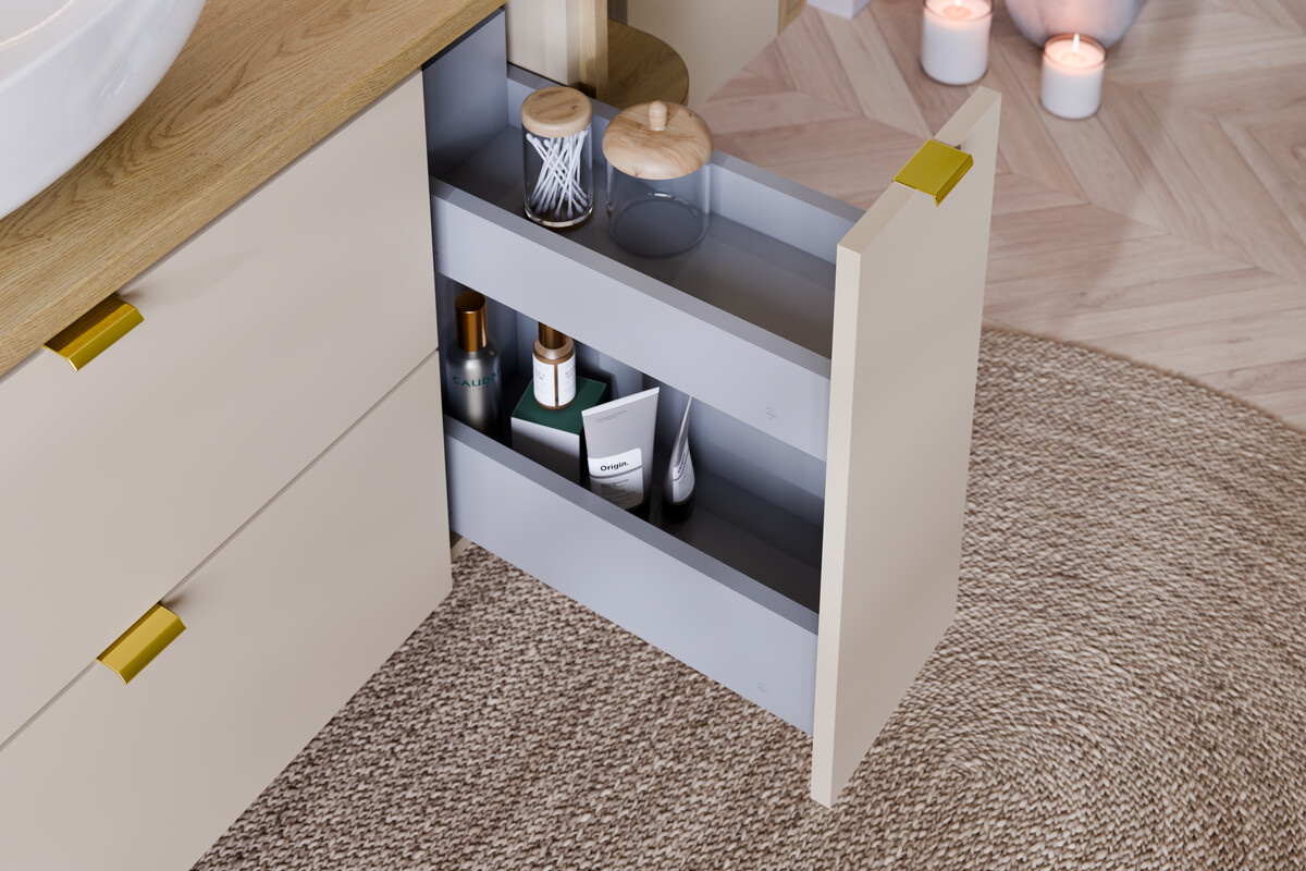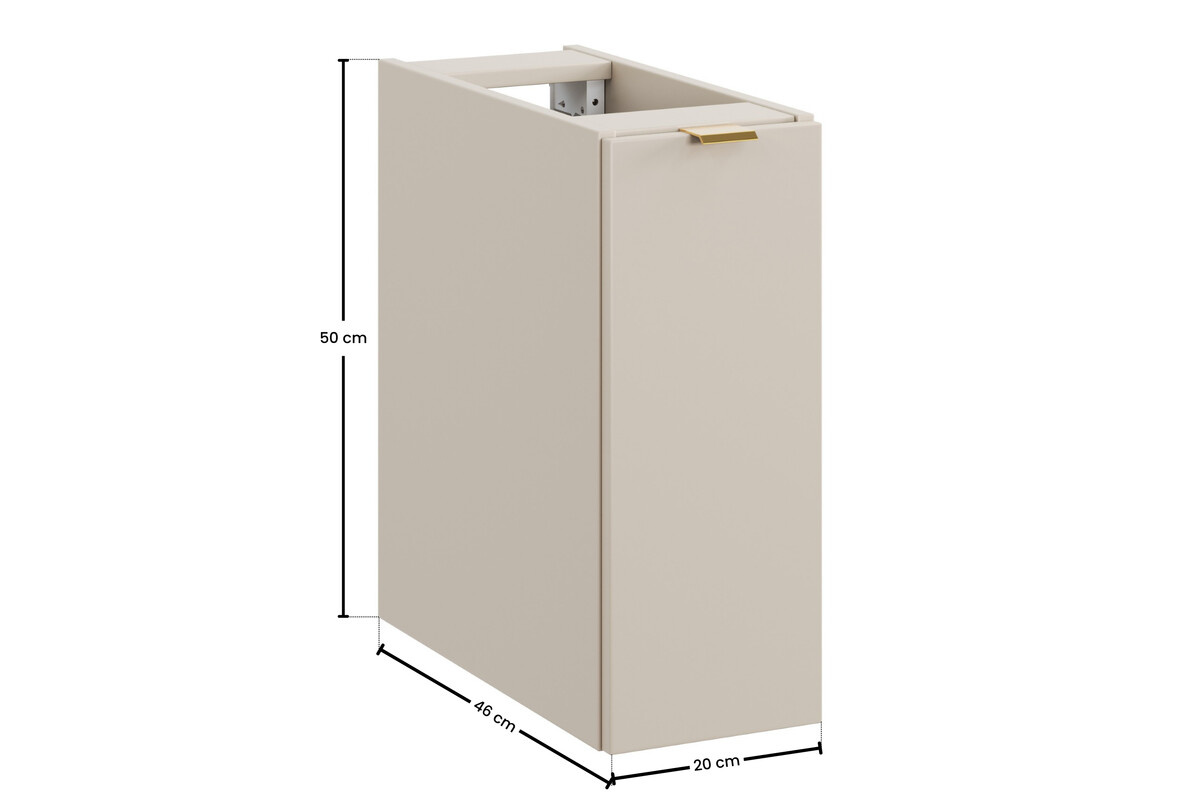 Dalia Cashmere Cargo Wall-Hung Cabinet 20 cm, 1 Door. The Dalia Cashmere cabinet is a minimalist piece of furniture in a cashmere color that brings warmth to the interior. Equipped with two levels of storage and a soft-close system, it’s the perfect solution for the bathroom. Personalized handles in three colors add style! Dimensions: Width (cm): 20 Depth (cm): 46 Height (cm): 50 Weight (kg): 12.8 Technical data: Front material: laminated board Body material: laminated board Front color: Matte cashmere Body color: Matte cashmere Handle material: Plastic Handle color: Package – Gold Gloss, Black Matt, Chrome Gloss Hinges: Soft closing Laundry basket included: Yes Indoor installation method: For hanging on the wall Mounting package included: Yes Assembly: For self-assembly Take your interior to a new dimension of elegance with the Dalia Cashmere cabinet from the Comad brand. This lower wall-mounted cabinet, measuring 20 cm wide, 50 cm high, and 46 cm deep, is the perfect solution for those who want to utilize every inch of space in their bathroom, kitchen, or hallway. Its smooth, minimalist cashmere-colored fronts will bring a feeling of warmth and harmony to any room, creating comfort zones in your home. The Dalia Cashmere cabinet is not only aesthetically pleasing but also functional. Two levels of storage ensure small accessories and cleaning products are always within reach. Its slim design fits perfectly into smaller spaces, giving them a modern and well-maintained look. The solid laminated board construction ensures long-lasting use, and every detail is meticulously finished, guaranteeing high quality and style. Offering a choice of three handle colors – glossy gold, glossy chrome, and matte black – the cabinet allows you to customize the look of the furniture to your individual preferences. It’s the perfect option for those who want to add a personal touch to their space while also appreciating modern and minimalist design. Additionally, the soft-close doors make using the cabinet incredibly comfortable and allow for a peaceful home life. Whether you’re decorating a space in a modern style or adding a classic accent, the Dalia Cashmere cabinet will meet all your expectations. It’s worth noting that the furniture is delivered in flats with a self-assembly kit, allowing for quick and easy integration of the new piece into your interior. Don’t waste time on a long search, choose Dalia and enjoy the harmony of design and functionality in your home!