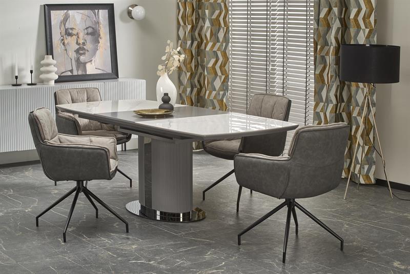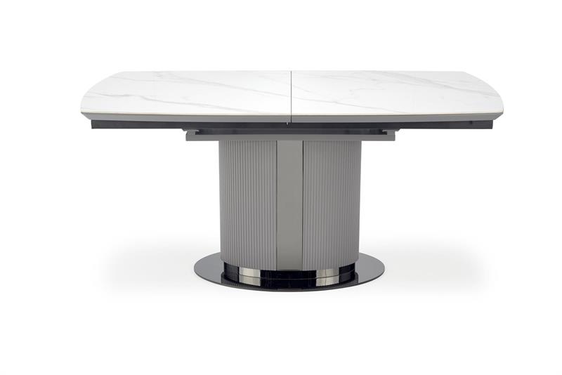 dimensions: 160-220/90/76 cm, extension table, material: ceramic / lacquered MDF / powder coated steel, color: top – white marble / grey, legs – light grey / black