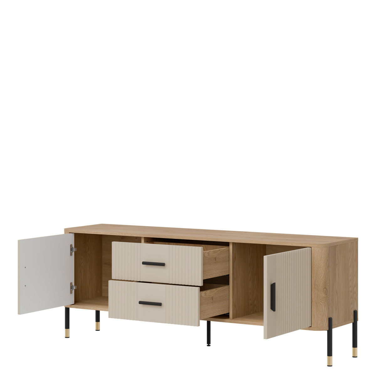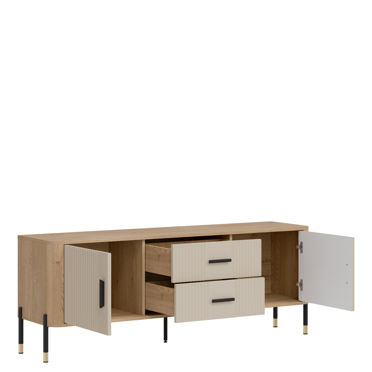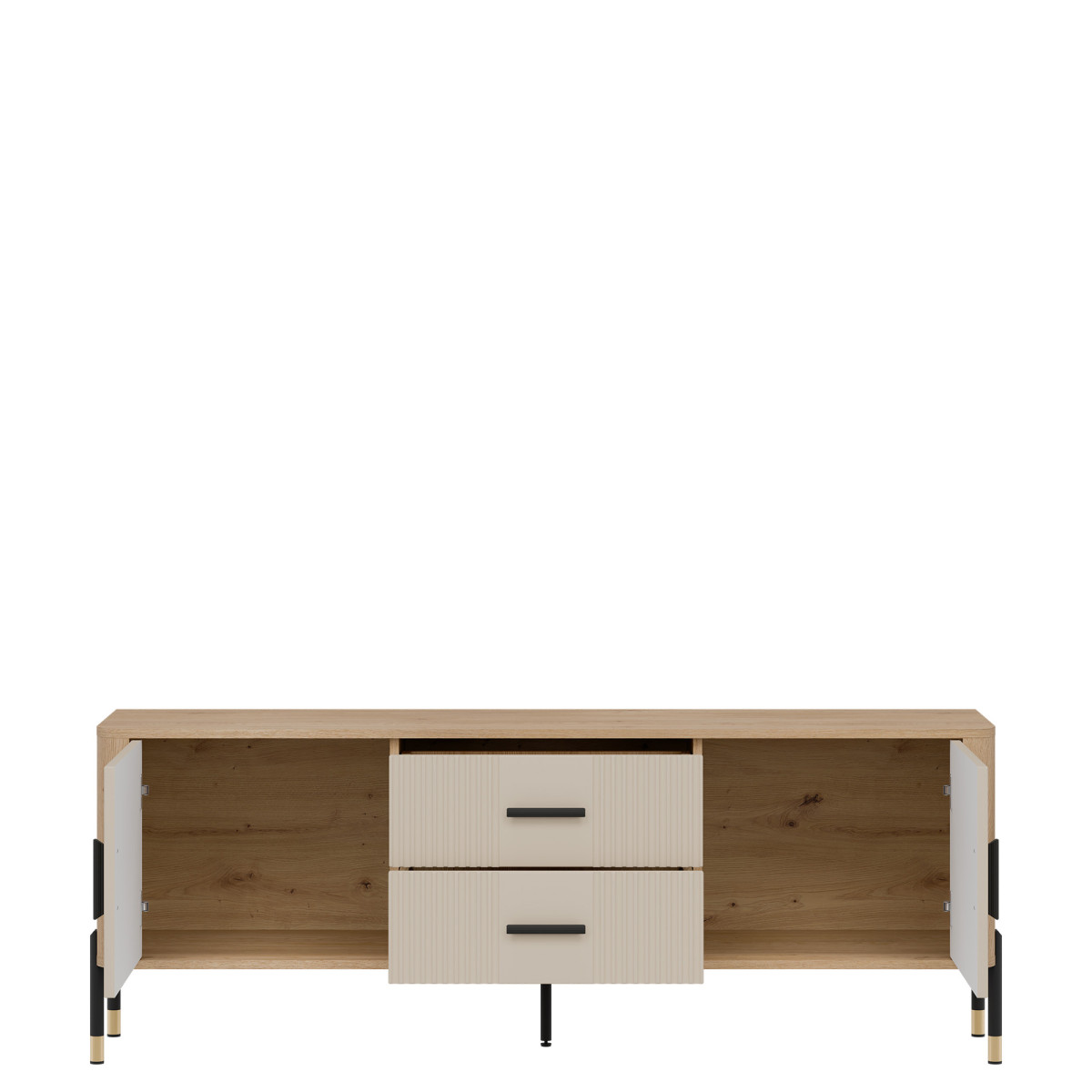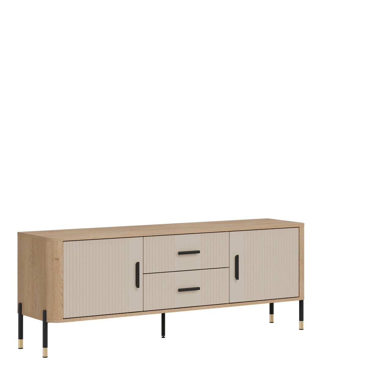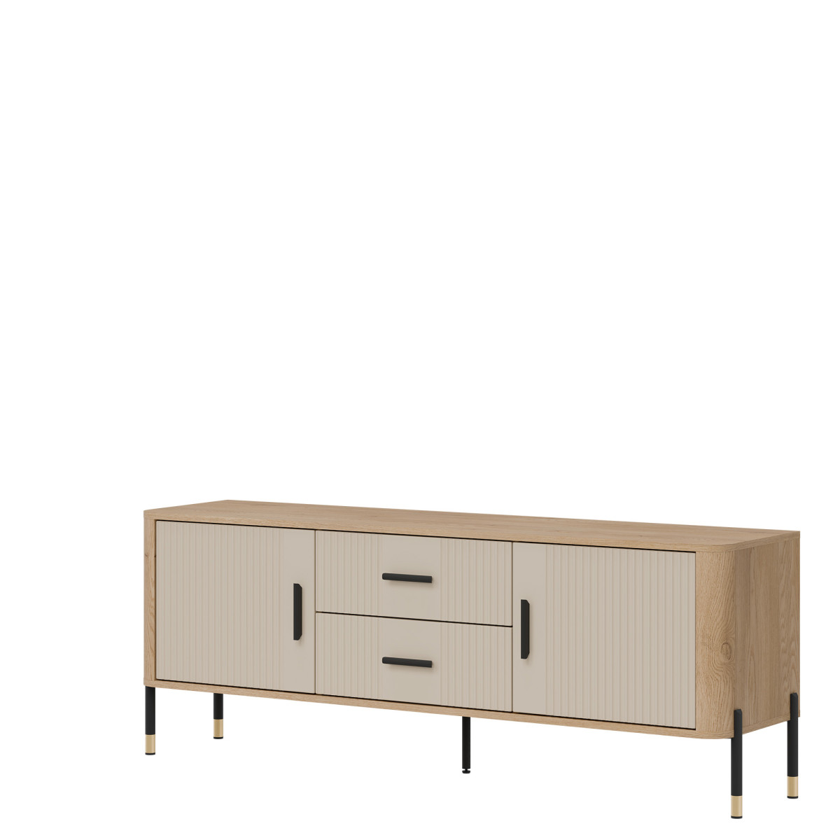 Dante DT01 TV Cabinet – Elegance in a modern twist. Bring harmony of style and functionality to your interior with the Dante DT01 cabinet. This piece of furniture delights not only with its design, but also with its practicality. The combination of natural oak decor with matte, grooved fronts in five color variants to choose from creates a unique contrast – subtle, yet expressive. Gold or black handles and details on the legs add elegance and lightness to the overall design, perfectly fitting into the atmosphere of modern, loft, and Scandinavian interiors. Product features: 4 spacious cabinets and 2 functional drawers – ideal for documents, textiles, or tableware, grooved fronts with a vertical pattern – a designer accent that catches the eye, solid construction on metal legs with a gold finish – stability and style in one, ergonomic, gold handles – comfort of use and a luxurious look. Perfect for the living room as an TV cabinet. Choose quality and style that transform the space. The DT01 TV cabinet is a perfect choice for people who value modern design with a touch of classic elegance.