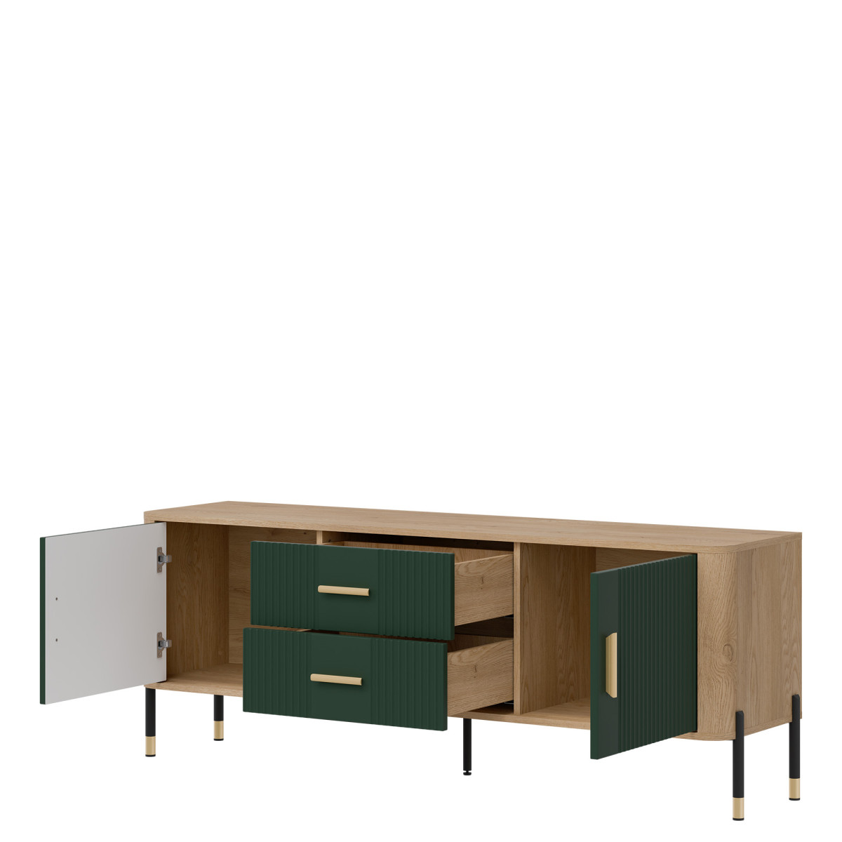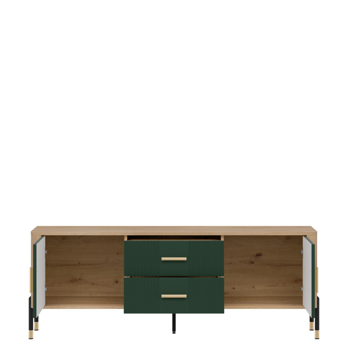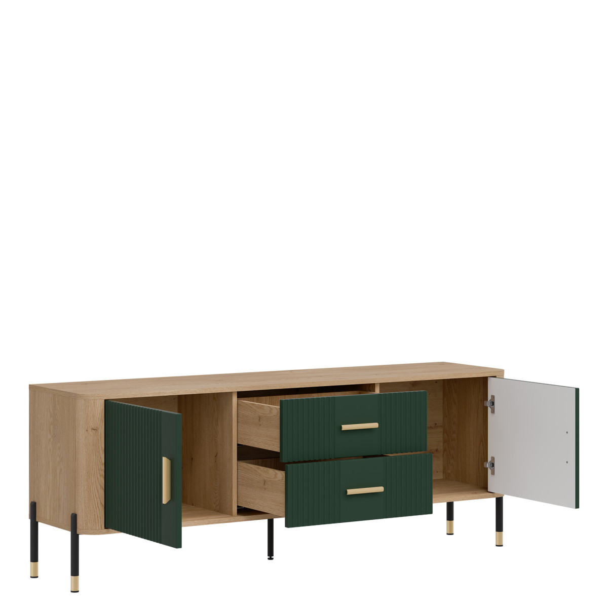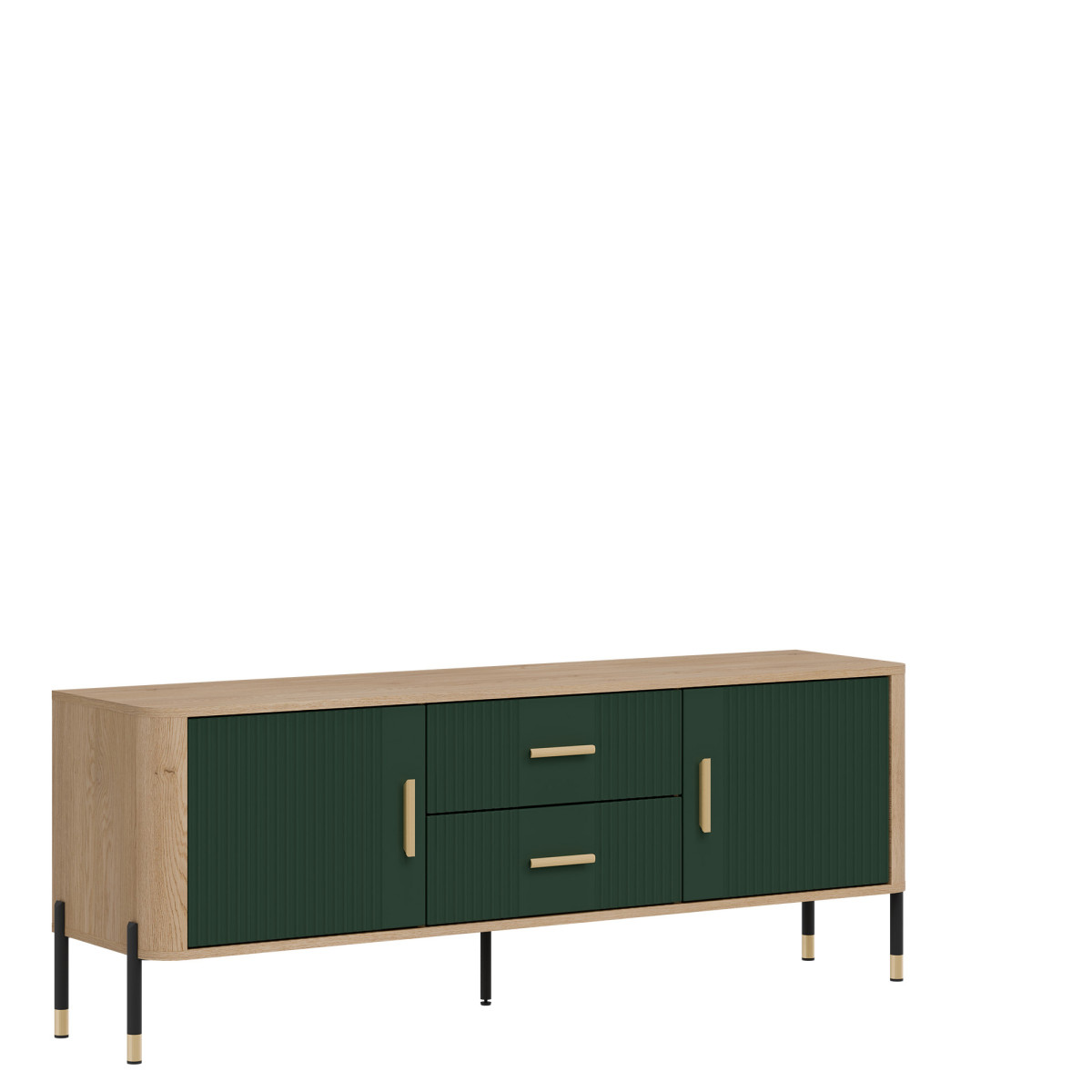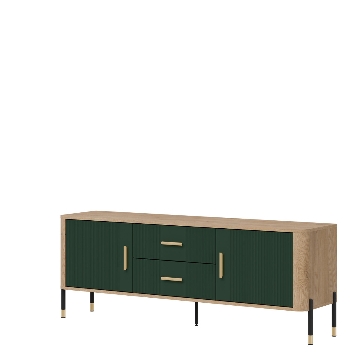 Dante DT01 TV Cabinet – Elegance in a modern twist. Bring harmony of style and functionality to your interior with the Dante DT01 cabinet. This piece of furniture delights not only with its design, but also with its practicality. The combination of natural oak decor with matte, grooved fronts in five color variants to choose from creates a unique contrast – subtle, yet expressive. Gold or black handles and details on the legs add elegance and lightness to the overall design, perfectly fitting into the atmosphere of modern, loft, and Scandinavian interiors. Product features: 4 spacious cabinets and 2 functional drawers – ideal for documents, textiles, or tableware, grooved fronts with a vertical pattern – a designer accent that catches the eye, solid construction on metal legs with a gold finish – stability and style in one, ergonomic, gold handles – comfort of use and a luxurious look. Perfect for the living room as an TV cabinet. Choose quality and style that transform the space. The DT01 TV cabinet is a perfect choice for people who value modern design with a touch of classic elegance.