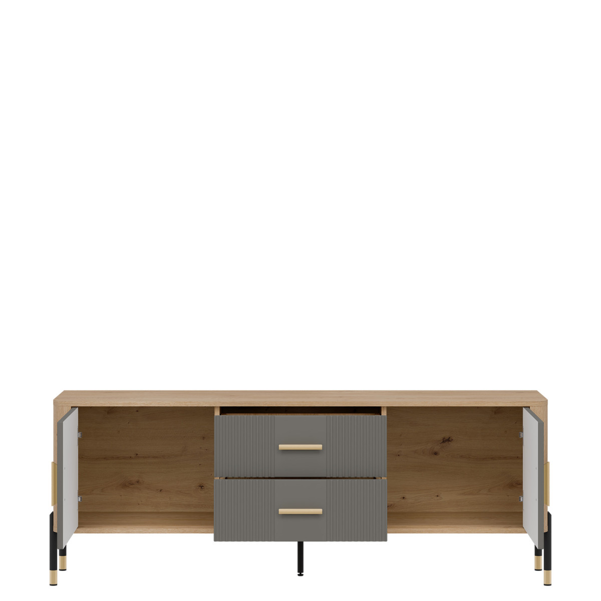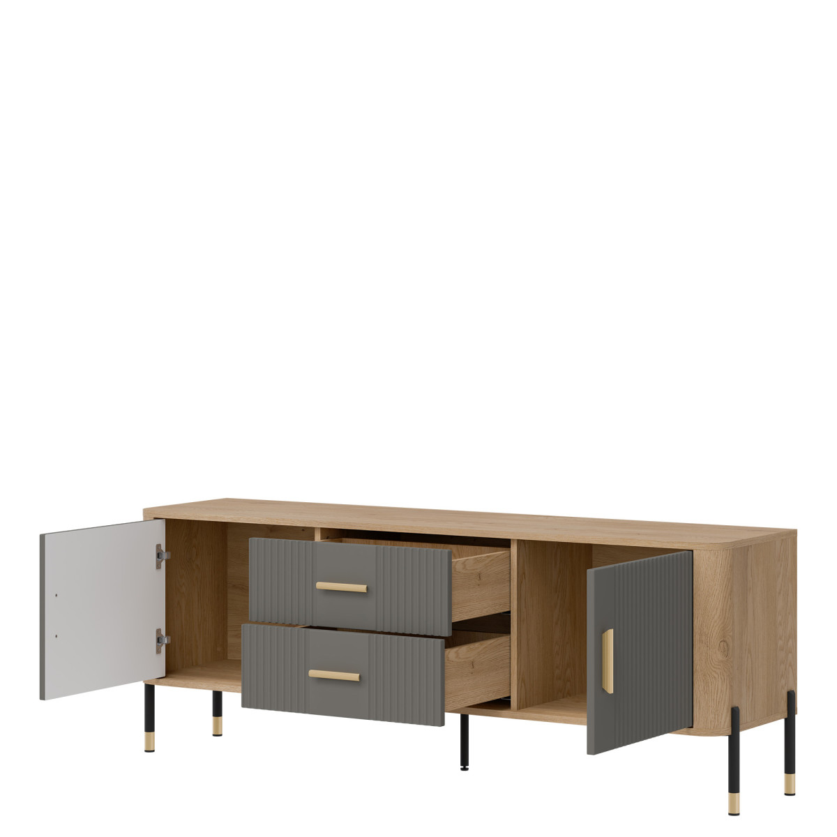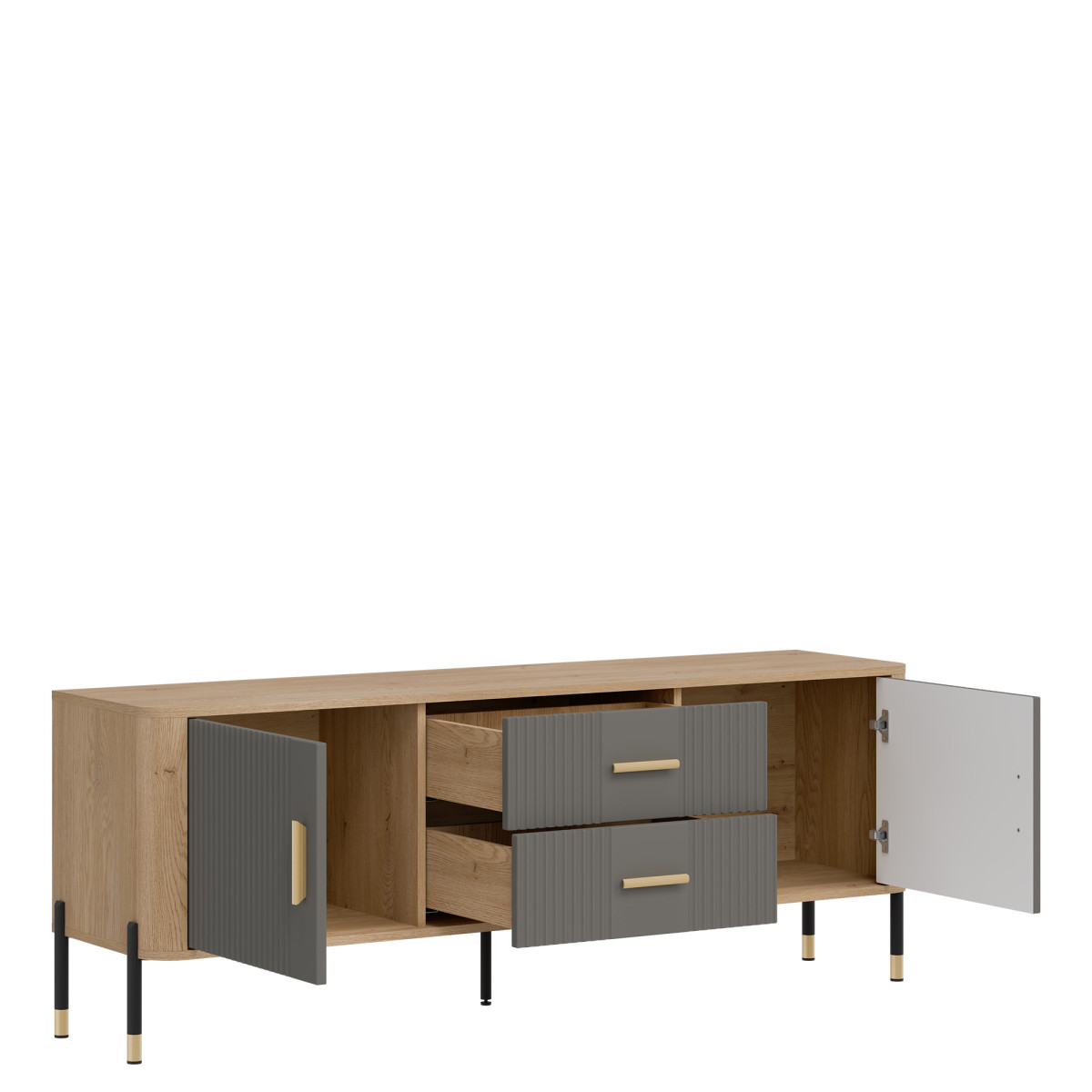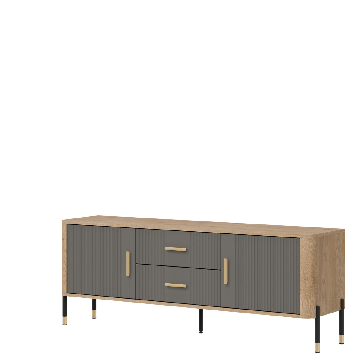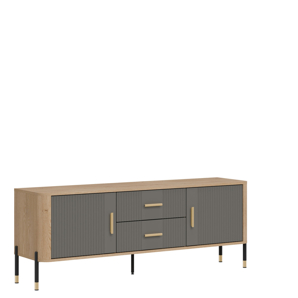 Dante DT01 TV Cabinet – Elegance in a modern twist. Bring harmony of style and functionality to your interior with the Dante DT01 cabinet. This piece of furniture delights not only with its design, but also with its practicality. The combination of natural oak decor with matte, grooved fronts in five color variants to choose from creates a unique contrast – subtle, yet expressive. Gold or black handles and details on the legs add elegance and lightness to the overall design, perfectly fitting into the atmosphere of modern, loft, and Scandinavian interiors. Product features: 4 spacious cabinets and 2 functional drawers – ideal for documents, textiles, or tableware, grooved fronts with a vertical pattern – a designer accent that catches the eye, solid construction on metal legs with a gold finish – stability and style in one, ergonomic, gold handles – comfort of use and a luxurious look. Perfect for the living room as an TV cabinet. Choose quality and style that transform the space. The DT01 TV cabinet is a perfect choice for people who value modern design with a touch of classic elegance.