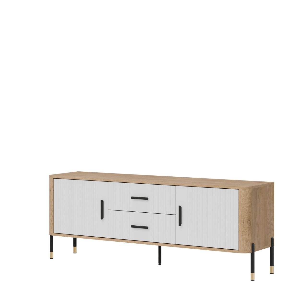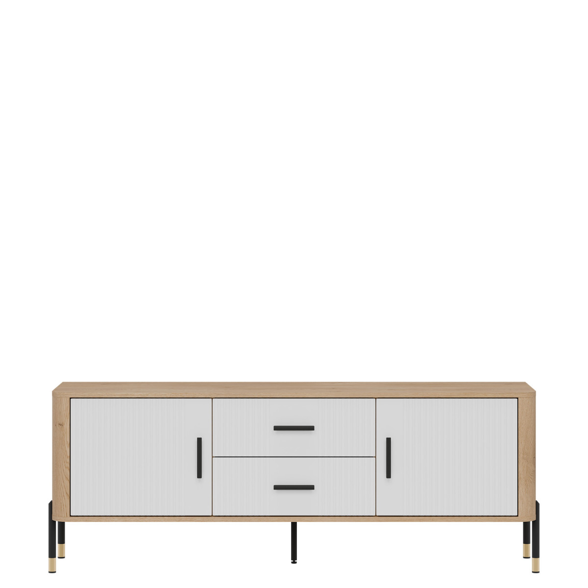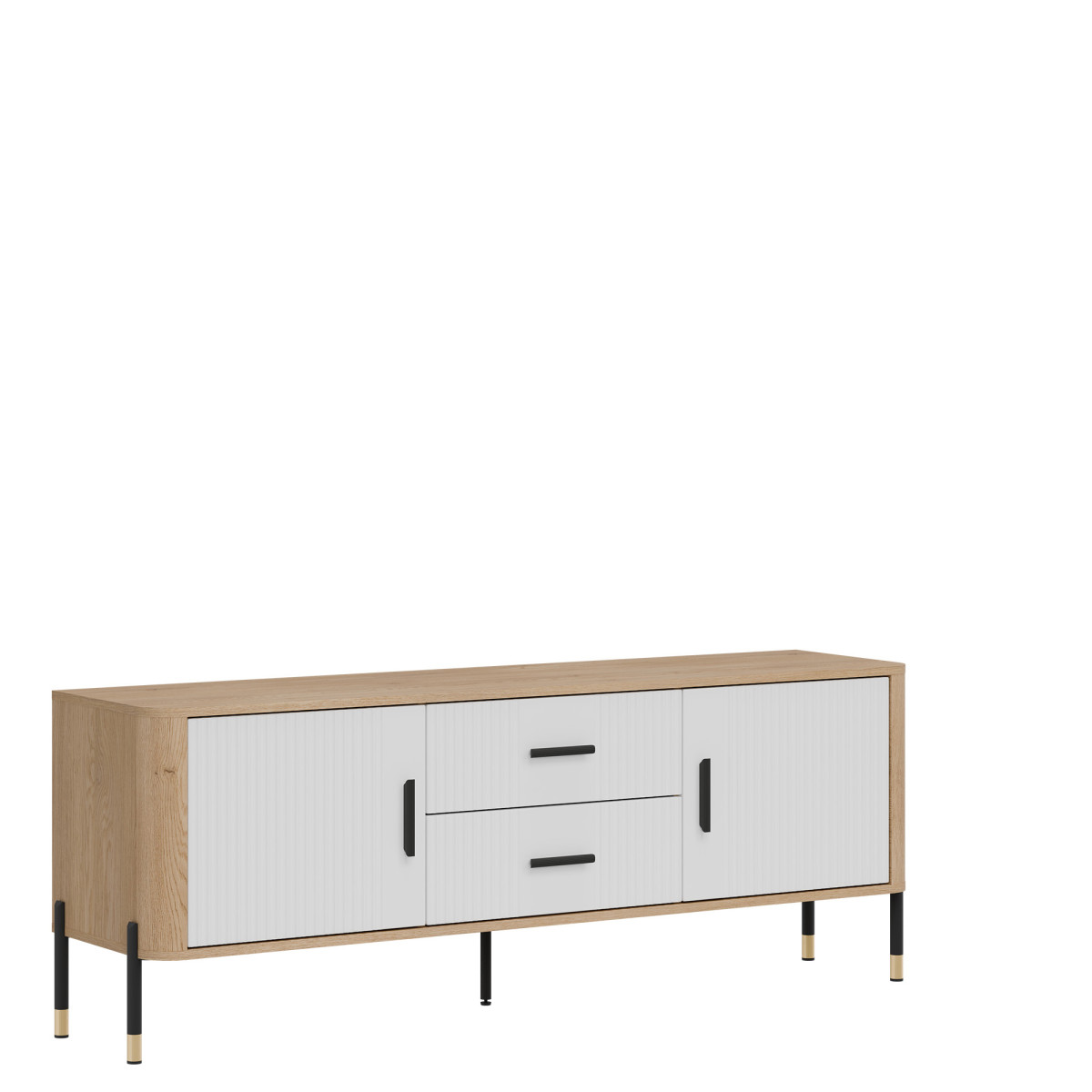 Dante DT01 TV Cabinet – Elegance in a modern twist. Bring harmony of style and functionality to your interior with the Dante DT01 cabinet. This piece of furniture delights not only with its design, but also with its practicality. The combination of natural oak decor with matte, grooved fronts in five color variants to choose from creates a unique contrast – subtle, yet expressive. Gold or black handles and details on the legs add elegance and lightness to the overall design, perfectly fitting into the atmosphere of modern, loft, and Scandinavian interiors. Product features: 4 spacious cabinets and 2 functional drawers – ideal for documents, textiles, or tableware, grooved fronts with a vertical pattern – a designer accent that catches the eye, solid construction on metal legs with a gold finish – stability and style in one, ergonomic, gold handles – comfort of use and a luxurious look. Perfect for the living room as an TV cabinet. Choose quality and style that transform the space. The DT01 TV cabinet is a perfect choice for people who value modern design with a touch of classic elegance.