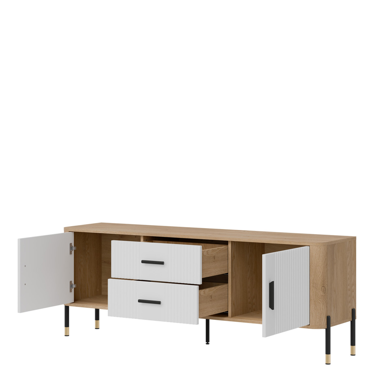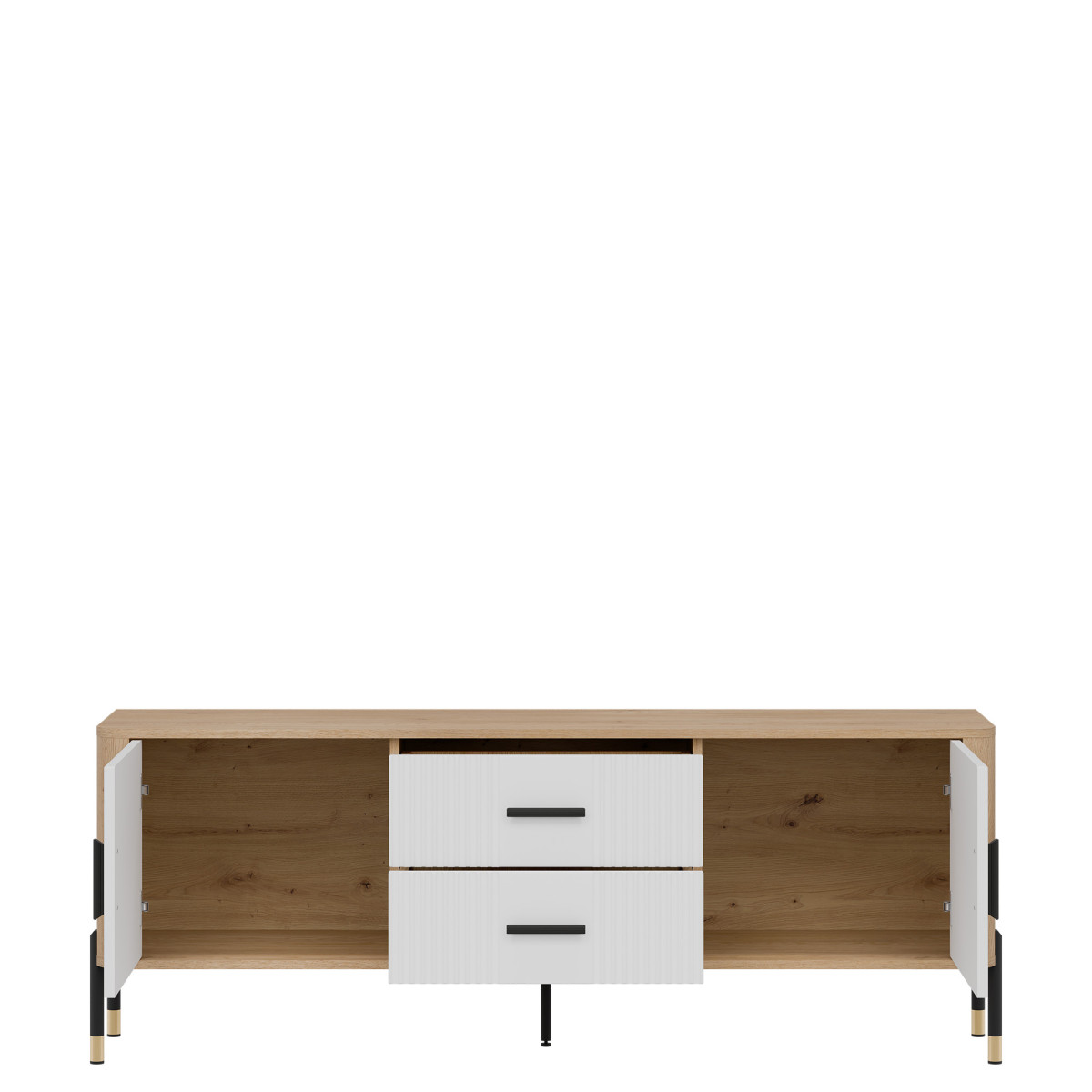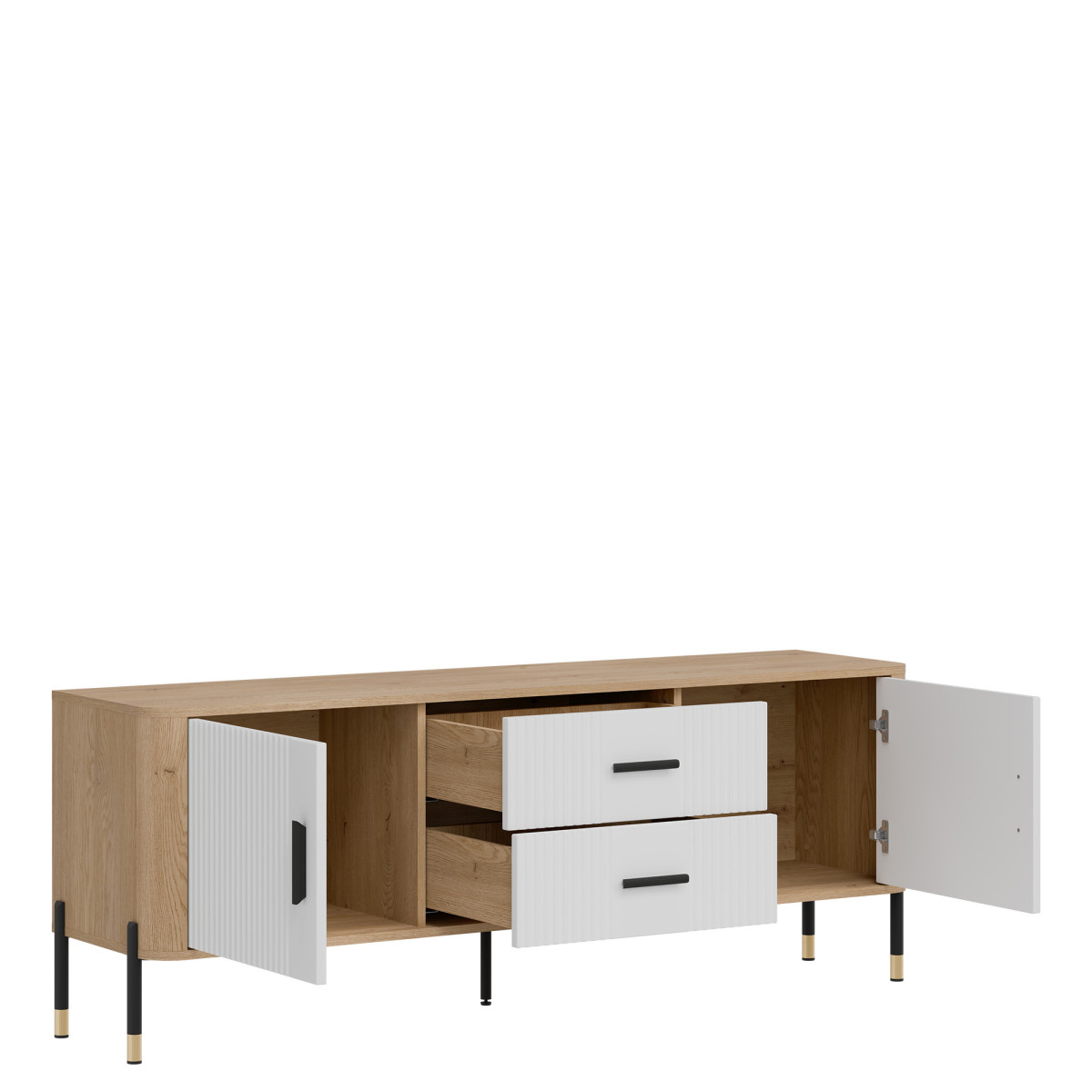Dante DT01 TV Cabinet – Elegance in a modern twist. Bring harmony of style and functionality to your interior with the Dante DT01 cabinet. This piece of furniture delights not only with its design, but also with its practicality. The combination of natural oak decor with matte, grooved fronts in five color variants to choose from creates a unique contrast – subtle, yet expressive. Gold or black handles and details on the legs add elegance and lightness to the overall design, perfectly fitting into the atmosphere of modern, loft, and Scandinavian interiors. Product features: 4 spacious cabinets and 2 functional drawers – ideal for documents, textiles, or tableware, grooved fronts with a vertical pattern – a designer accent that catches the eye, solid construction on metal legs with a gold finish – stability and style in one, ergonomic, gold handles – comfort of use and a luxurious look. Perfect for the living room as an TV cabinet. Choose quality and style that transform the space. The DT01 TV cabinet is a perfect choice for people who value modern design with a touch of classic elegance.