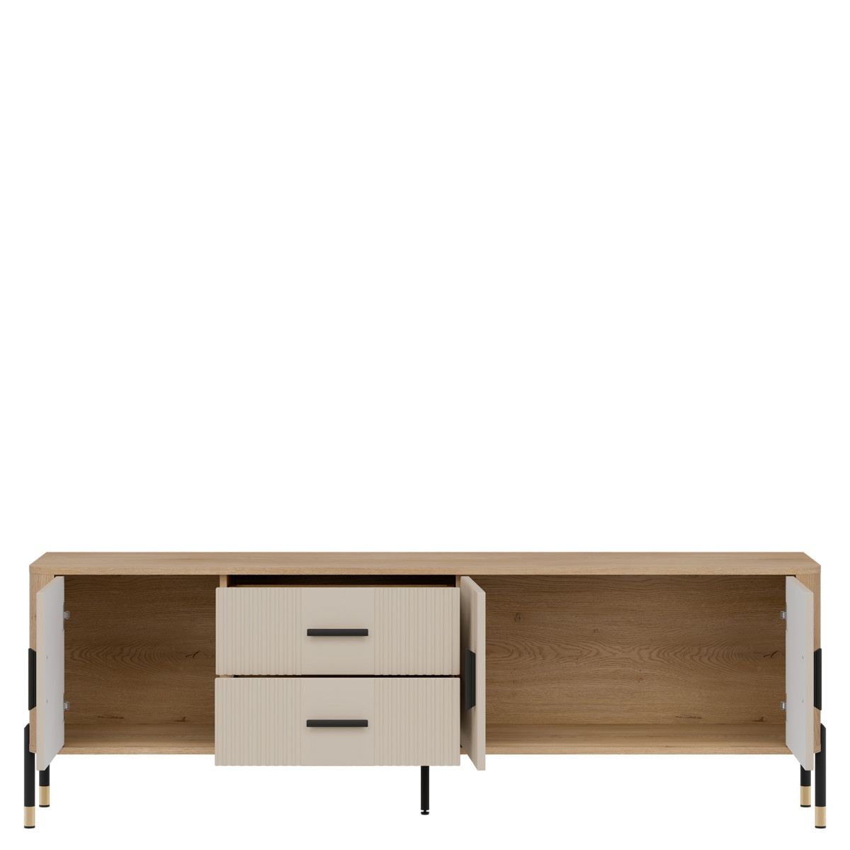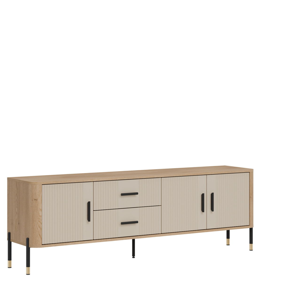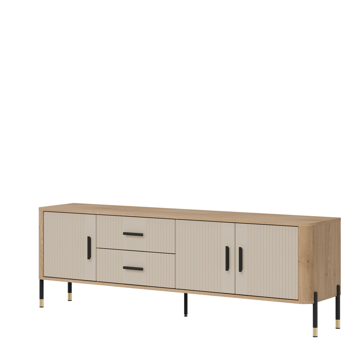 Dante DT02 TV Stand – Modern form, timeless style. Be enchanted by the elegance and functionality of the DT02 TV stand, which perfectly combines simple form with refined details. Its elongated design makes it ideal as a stylish TV stand. The combination of grooved fronts, available in five color variants, with a wood-like body in a natural oak shade creates an aesthetic of modern luxury. Gold or black handles and subtle leg finishes complement the design, giving the piece an elegant character. Distinguishing features: Four door cabinets and two central drawers – perfect for storage, grooved fronts – a designer detail emphasizing the furniture’s character, stable metal legs with decorative gold tips, stylish gold or black handles – a premium accent. Perfect for: Modern and industrial interiors, Living room as an TV stand. The Dante DT02 TV cabinet is not just a piece of furniture – it is an interior decoration that combines modern design with everyday practicality.