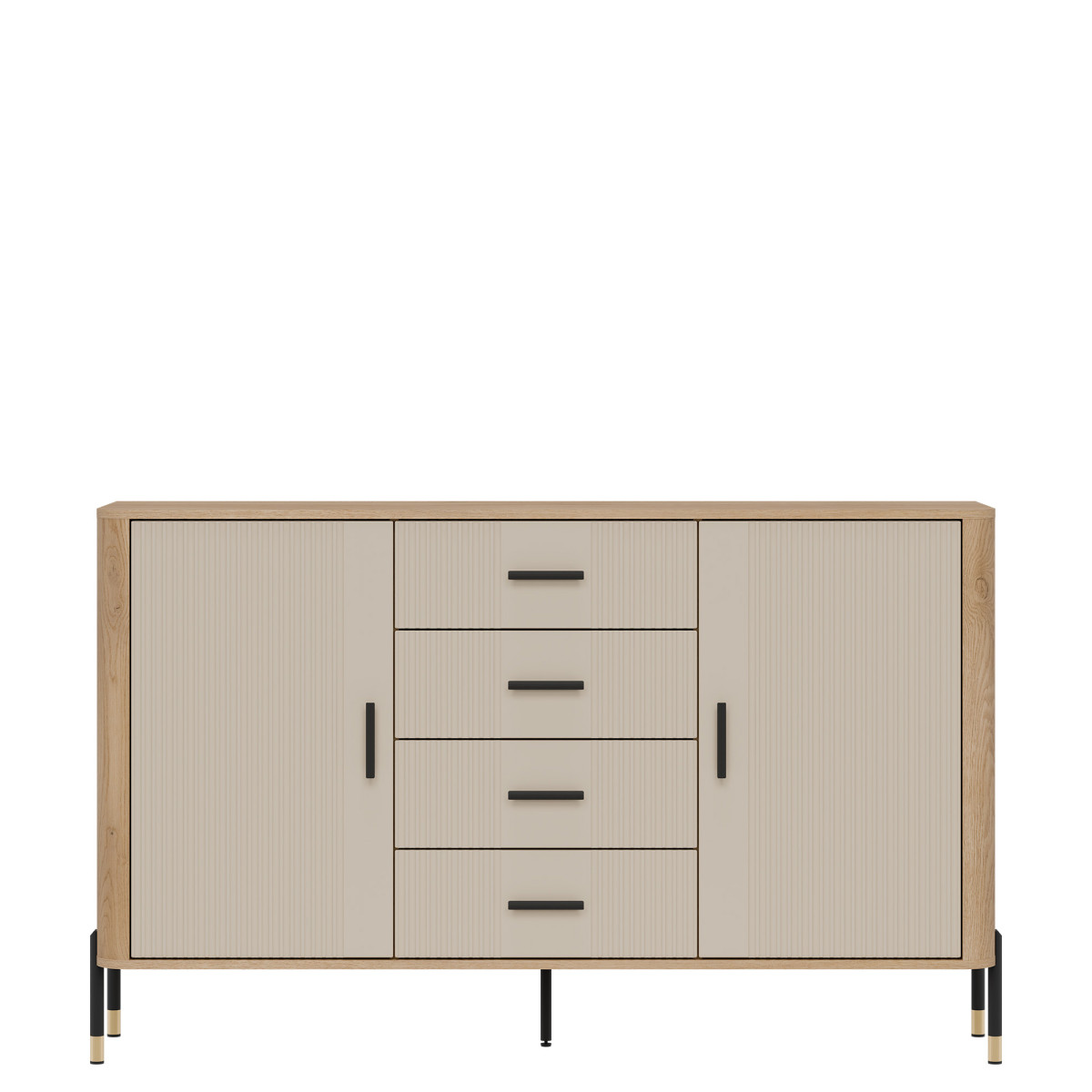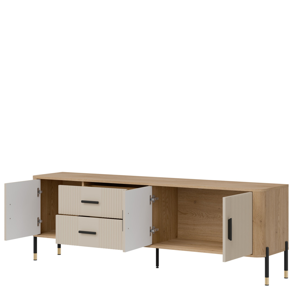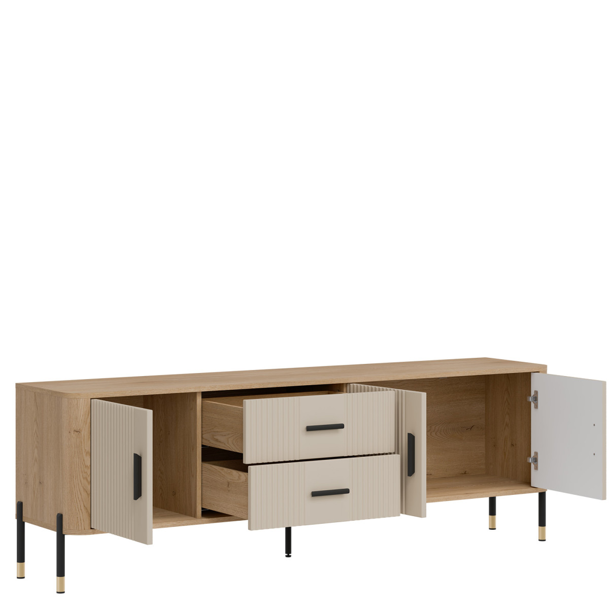 Dante DT02 TV Stand – Modern form, timeless style. Be enchanted by the elegance and functionality of the DT02 TV stand, which perfectly combines simple form with refined details. Its elongated design makes it ideal as a stylish TV stand. The combination of grooved fronts, available in five color variants, with a wood-like body in a natural oak shade creates an aesthetic of modern luxury. Gold or black handles and subtle leg finishes complement the design, giving the piece an elegant character. Distinguishing features: Four door cabinets and two central drawers – perfect for storage, grooved fronts – a designer detail emphasizing the furniture’s character, stable metal legs with decorative gold tips, stylish gold or black handles – a premium accent. Perfect for: Modern and industrial interiors, Living room as an TV stand. The Dante DT02 TV cabinet is not just a piece of furniture – it is an interior decoration that combines modern design with everyday practicality.