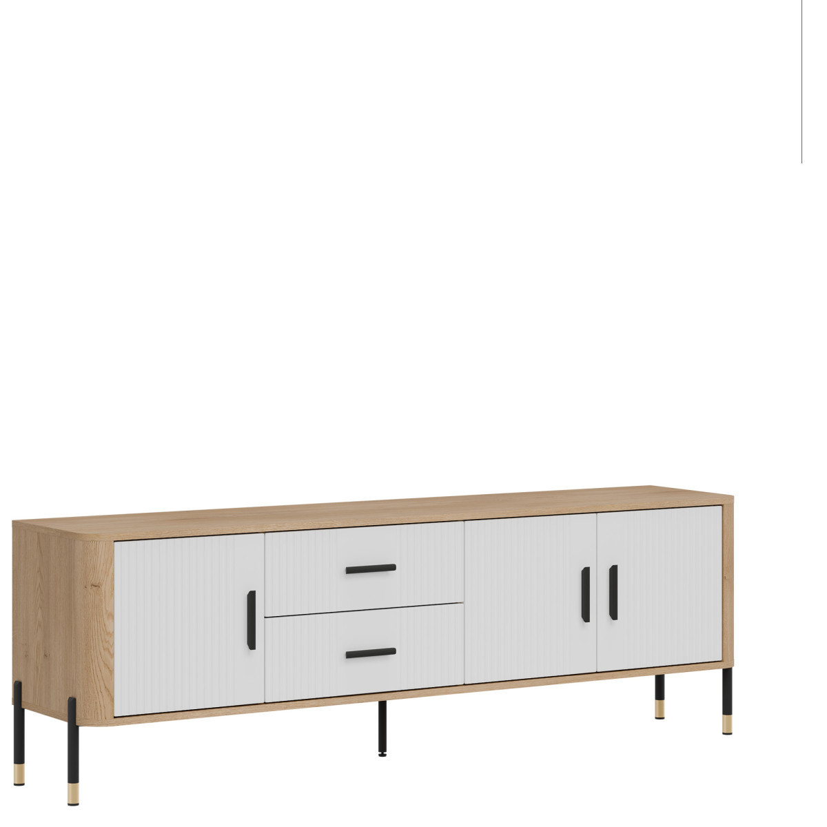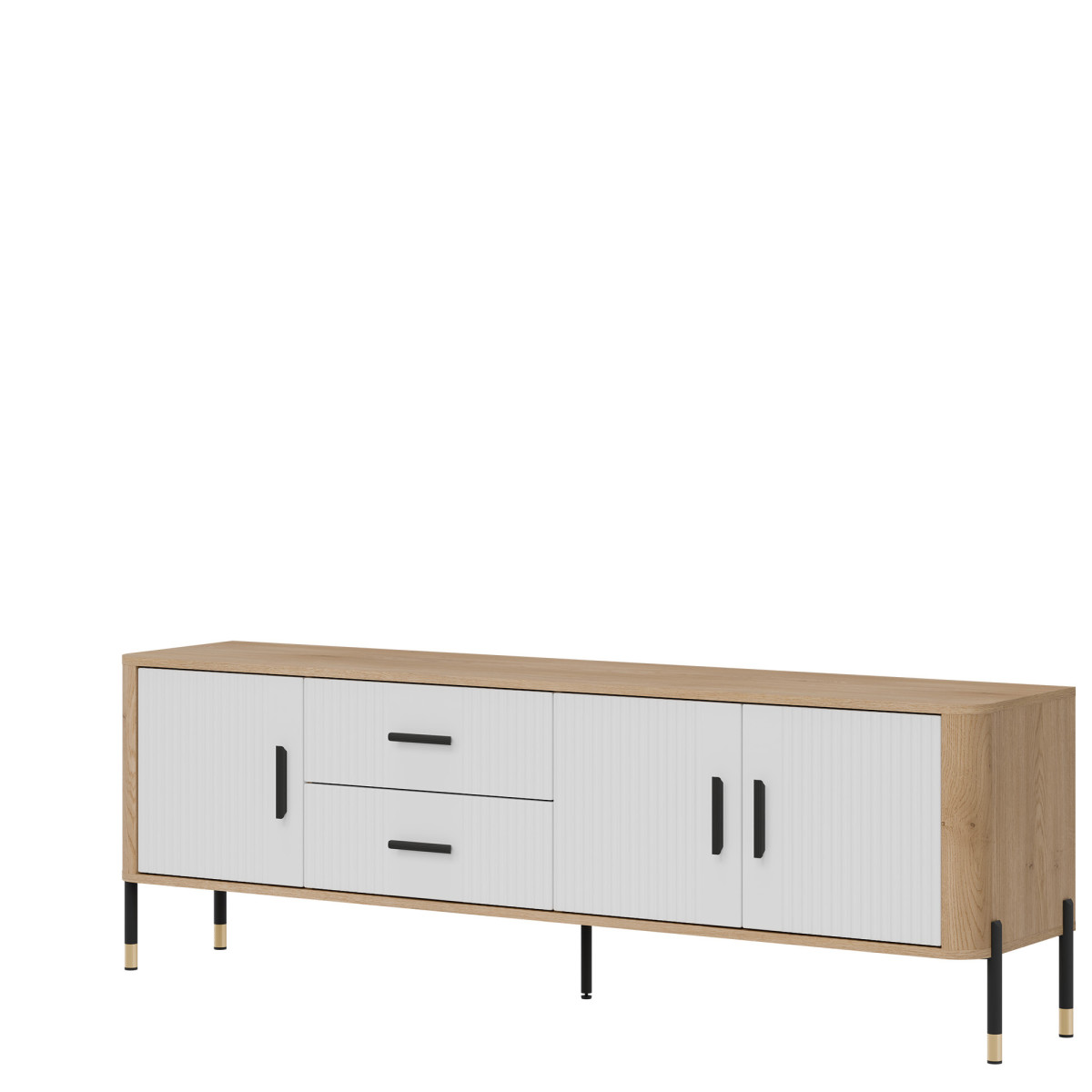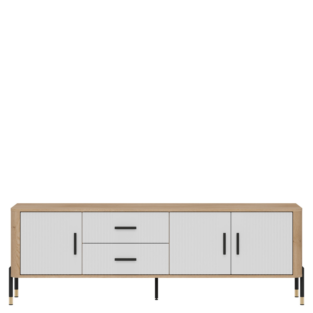 Dante DT02 TV Stand – Modern form, timeless style. Be enchanted by the elegance and functionality of the DT02 TV stand, which perfectly combines simple form with refined details. Its elongated design makes it ideal as a stylish TV stand. The combination of grooved fronts, available in five color variants, with a wood-like body in a natural oak shade creates an aesthetic of modern luxury. Gold or black handles and subtle leg finishes complement the design, giving the piece an elegant character. Distinguishing features: Four door cabinets and two central drawers – perfect for storage, grooved fronts – a designer detail emphasizing the furniture’s character, stable metal legs with decorative gold tips, stylish gold or black handles – a premium accent. Perfect for: Modern and industrial interiors, Living room as an TV stand. The Dante DT02 TV cabinet is not just a piece of furniture – it is an interior decoration that combines modern design with everyday practicality.