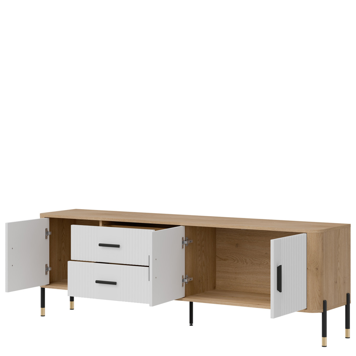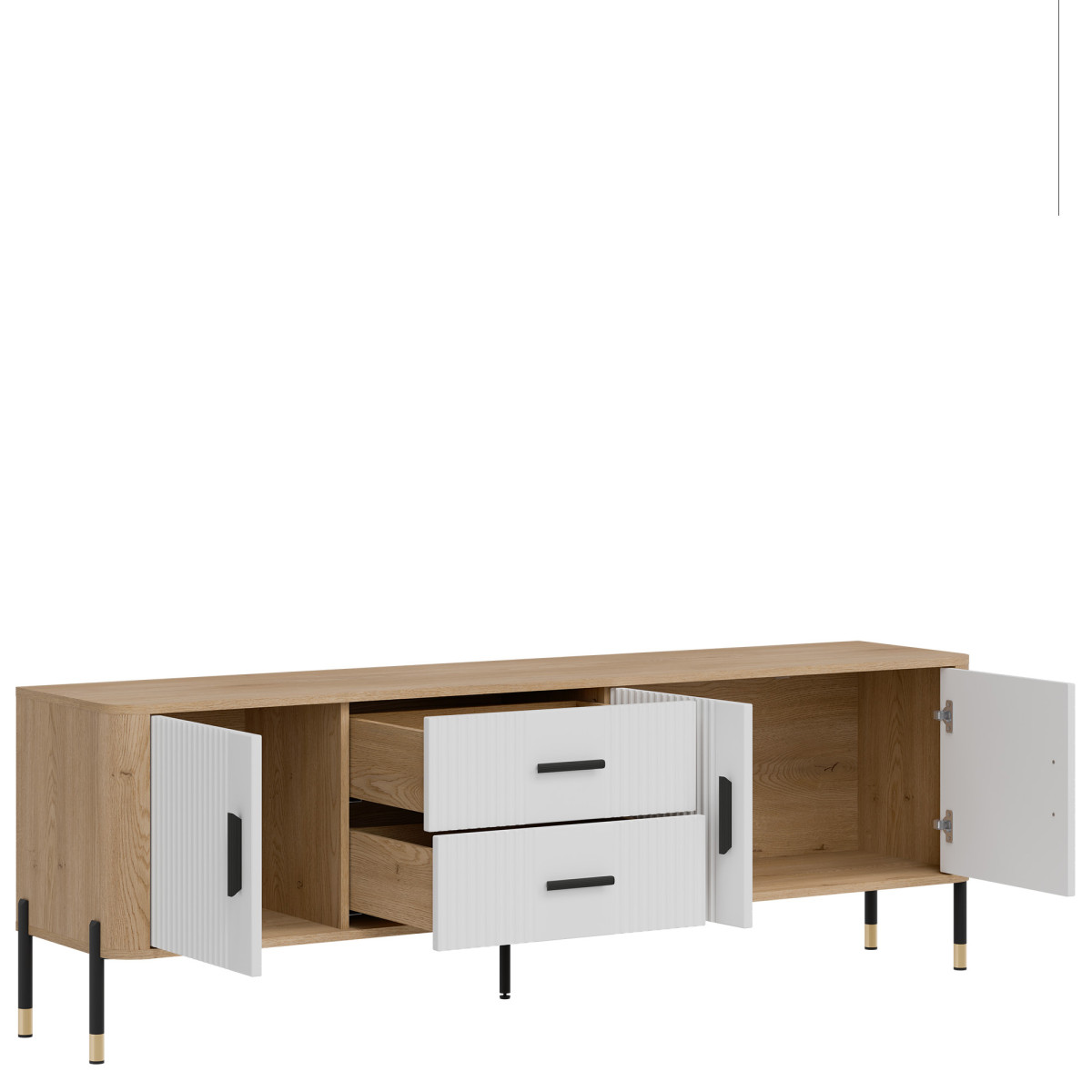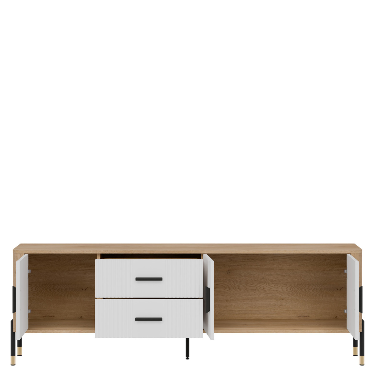 Dante DT02 TV Stand – Modern form, timeless style. Be enchanted by the elegance and functionality of the DT02 TV stand, which perfectly combines simple form with refined details. Its elongated design makes it ideal as a stylish TV stand. The combination of grooved fronts, available in five color variants, with a wood-like body in a natural oak shade creates an aesthetic of modern luxury. Gold or black handles and subtle leg finishes complement the design, giving the piece an elegant character. Distinguishing features: Four door cabinets and two central drawers – perfect for storage, grooved fronts – a designer detail emphasizing the furniture’s character, stable metal legs with decorative gold tips, stylish gold or black handles – a premium accent. Perfect for: Modern and industrial interiors, Living room as an TV stand. The Dante DT02 TV cabinet is not just a piece of furniture – it is an interior decoration that combines modern design with everyday practicality.