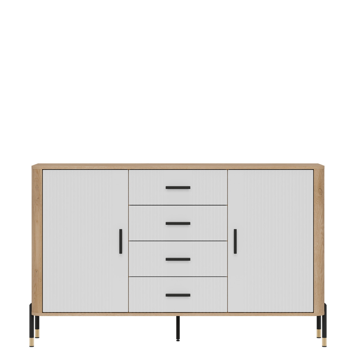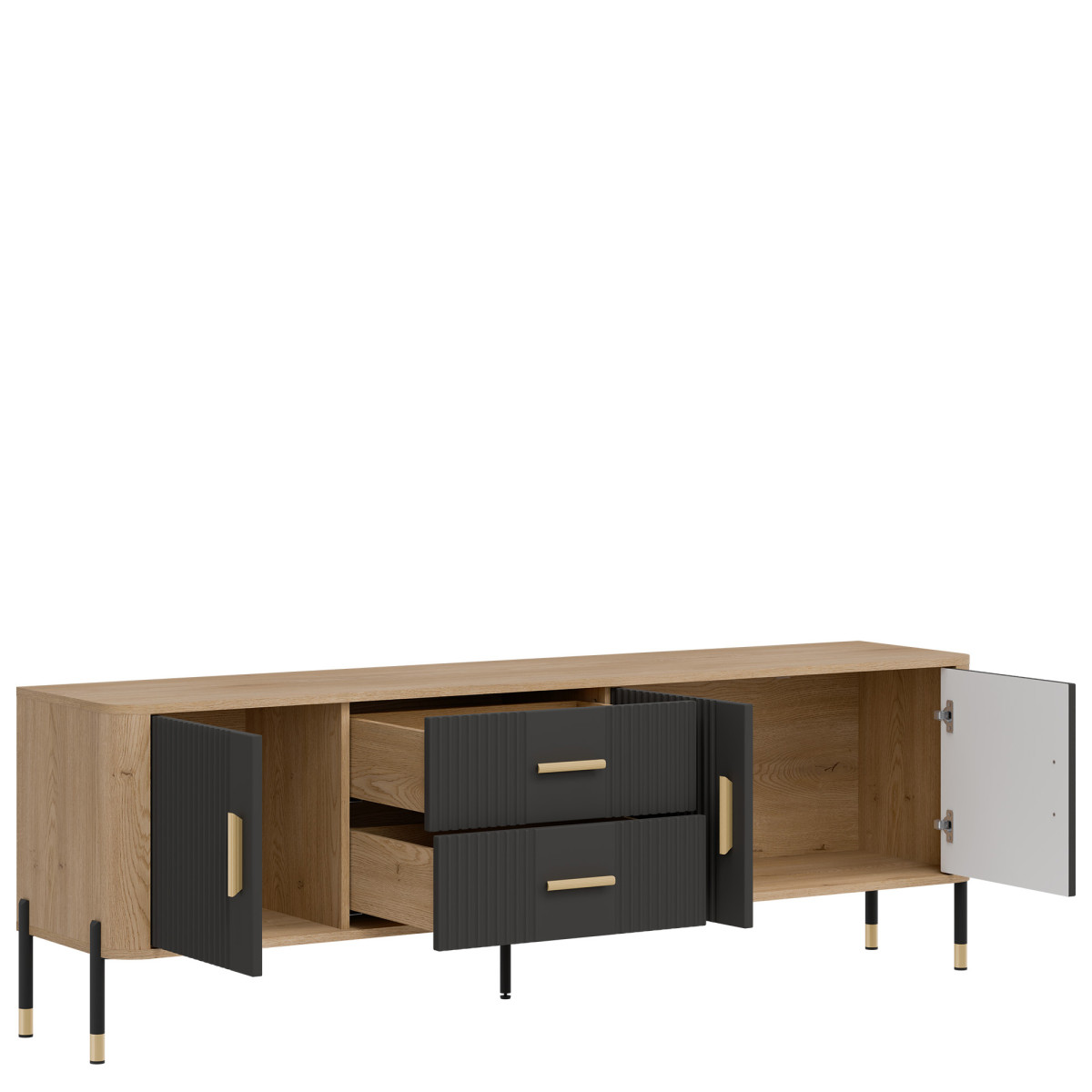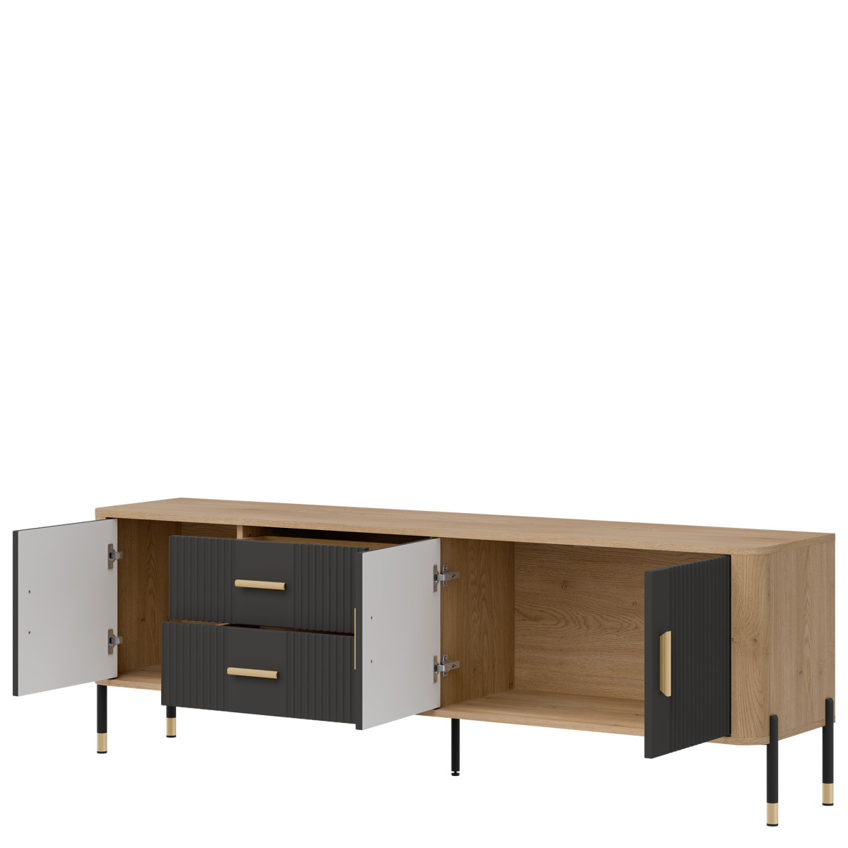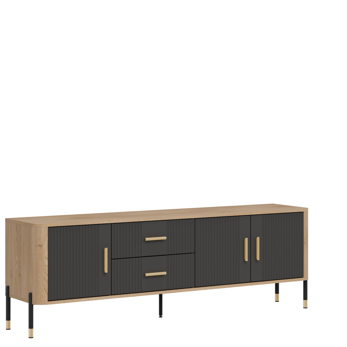 Dante DT02 TV Stand – Modern form, timeless style. Be enchanted by the elegance and functionality of the DT02 TV stand, which perfectly combines simple form with refined details. Its elongated design makes it ideal as a stylish TV stand. The combination of grooved fronts, available in five color variants, with a wood-like body in a natural oak shade creates an aesthetic of modern luxury. Gold or black handles and subtle leg finishes complement the design, giving the piece an elegant character. Distinguishing features: Four door cabinets and two central drawers – perfect for storage, grooved fronts – a designer detail emphasizing the furniture’s character, stable metal legs with decorative gold tips, stylish gold or black handles – a premium accent. Perfect for: Modern and industrial interiors, Living room as an TV stand. The Dante DT02 TV cabinet is not just a piece of furniture – it is an interior decoration that combines modern design with everyday practicality.