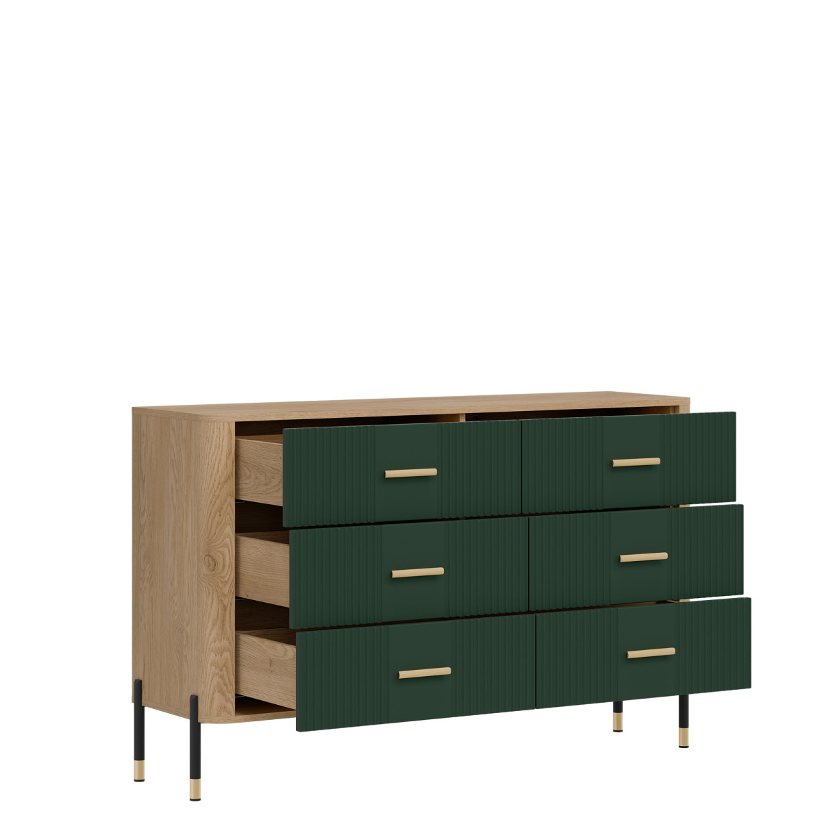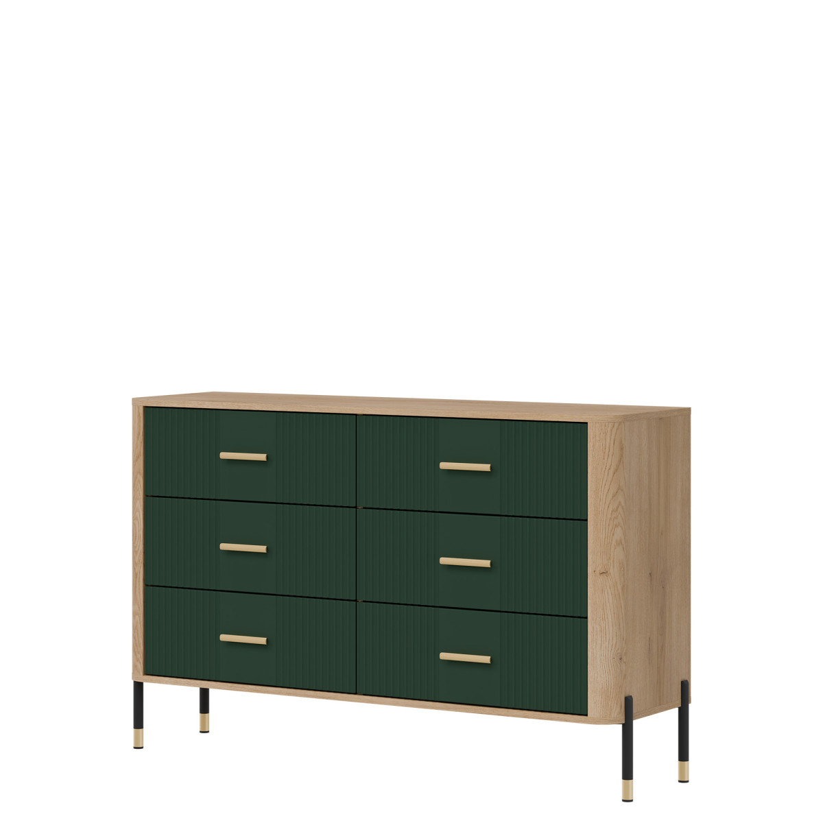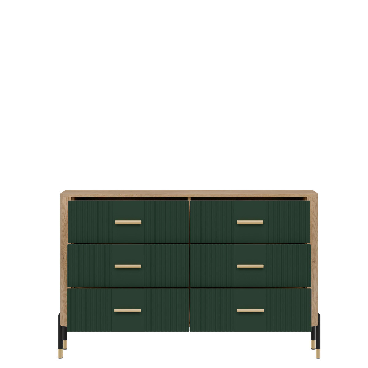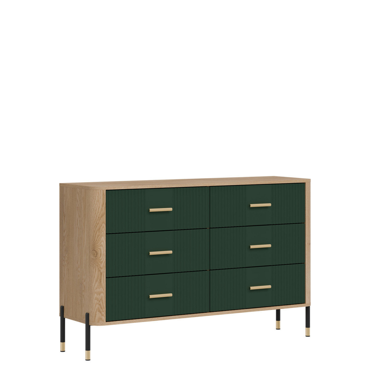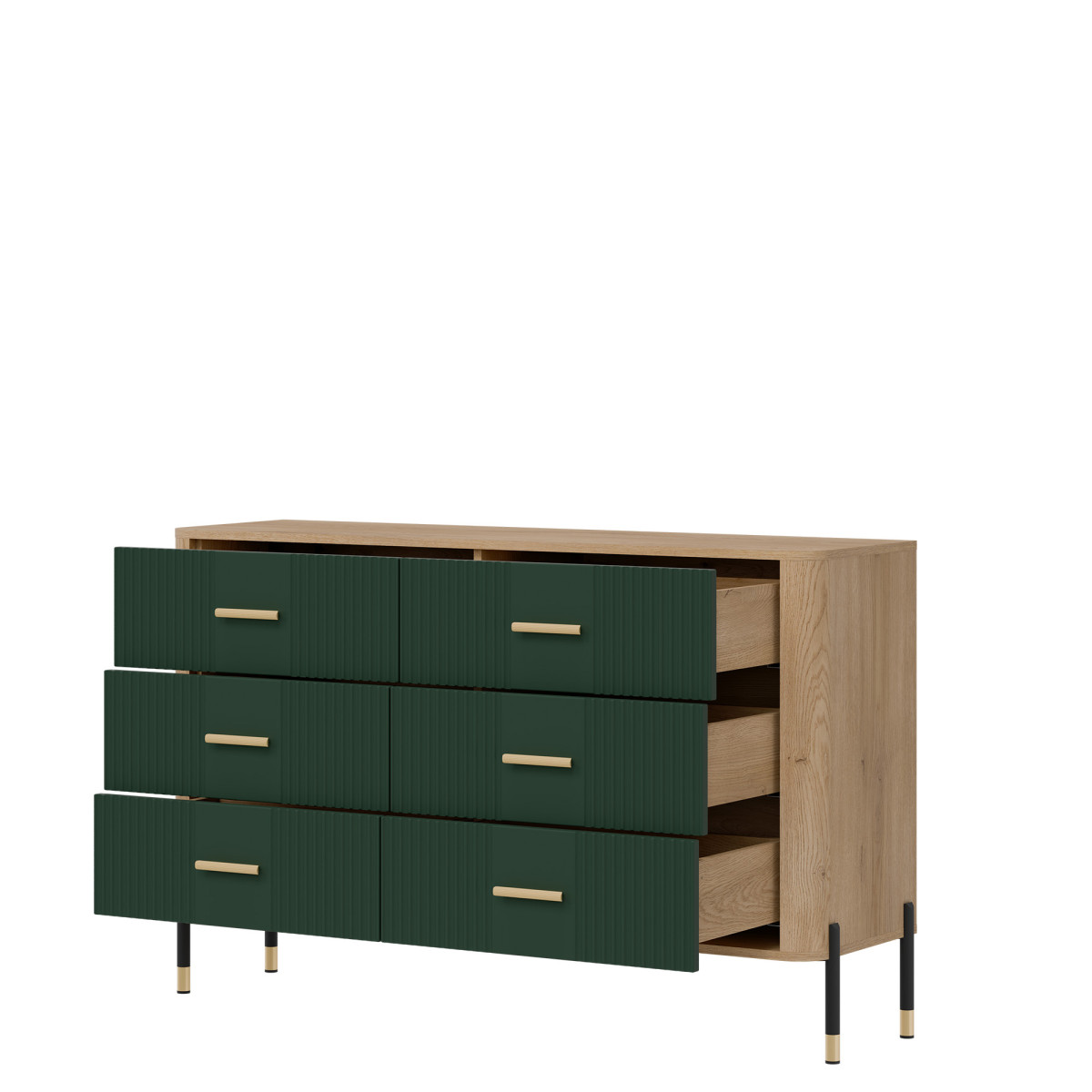 Width 140.5 cm Depth 40 cm Height 88 cm Product weight with packaging 58.75 kg Manufacturer’s code / symbol DT04 Collection name DANTE Name in the b2b system DANTE DT04 CREMONA OAK T/MATT GREEN CHEST OF DRAWERS SET Number of product packages 5 Style Modern Equipment Assembly instructions / assembly accessories Assembly For self-assembly Body color Cremona Torro Oak Body material / type / thickness 16 mm furniture board / Strip 32 mm MDF furniture board Top of the body material / type / thickness 16 mm furniture board Bottom of the body material / type / thickness 16 mm furniture board Back wall material / type / thickness 2.5 mm HDF furniture board Front color Matte Green Front material / type / thickness 18 mm MDF furniture board Front handle / material / color / color Metal / Black or gold Silent system Drawer closing mechanism Standard Drawer guides Favorit Q2 Leg / finish / color Non-adjustable / metal / black – gold Leg height 118 mm Number of drawers 6