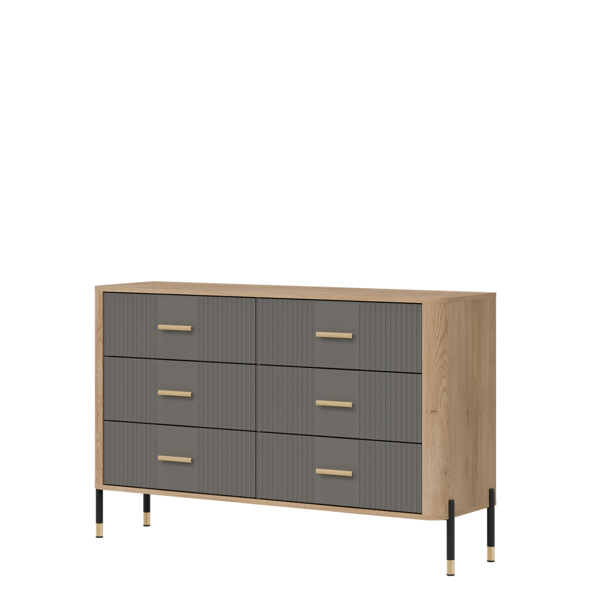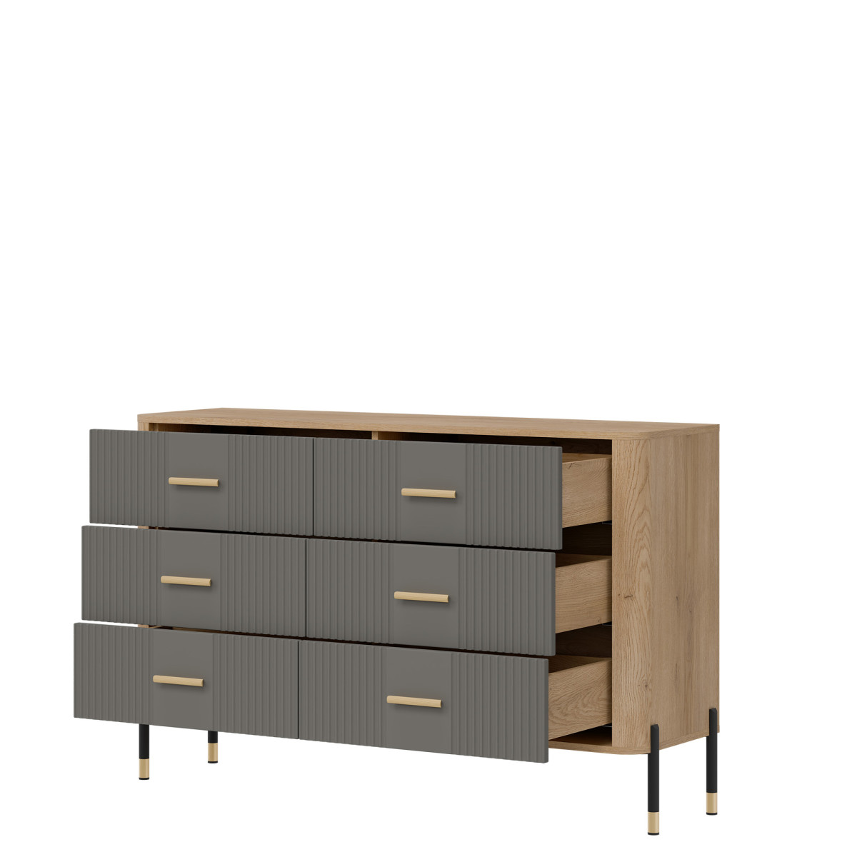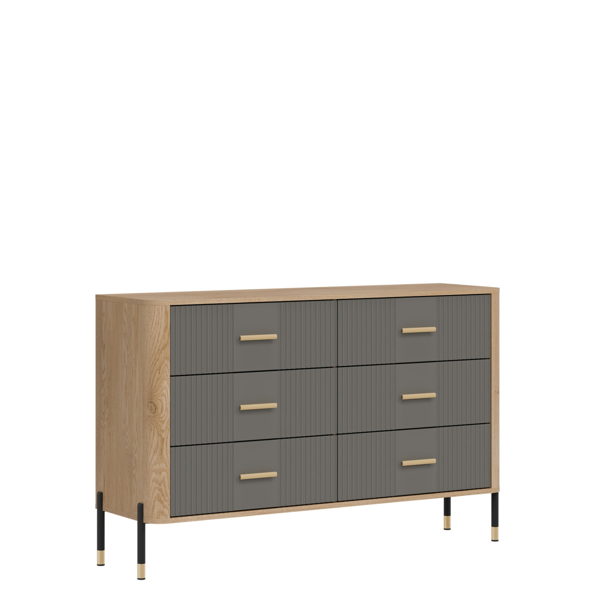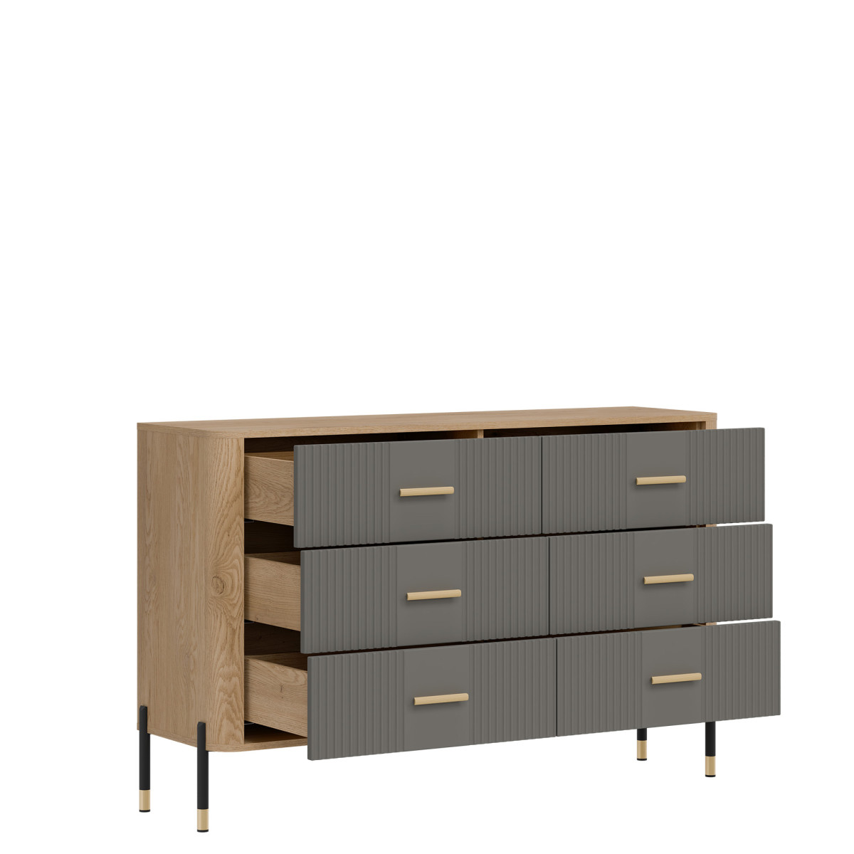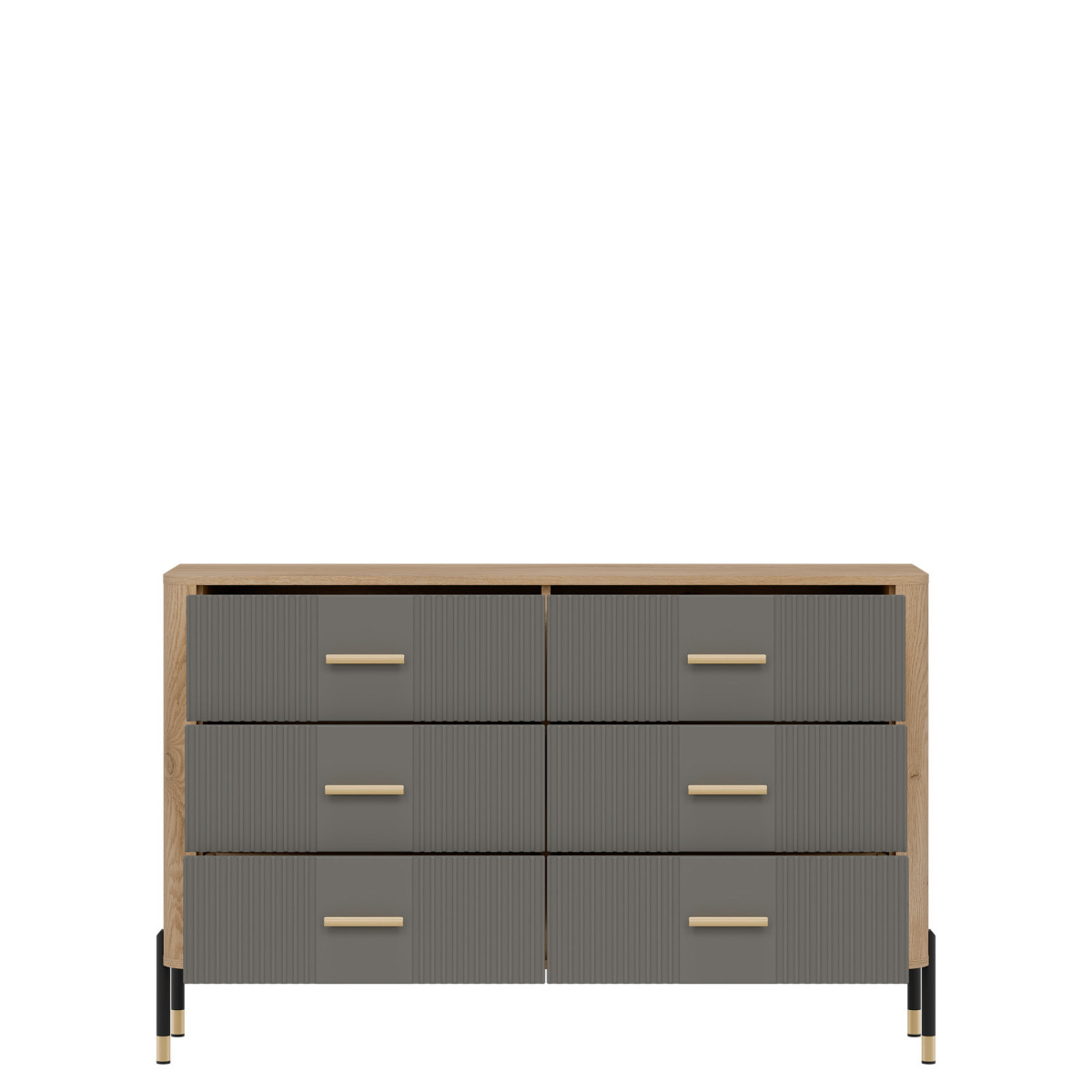 Width 140.5 cm Depth 40 cm Height 88 cm Product weight with packaging 58.75 kg Manufacturer’s code / symbol DT04 Collection name DANTE Name in the b2b system DANTE DT04 CREMONA OAK T/MATT GREY CHEST OF DRAWERS SET Number of product packages 5 Style Modern Equipment Assembly instructions / assembly accessories Assembly For self-assembly Body color Cremona Torro Oak Body material / type / thickness 16 mm furniture board / Strip 32 mm MDF furniture board Top of body material / type / thickness 16 mm furniture board Bottom of body material / type / thickness 16 mm furniture board Back wall material / type / thickness 2.5 mm HDF furniture board Front color Matte Gray Front material / type / thickness 18 mm MDF furniture board Front handle / material / color / color Metal / Black or gold Silent system Drawer closing mechanism Standard Drawer guides Favorit Q2 Leg / finish / color Non-adjustable / metal / black – gold Leg height 118 mm Number of drawers 6