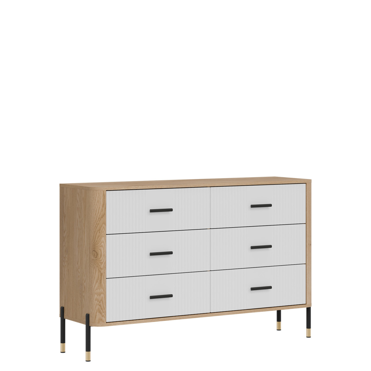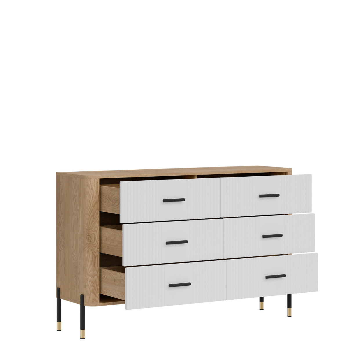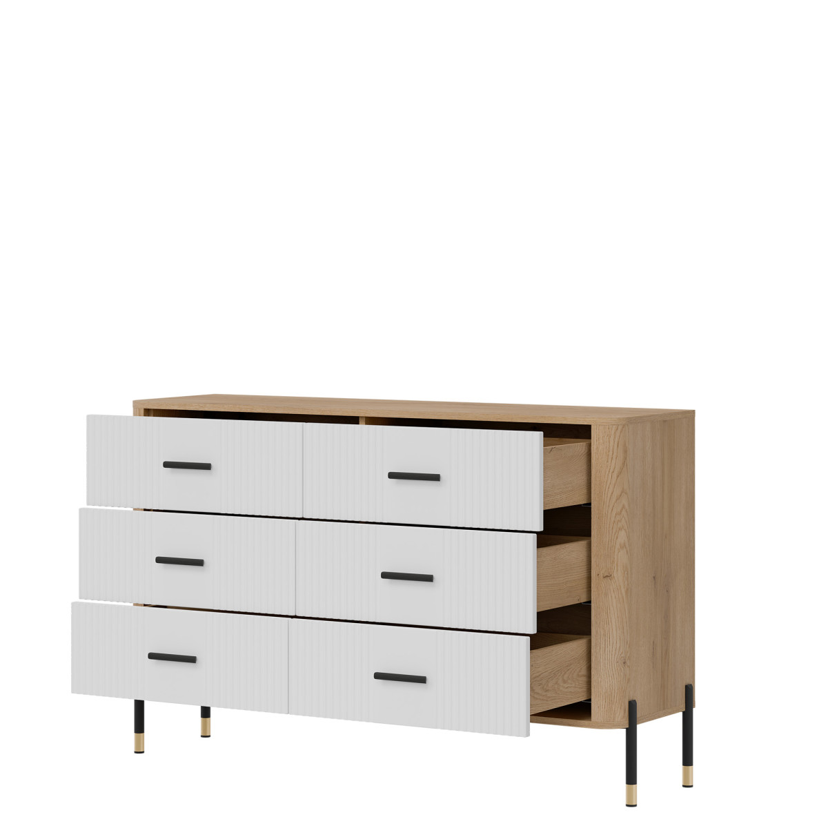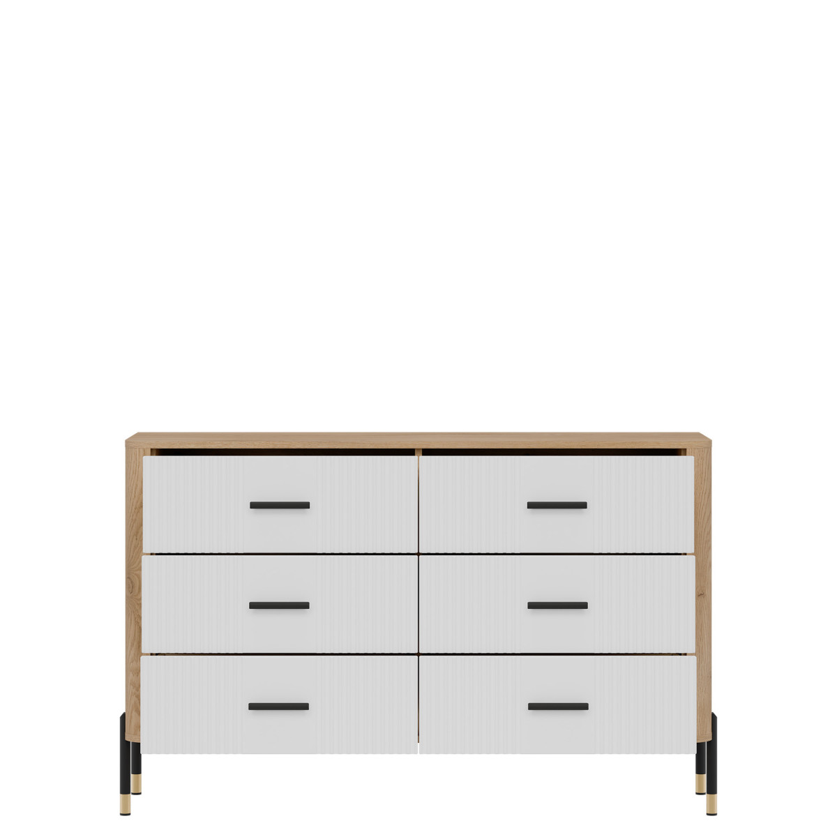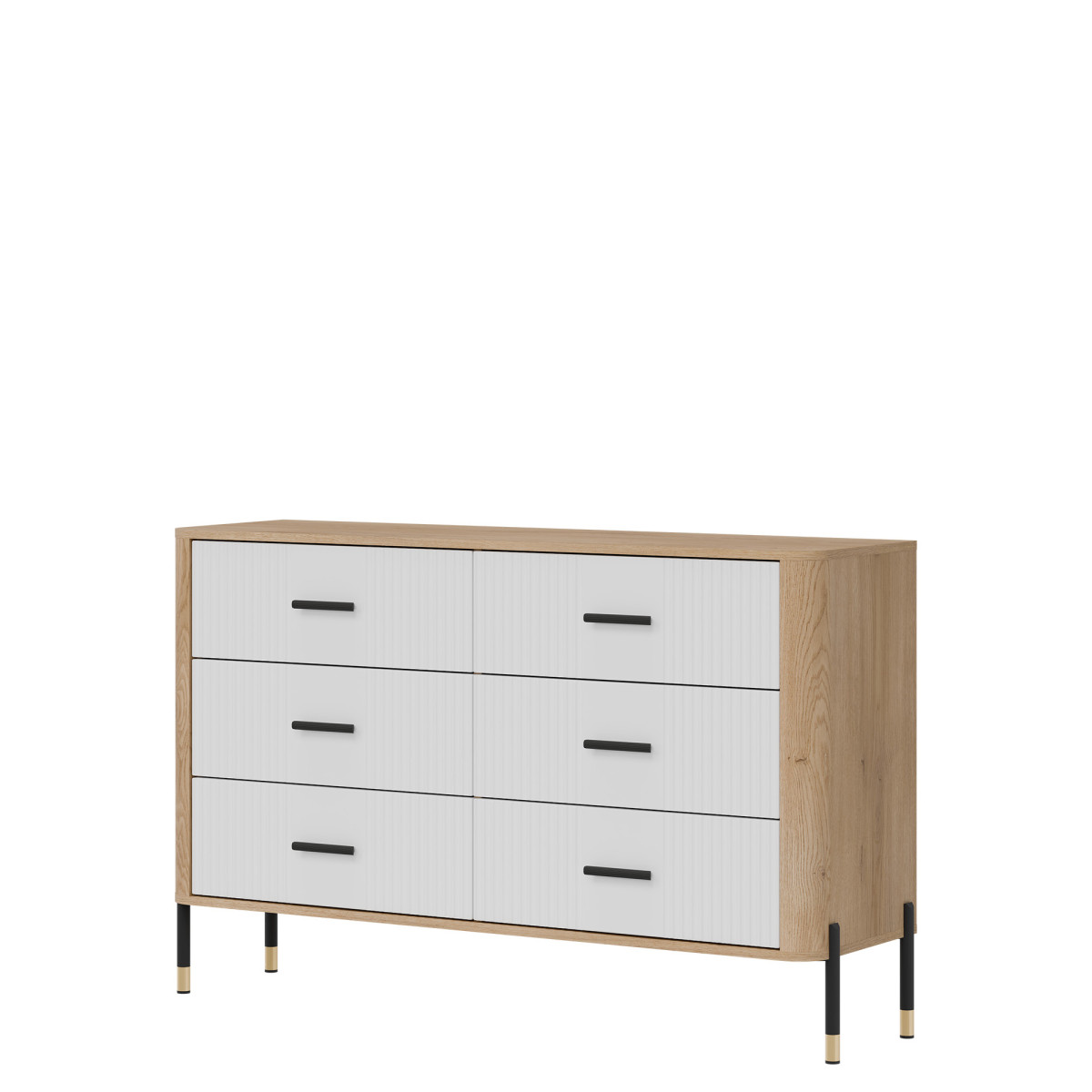 Width 140.5 cm Depth 40 cm Height 88 cm Product weight with packaging 58.75 kg Manufacturer’s code / symbol DT04 Collection name DANTE Name in the b2b system DANTE DT04 CREMONA OAK T/MATT WHITE CHEST OF DRAWERS SET Number of product packages 5 Style Modern Equipment Assembly instructions / assembly accessories Assembly For self-assembly Body color Cremona Torro Oak Body material / type / thickness 16 mm furniture board / Strip 32 mm MDF furniture board Top of body material / type / thickness 16 mm furniture board Bottom of body material / type / thickness 16 mm furniture board Back wall material / type / thickness 2.5 mm HDF furniture board Front color Matte White Front material / type / thickness 18 mm MDF furniture board Front handle / material / color / color Metal / Black or gold Silent system Drawer closing mechanism Standard Drawer guides Favorit Q2 Leg / finish / color Non-adjustable / metal / black – gold Leg height 118 mm Number of drawers 6