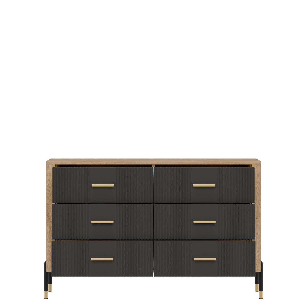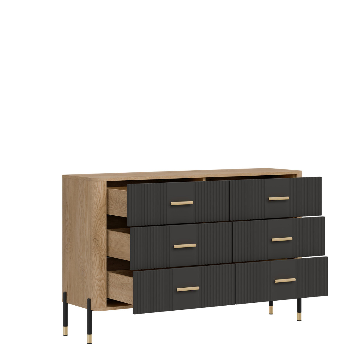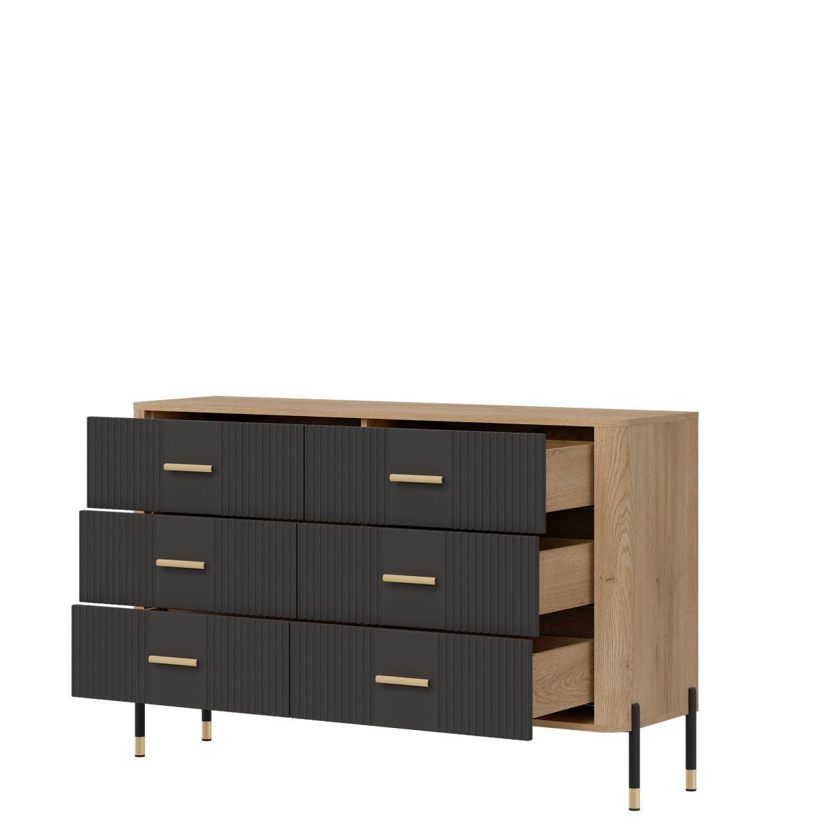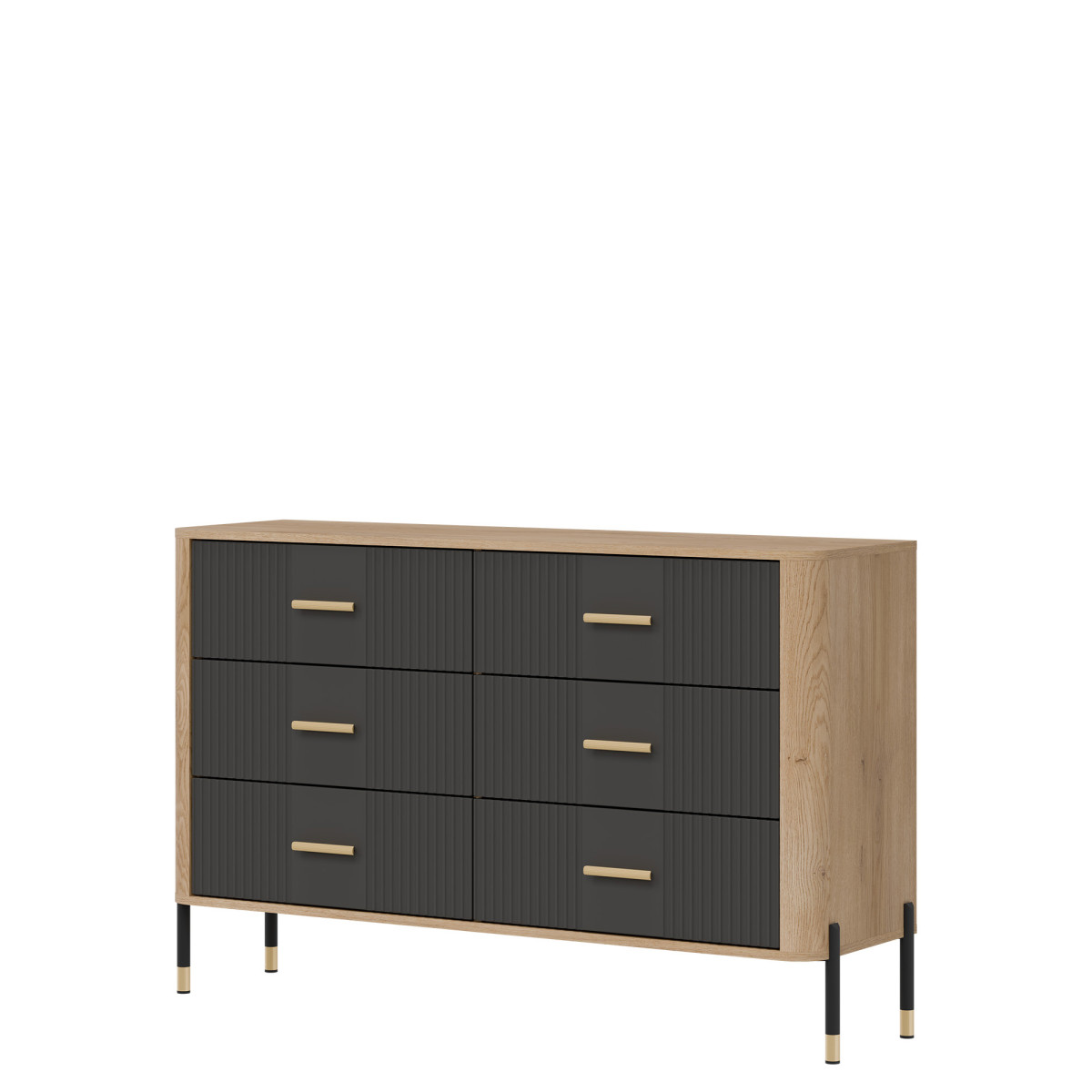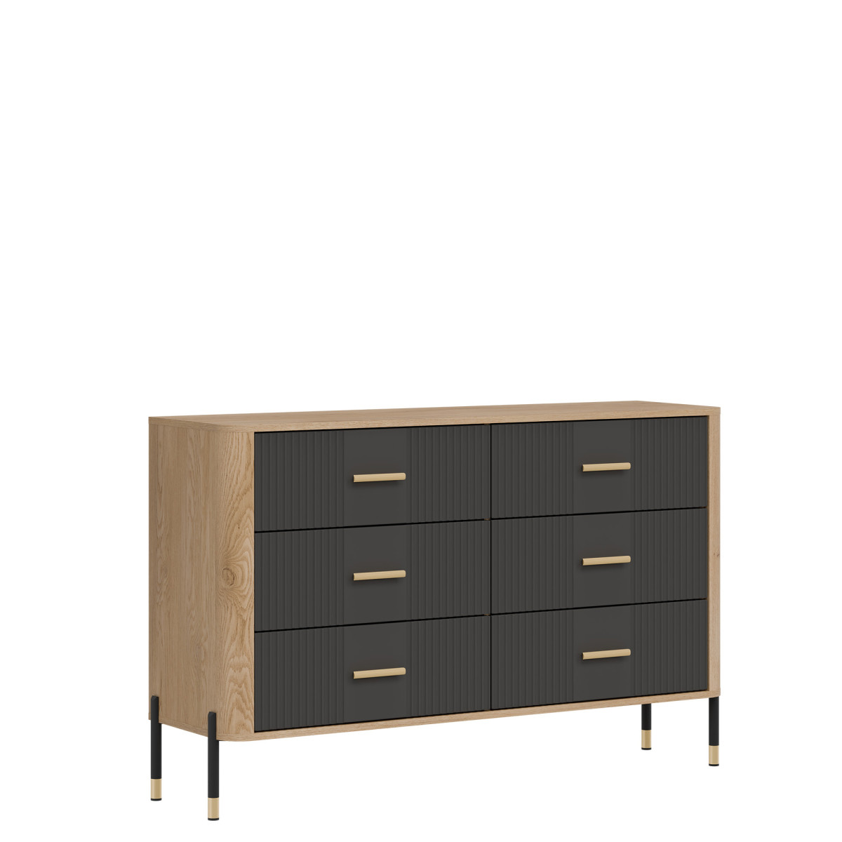 Width 140.5 cm Depth 40 cm Height 88 cm Product weight with packaging 58.75 kg Manufacturer’s code / symbol DT04 Collection name DANTE Name in the b2b system DANTE DT04 CREMONA OAK T/ANTHRACITE MATT CHEST OF CHESTS SET Number of product packages 5 Style Modern Equipment Assembly instructions / assembly accessories Assembly For self-assembly Body color Cremona Oak Torro Body material / type / thickness 16 mm furniture board / Strip 32 mm MDF furniture board Top of the body material / type / thickness 16 mm furniture board Bottom of the body material / type / thickness 16 mm furniture board Back wall material / type / thickness 2.5 mm HDF furniture board Front color Anthracite Matt Front material / type / thickness 18 mm MDF furniture board Front handle / material / color / thickness Metal / Black or gold System Soft closing drawers Standard Drawer guides Favorit Q2 Leg / finish / color Non-adjustable / metal / black – gold Leg height 118 mm Number of drawers 6