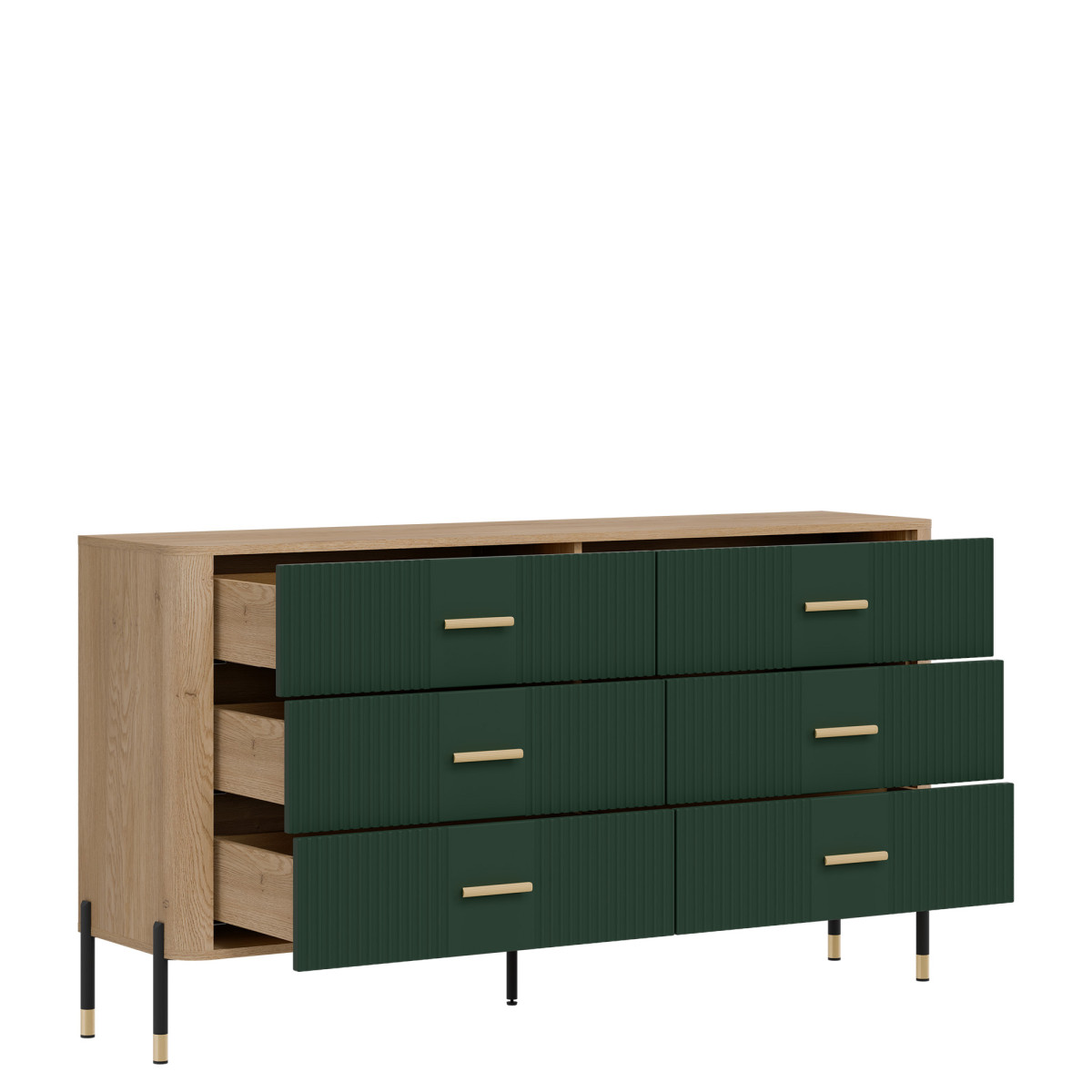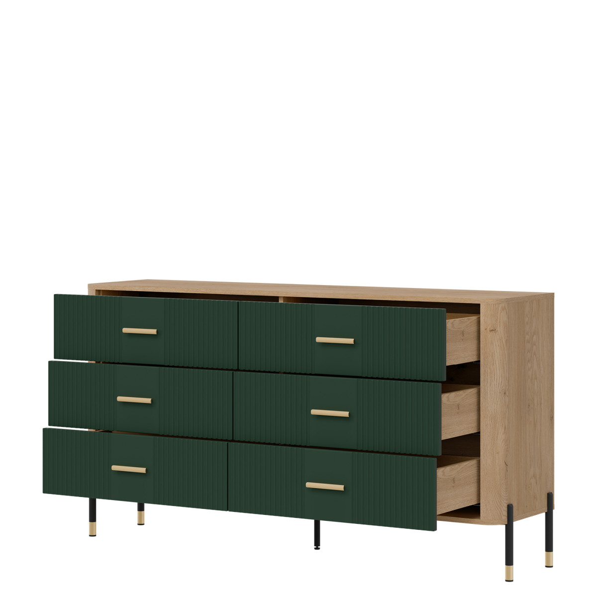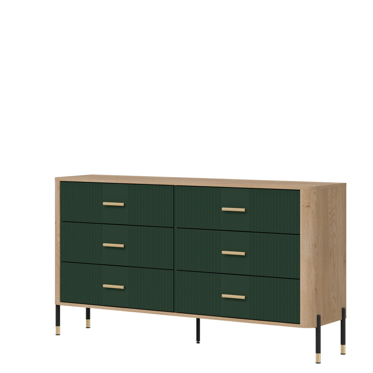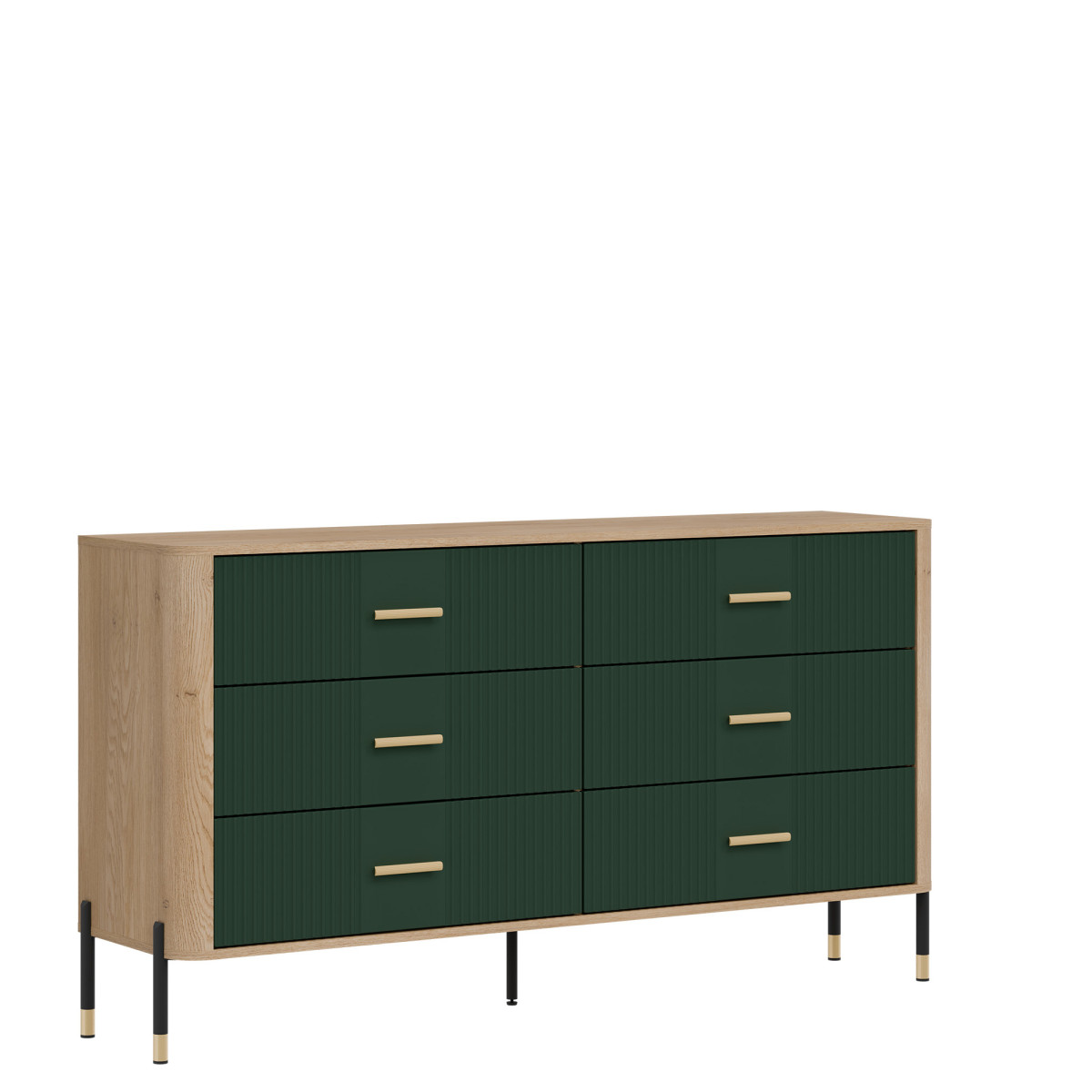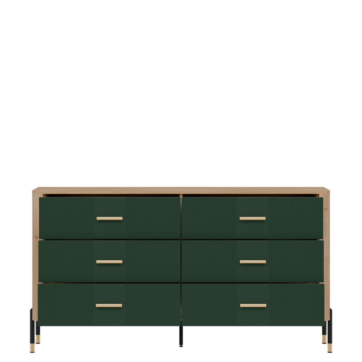 Width 164.5 cm Depth 40 cm Height 88 cm Product weight with packaging 65.35 kg Manufacturer’s code / symbol DT05 Collection name DANTE Name in the b2b system DANTE DT05 CREMONA OAK T/MATT GREEN CHEST OF DRAWERS SET Number of product packages 5 Style Modern Equipment Assembly instructions / assembly accessories Assembly For self-assembly Body color Cremona Torro Oak Body material / type / thickness 16 mm furniture board / Strip 32 mm MDF furniture board Top of body material / type / thickness 16 mm furniture board Bottom of body material / type / thickness 16 mm furniture board Back wall material / type / thickness 2.5 mm HDF furniture board Front color Matte Green Front material / type / thickness 18 mm MDF furniture board Front handle / material / color / color Metal / Black or gold Silent system Drawer closing mechanism As standard Drawer guides Favorit Q2 Leg / finish / color Non-adjustable / metal / black – gold Leg height 118 mm Additional leg / finish / color Adjustable middle / metal / Black Number of drawers 6