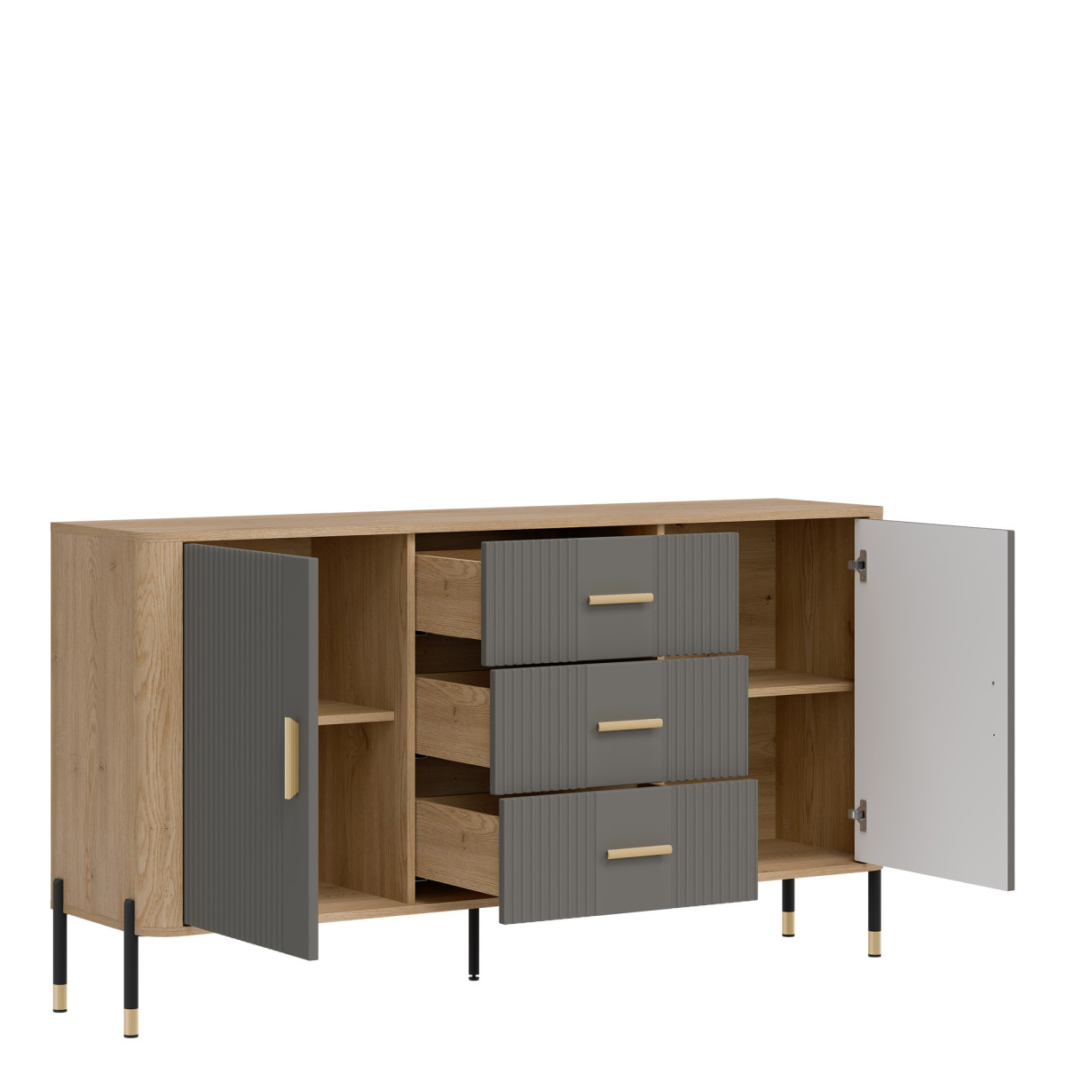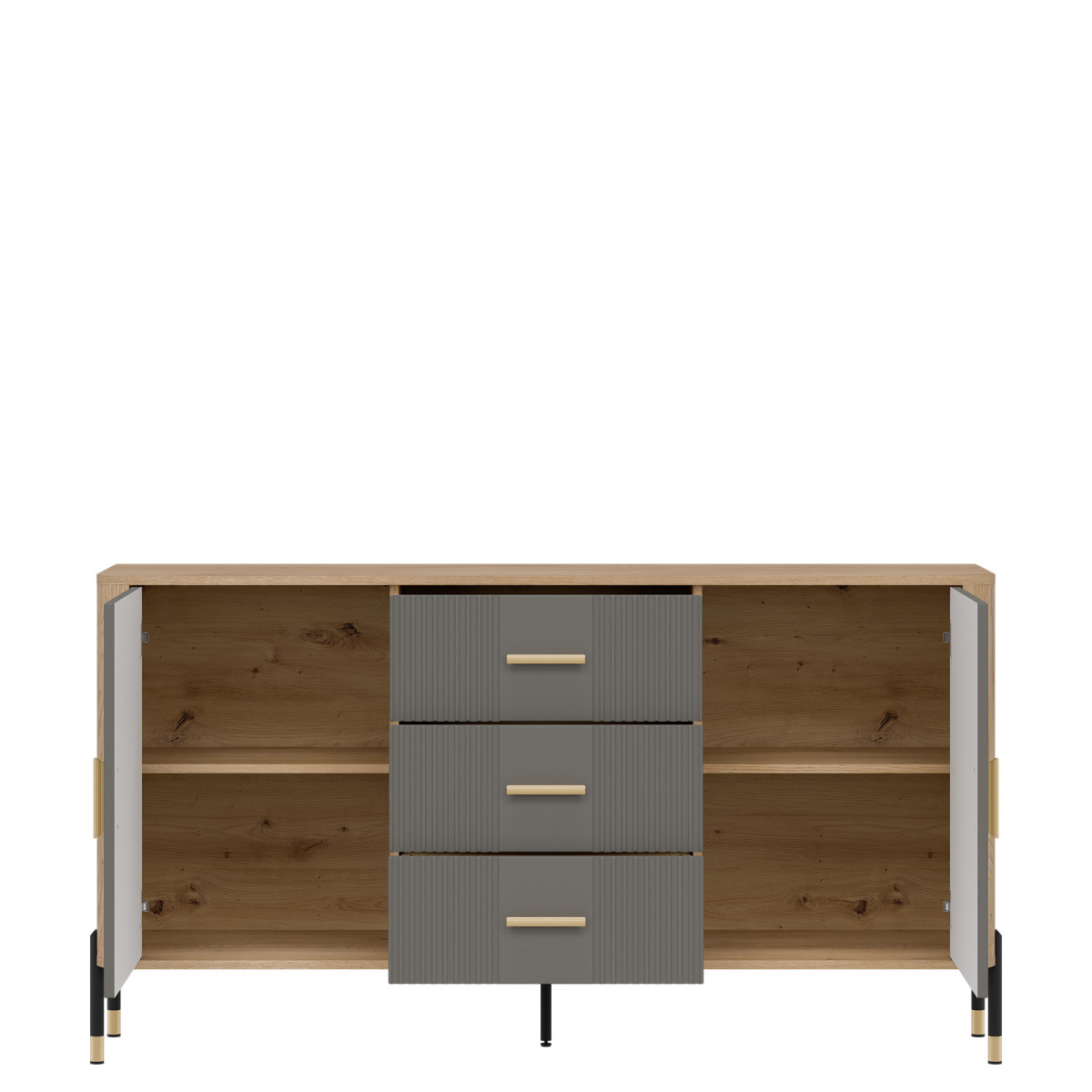 Width 164.5 cm Depth 40 cm Height 88 cm Product weight with packaging 58.45 kg Manufacturer’s code / symbol DT06 Collection name DANTE Name in the b2b system DANTE DT06 CREMONA OAK T/MATT GREY CHEST OF DRAWERS SET Number of product packages 5 Style Modern Equipment Assembly instructions / assembly accessories Assembly For self-assembly Body color Cremona Torro Oak Body material / type / thickness 16 mm furniture board / Strip 32 mm MDF furniture board Top of the body material / type / thickness 16 mm furniture board Bottom of the body material / type / thickness 16 mm furniture board Shelf color Cremona Torro Oak Shelf material / type / thickness 16 mm furniture board Shelf quantity 2 Back wall material / type / thickness 2.5 mm HDF furniture board Back wall visible part Color: Artisan Oak Front color: Matte Gray Front finish: Material / type / thickness: 18 mm MDF furniture board Front hinge: ⌀ 35 mm, adjustable in three planes Front handle / finish / color: Metal / Black or gold Soft-close door system Standard Soft-close drawer system Standard Drawer guides: Favorit Q2 Leg / finish / color: Non-adjustable / metal / black – gold Leg height: 118 mm Additional leg / finish / color: Adjustable middle / metal / Black Number of doors: 2 Number of drawers: 3 Number of closed niches: 4