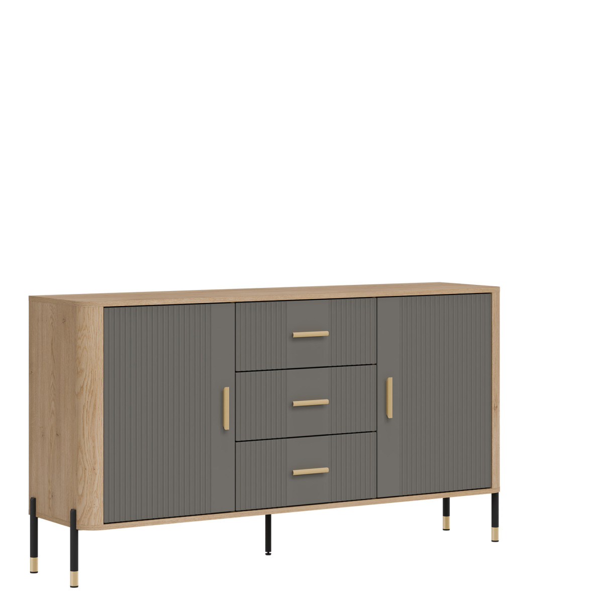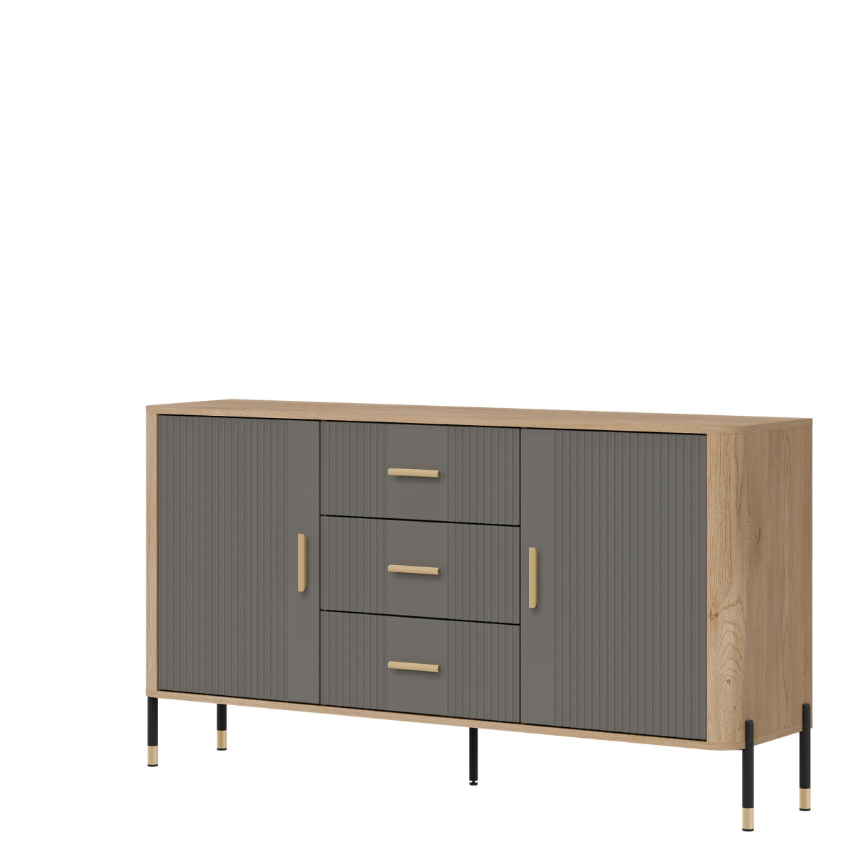The Dante DT06 sideboard is a stylish harmony of modern design and practical storage. The Dante DT06 is a sideboard that impresses with its well-thought-out construction, elegant finish, and versatile functionality. It was designed for those who value modern style, ease of use, and high aesthetic detail. The piece stands out with its symmetrical layout – the central section with three spacious drawers is surrounded by two lockable cabinets, offering excellent space organization. It’s the perfect solution for storing both small accessories and larger items such as documents, tableware, and textiles. The natural wood-colored body contrasts with the matte black fronts, available in five color variants, creating a modern and elegant combination. Gold or black handles and slender metal legs give the piece a light and luxurious character while ensuring its stability. An additional center leg increases the durability of the entire structure. The Dante sideboard – a perfect combination of aesthetics and ergonomics. Create an interior that delights with style and functionality – choose furniture that will suit your needs.