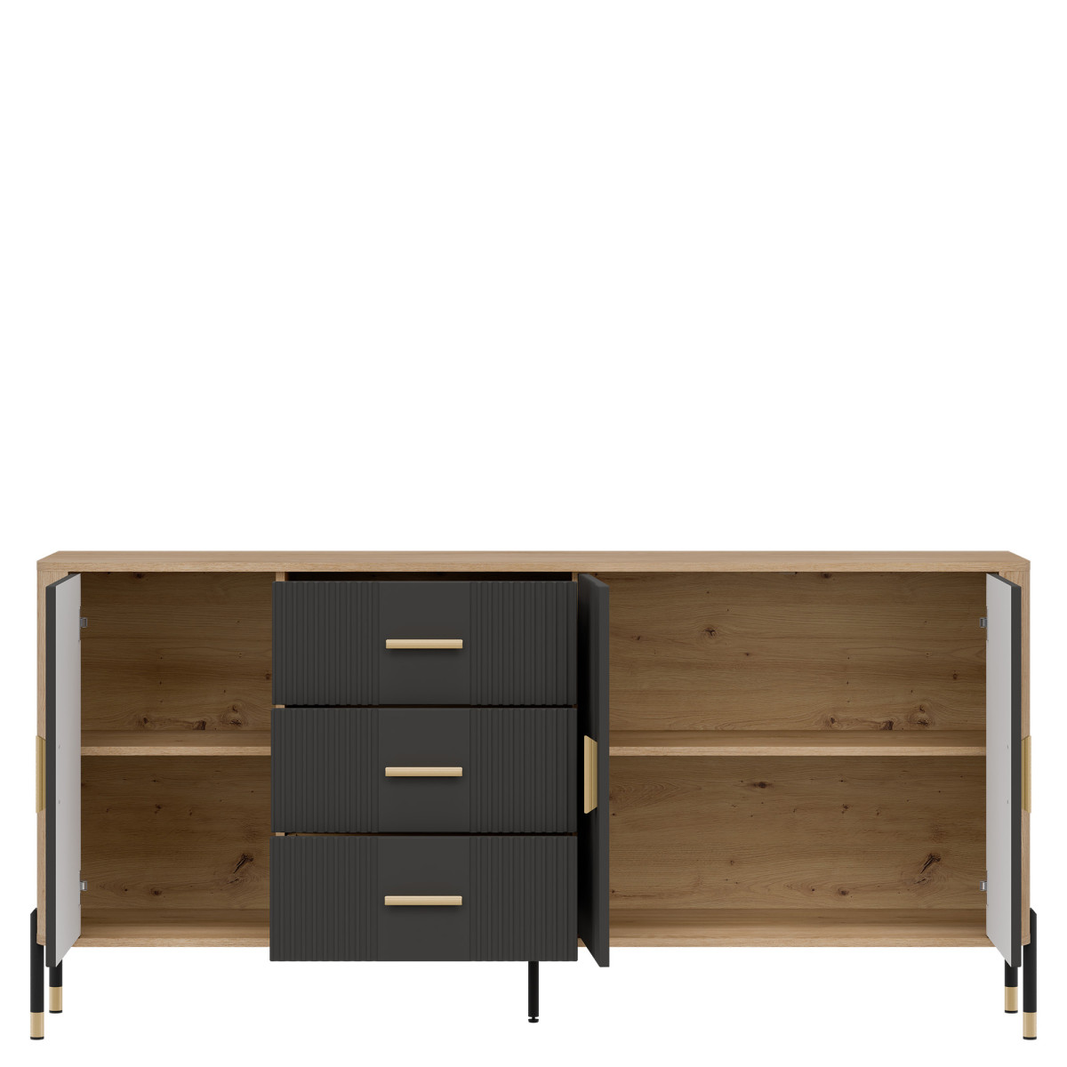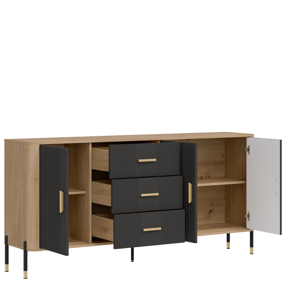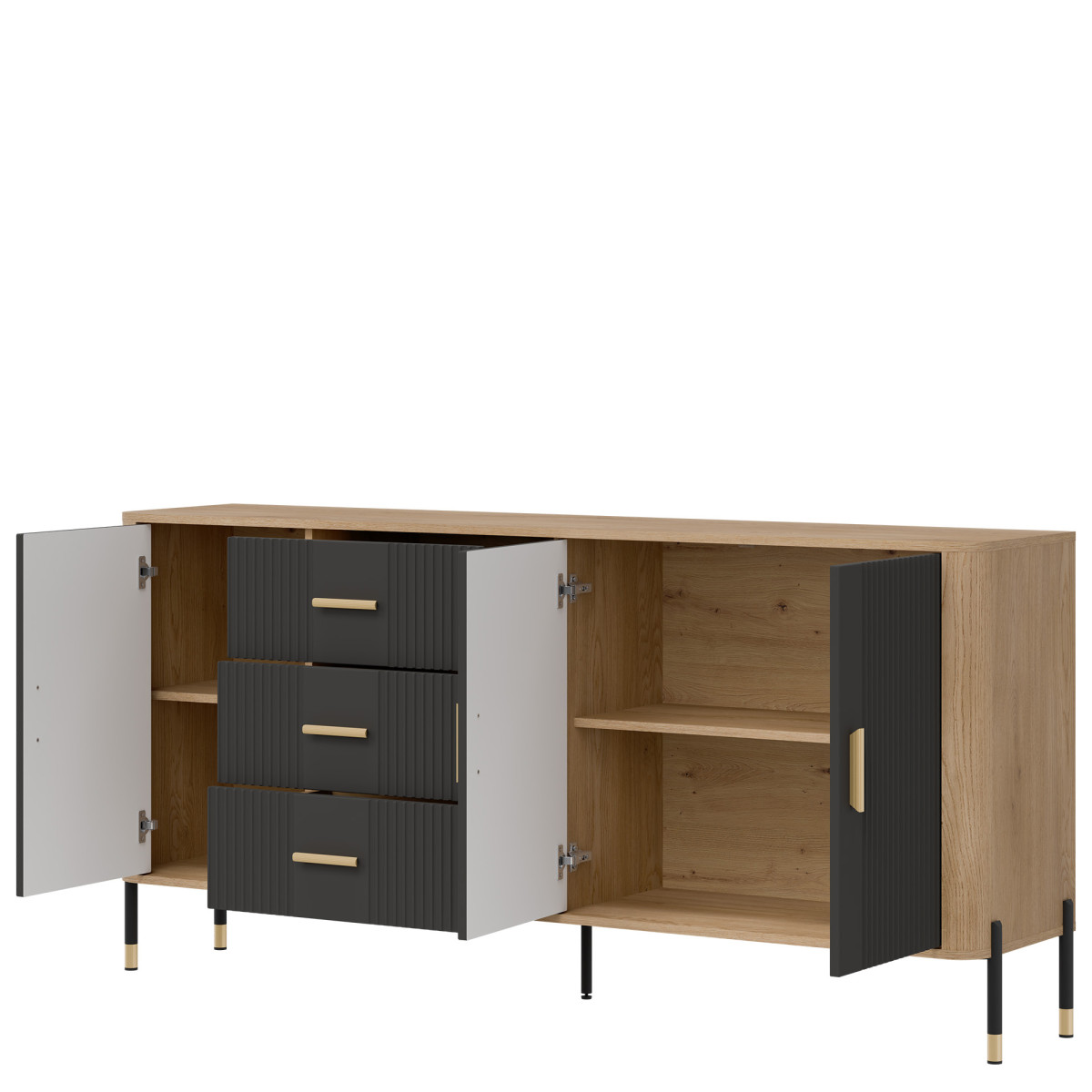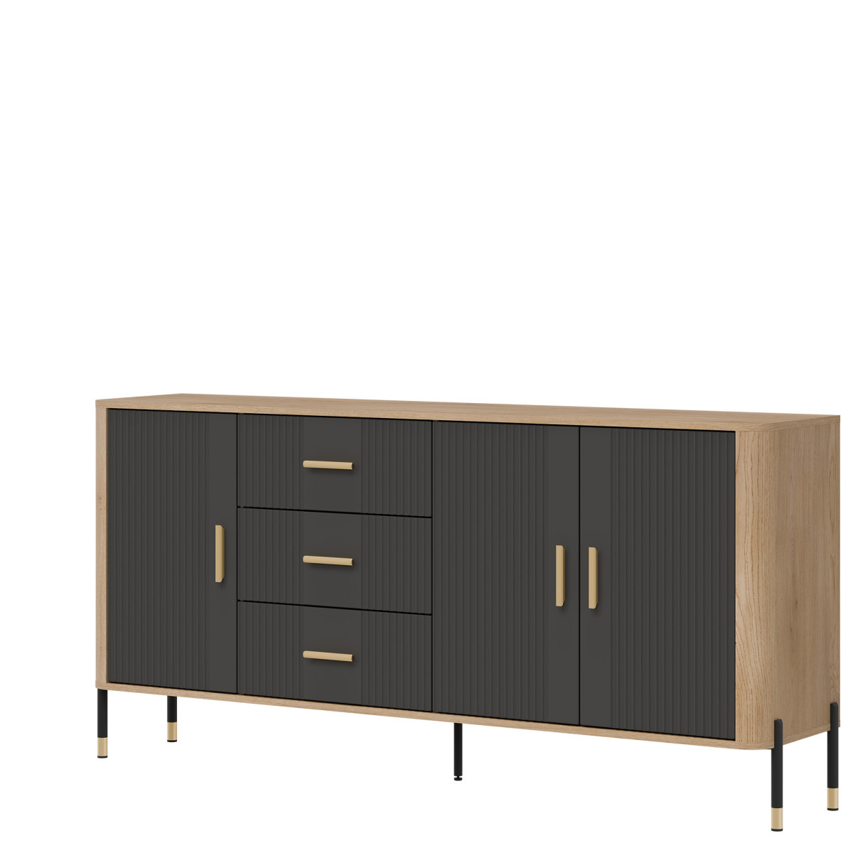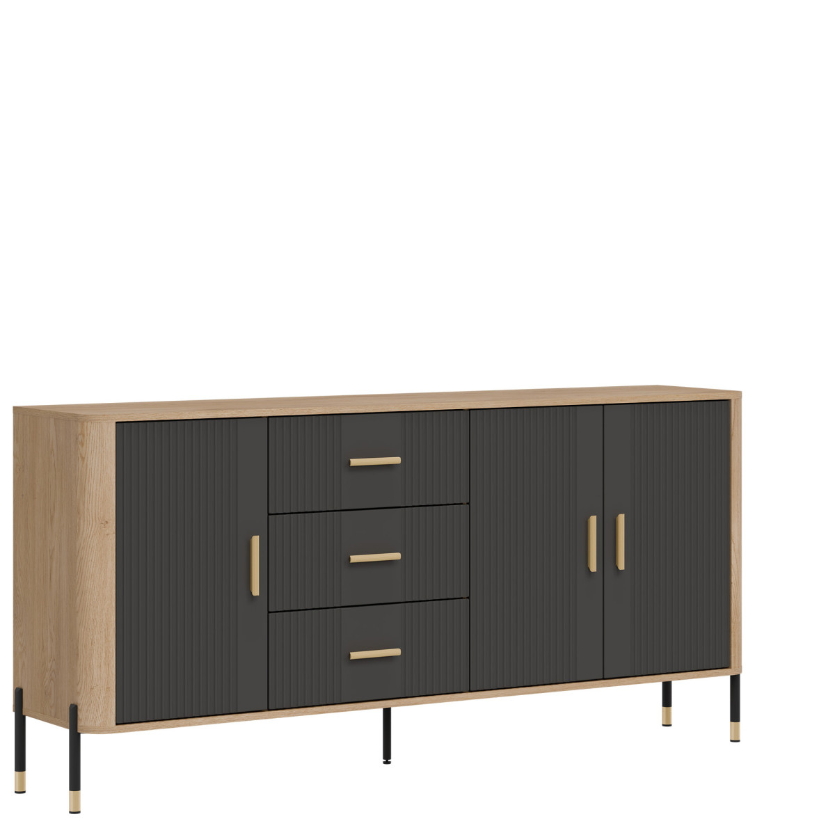 Dante DT07 Sideboard – Space, design, and sophistication in one piece of furniture. Discover the Dante DT07 sideboard – a solution that meets the expectations of even the most demanding users. This elegant and functional piece is the quintessence of modern design, where aesthetics go hand in hand with excellent space organization. Thanks to its extensive construction, the DT07 sideboard provides maximum storage capacity. It features three spacious drawers located centrally, a single-door cabinet, and one wide double-door cabinet on the right – each offering different space-saving options, making this model exceptionally versatile. It’s the perfect solution for storing textiles, documents, decorative items, tableware, and household appliances. It will work perfectly in a living room, dining room, study, or even a spacious bedroom. Visually, the sideboard impresses with its contrasting color combination: matte fronts available in five color versions and the warm shade of natural wood that forms the body of the piece. The whole is complemented by a choice of gold or black handles and metal legs finished in an elegant black and gold style, adding a modern touch and visual lightness to the piece. An additional central leg enhances stability, emphasizing the high quality of the craftsmanship. Product advantages: Loft- and minimalist-inspired design, ideal for modern arrangements, rich usable interior – 6 separate storage spaces, stable, solid construction with additional reinforcements, contrasting finish: matte black + natural wood + gold accents, universal use – from living rooms to commercial spaces, aesthetic, slender handles and metal legs lend the piece a light touch. The Dante DT07 sideboard is a space that combines order with prestige. With this sideboard, your interior will gain not only functionality but also a distinct character. This piece of furniture not only organizes space – it defines it.