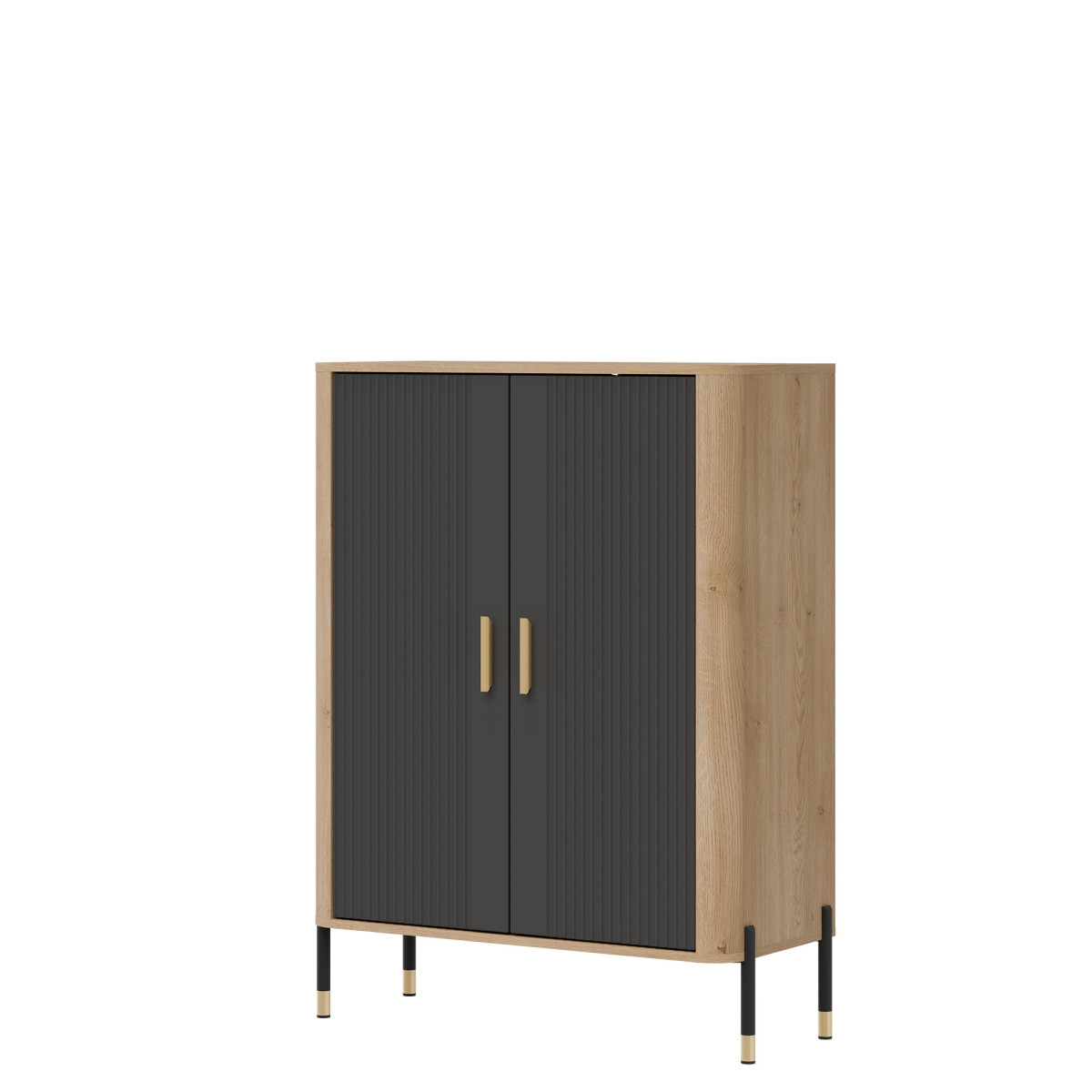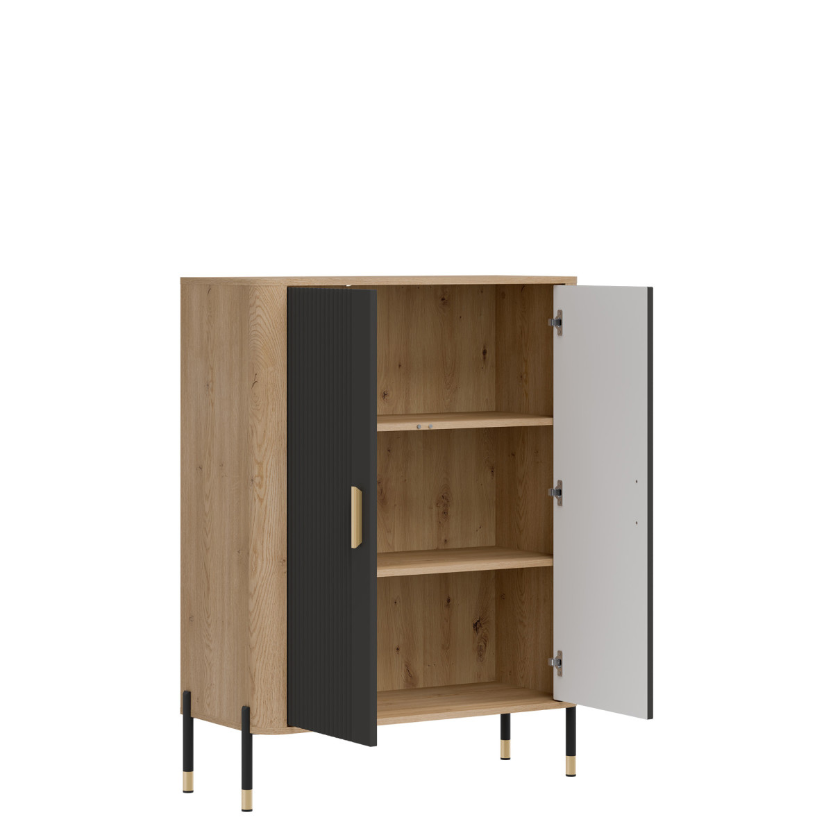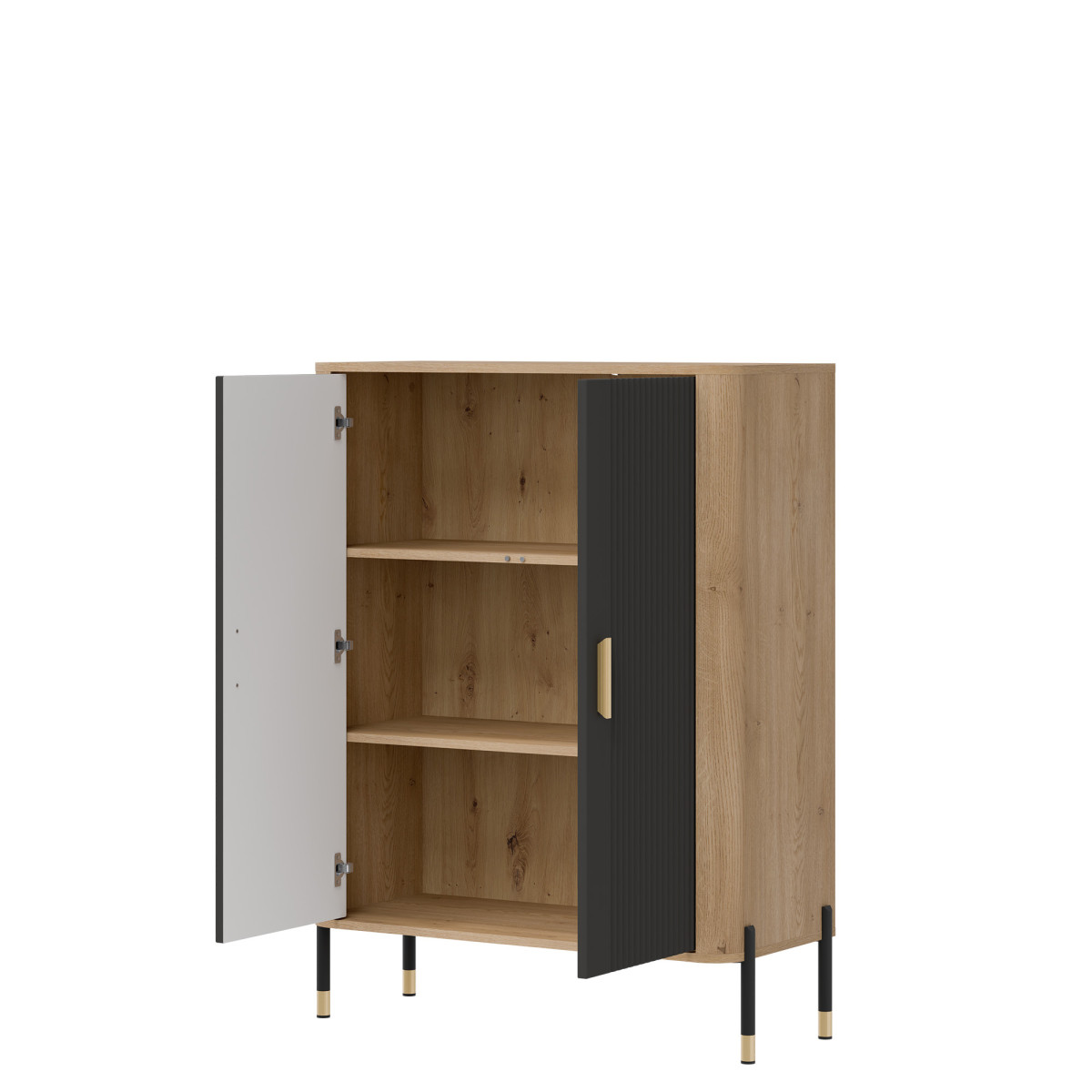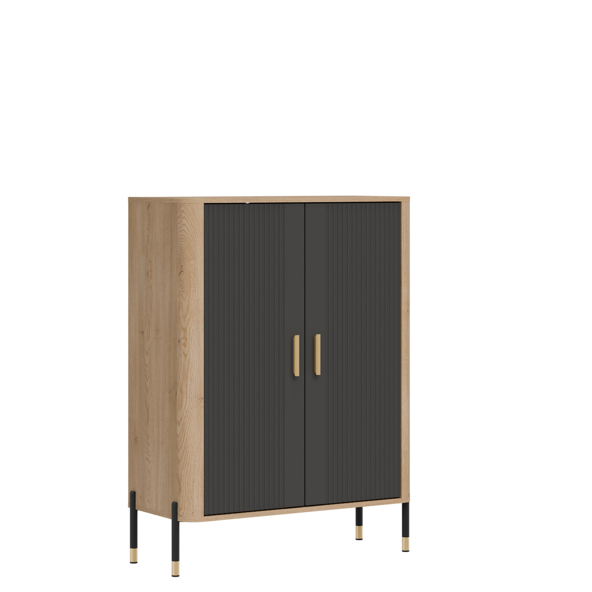The Dante DT11 cabinet – minimalist form, maximum functionality. The Dante DT11 is a piece of furniture that attracts attention with its simplicity, elegance, and proportion. It’s an excellent choice for those seeking modern storage solutions that complement the aesthetics of contemporary interiors – from loft style, through Scandinavian, to classic modern arrangements. The design is based on a two-door form with a slim, vertical layout, making it ideal for narrower spaces – such as a hallway, study, alcove in the living room, or even a bedroom. Behind the solid fronts lies a spacious interior with practical shelves that allow for the organized storage of clothing, documents, dishes, or other essential everyday items. The refined combination of matte front colors in a choice of five color variants with a natural wood decor lends the furniture elegance and timeless style. The whole is complemented by a choice of gold or black vertical handles and black and gold metal legs, which add a light and modern character. Despite its compact form, this piece exudes solidity and attention to detail. The Dante DT11 cabinet – more than just a cabinet. It’s a stylish complement to your space. Choose a piece of furniture that delights with its simplicity, but doesn’t compromise on functionality. With the DT11, your interior will gain a new dimension of order and elegance.