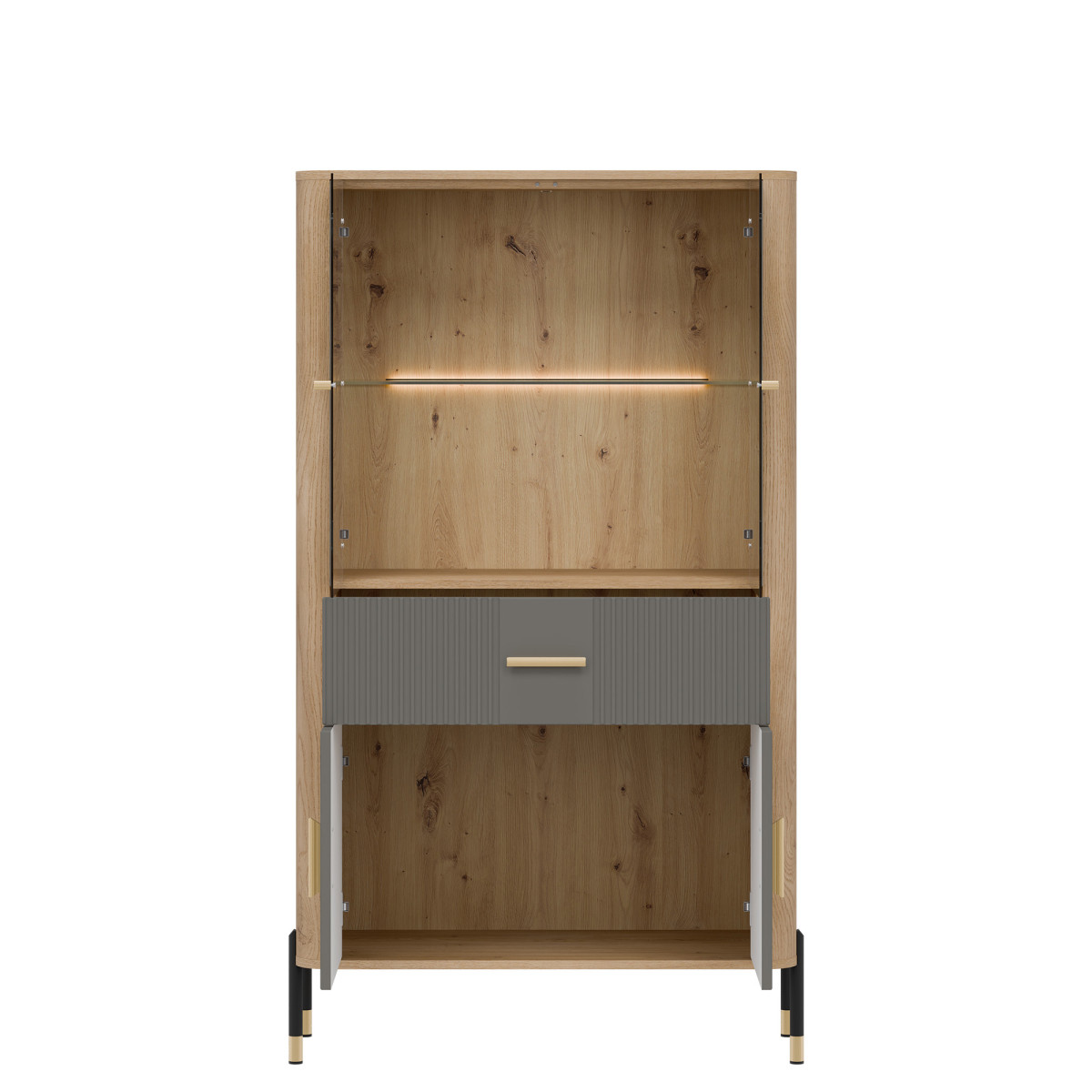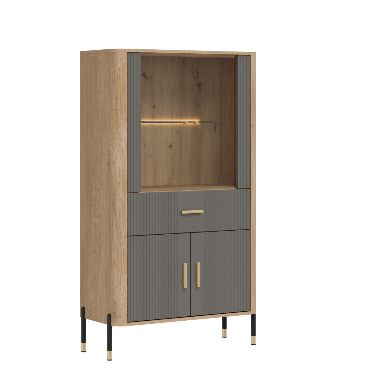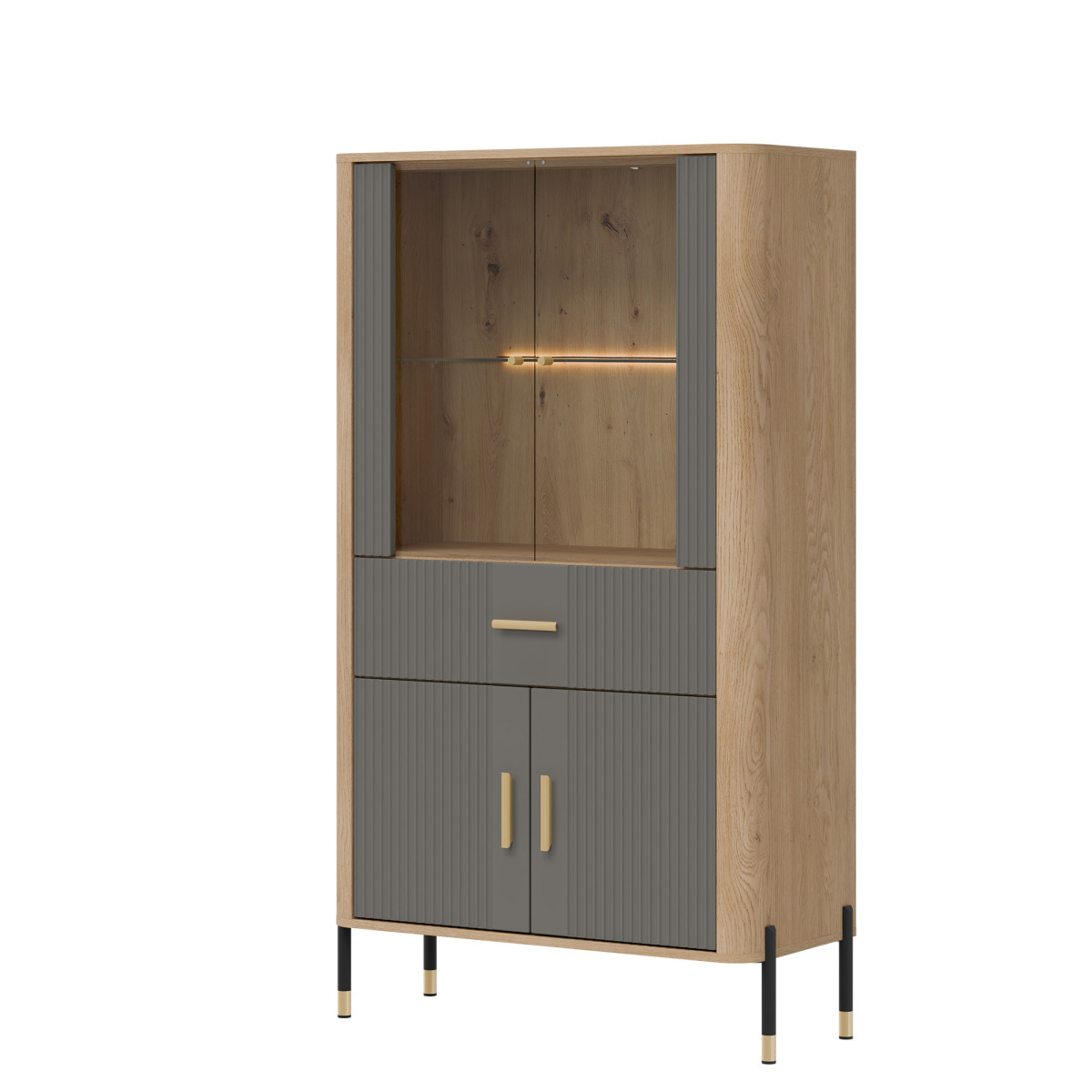 The Dante DT12 Display Cabinet – elegant display and functional storage. The Dante DT12 combines modern style, functionality, and subtle sophistication. This elegant display cabinet was designed for those who want to showcase the most beautiful elements of their interior – porcelain, glassware, collectibles, or souvenirs – in a setting that is decorative in itself. The upper section of the cabinet is a glass display cabinet with optional delicate LED lighting, which subtly highlights and accentuates the items placed inside. The natural wood decor gives the entire unit a warm, cozy feel and contrasts perfectly with the matte color of the fronts, available in five color variants. This is a space that creates atmosphere – both in the living room and dining room. The lower section of the cabinet features a practical drawer and a spacious two-door cabinet, providing ample space for storing everyday items – from tablecloths to documents and tableware. Gold or black handles and sleek black and gold metal legs add a touch of lightness and exclusivity, making the DT12 display cabinet a true centerpiece for any interior. Dante display cabinet – display your most valuable possessions. Hide your essentials. Choose a display cabinet that combines refined aesthetics with everyday functionality. Dante DT12 is a piece of furniture that will add character and order to any space – regardless of your interior style.