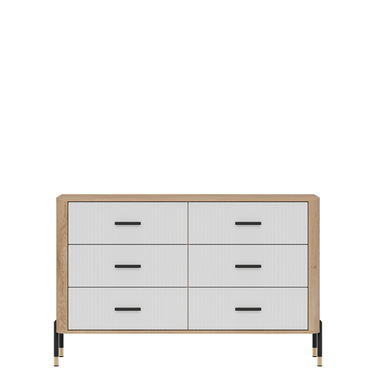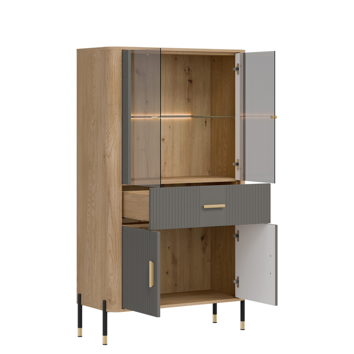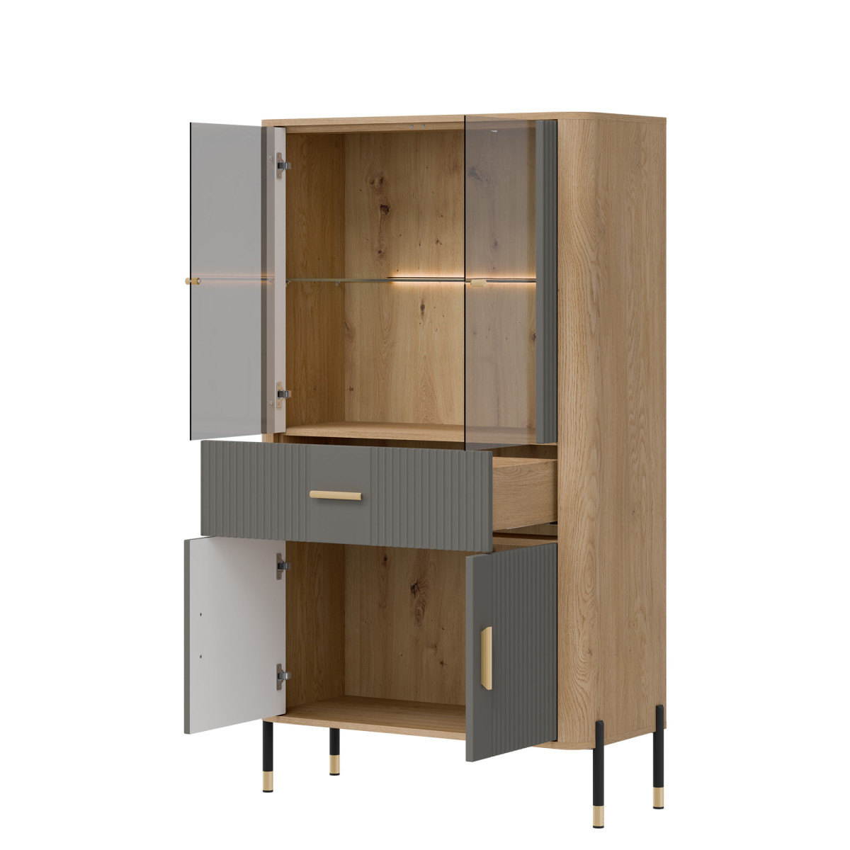 The Dante DT12 Display Cabinet – elegant display and functional storage. The Dante DT12 combines modern style, functionality, and subtle sophistication. This elegant display cabinet was designed for those who want to showcase the most beautiful elements of their interior – porcelain, glassware, collectibles, or souvenirs – in a setting that is decorative in itself. The upper section of the cabinet is a glass display cabinet with optional delicate LED lighting, which subtly highlights and accentuates the items placed inside. The natural wood decor gives the entire unit a warm, cozy feel and contrasts perfectly with the matte color of the fronts, available in five color variants. This is a space that creates atmosphere – both in the living room and dining room. The lower section of the cabinet features a practical drawer and a spacious two-door cabinet, providing ample space for storing everyday items – from tablecloths to documents and tableware. Gold or black handles and sleek black and gold metal legs add a touch of lightness and exclusivity, making the DT12 display cabinet a true centerpiece for any interior. Dante display cabinet – display your most valuable possessions. Hide your essentials. Choose a display cabinet that combines refined aesthetics with everyday functionality. Dante DT12 is a piece of furniture that will add character and order to any space – regardless of your interior style.