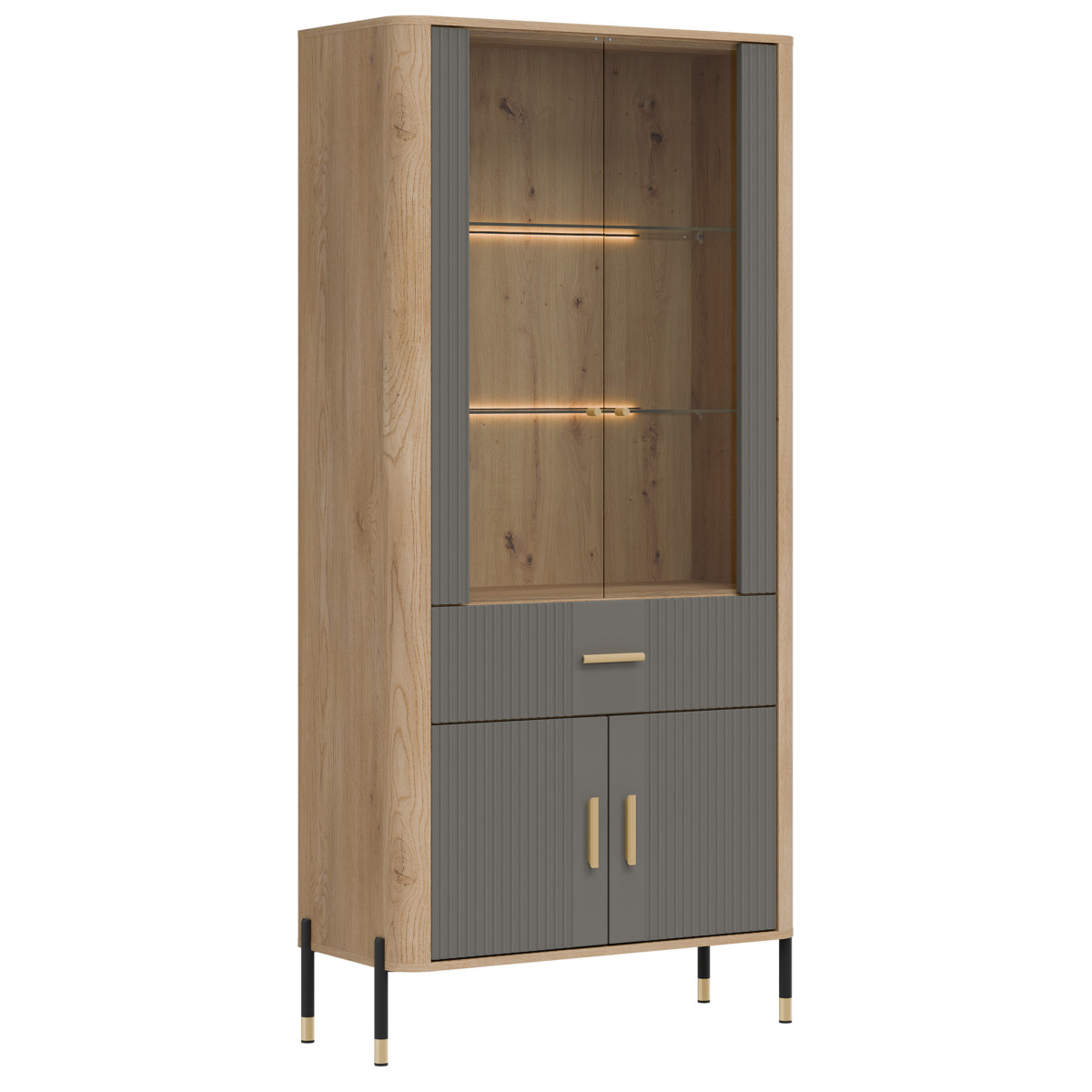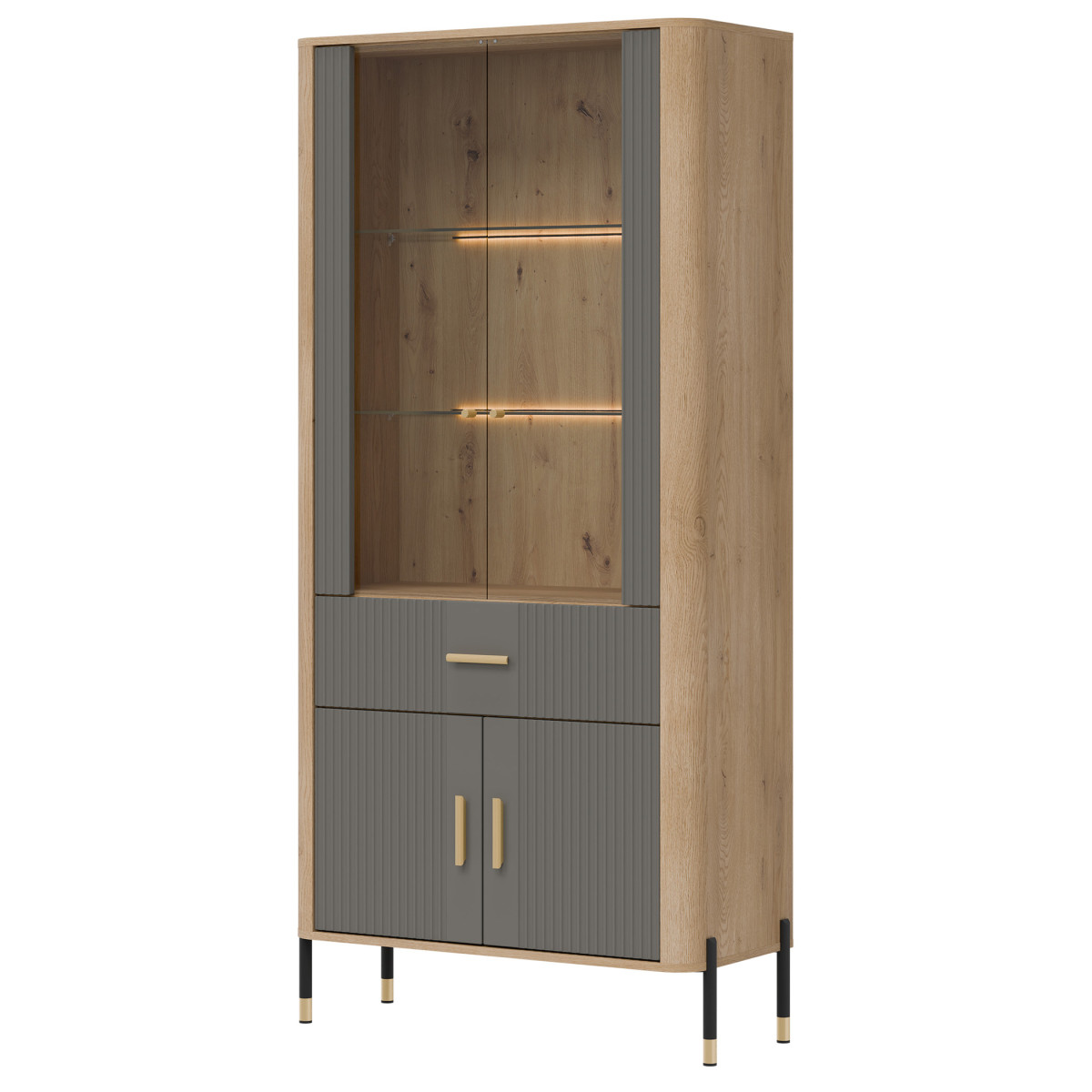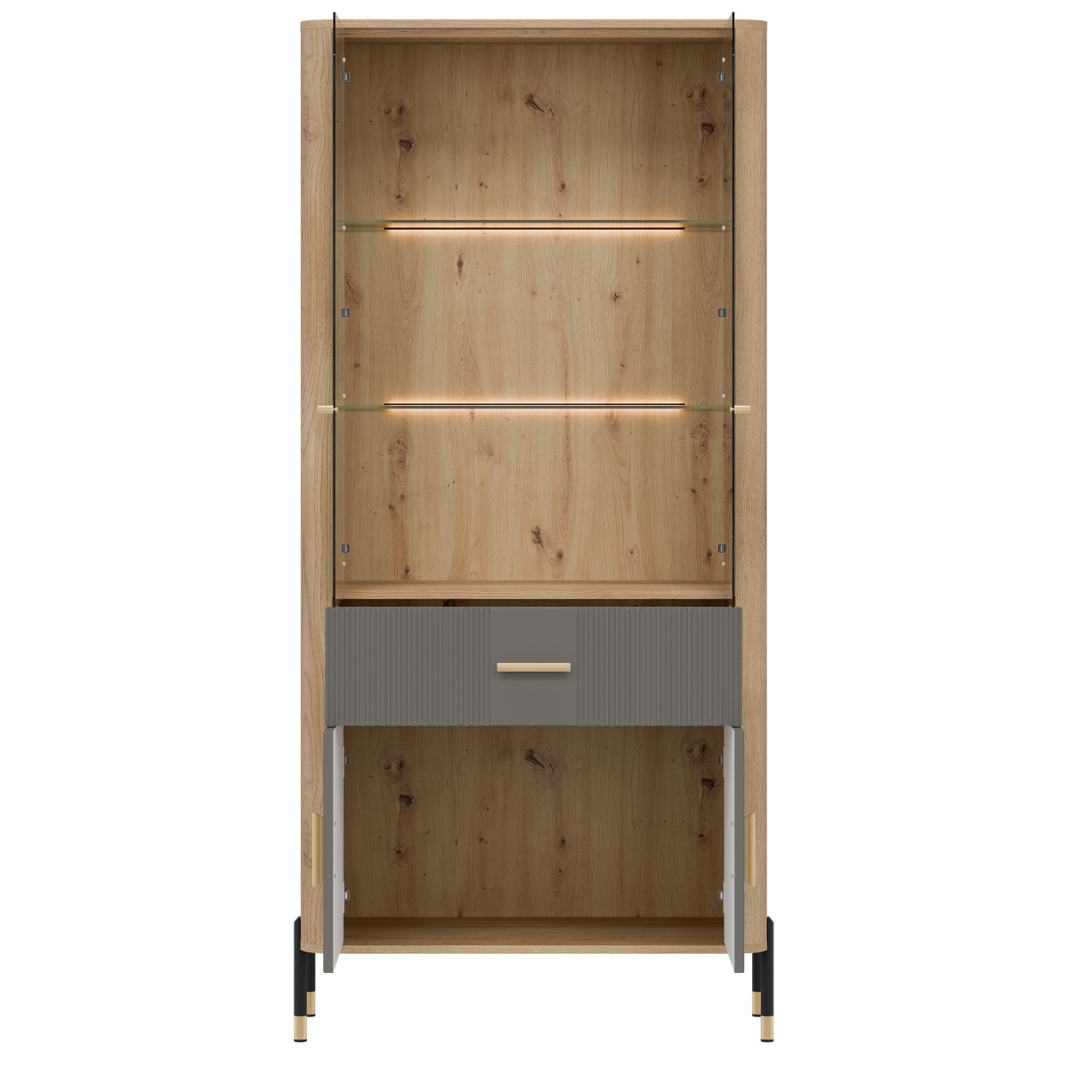 The Dante DT14 display cabinet is a display space in its finest style. The Dante DT14 is a perfect blend of elegance, modern design, and functionality. Designed for interiors where every detail matters, it’s perfect for the living room, dining room, or home office—anywhere you want to combine aesthetics with practical storage. The upper section of the cabinet is a glass display cabinet with optional LED backlighting, which showcases your most precious possessions—from family heirlooms, through glass and ceramics, to designer accessories. The warm light highlights the natural grain of the wood and adds a cozy atmosphere to the interior. The lower section features a practical drawer and a spacious double-door cabinet, which will help you keep things organized and hide less important items. The display cabinet is distinguished by its unique color combination—matte fronts available in five color variants combined with an artisan oak decor create an elegant yet timeless contrast. A choice of gold or black handles and leg details complete the look, adding a subtle touch of luxury. DT14 – a display cabinet that will enhance the character of your interior. Let aesthetics and functionality meet in one piece – choose DT14 AZ and create a space that inspires every day.