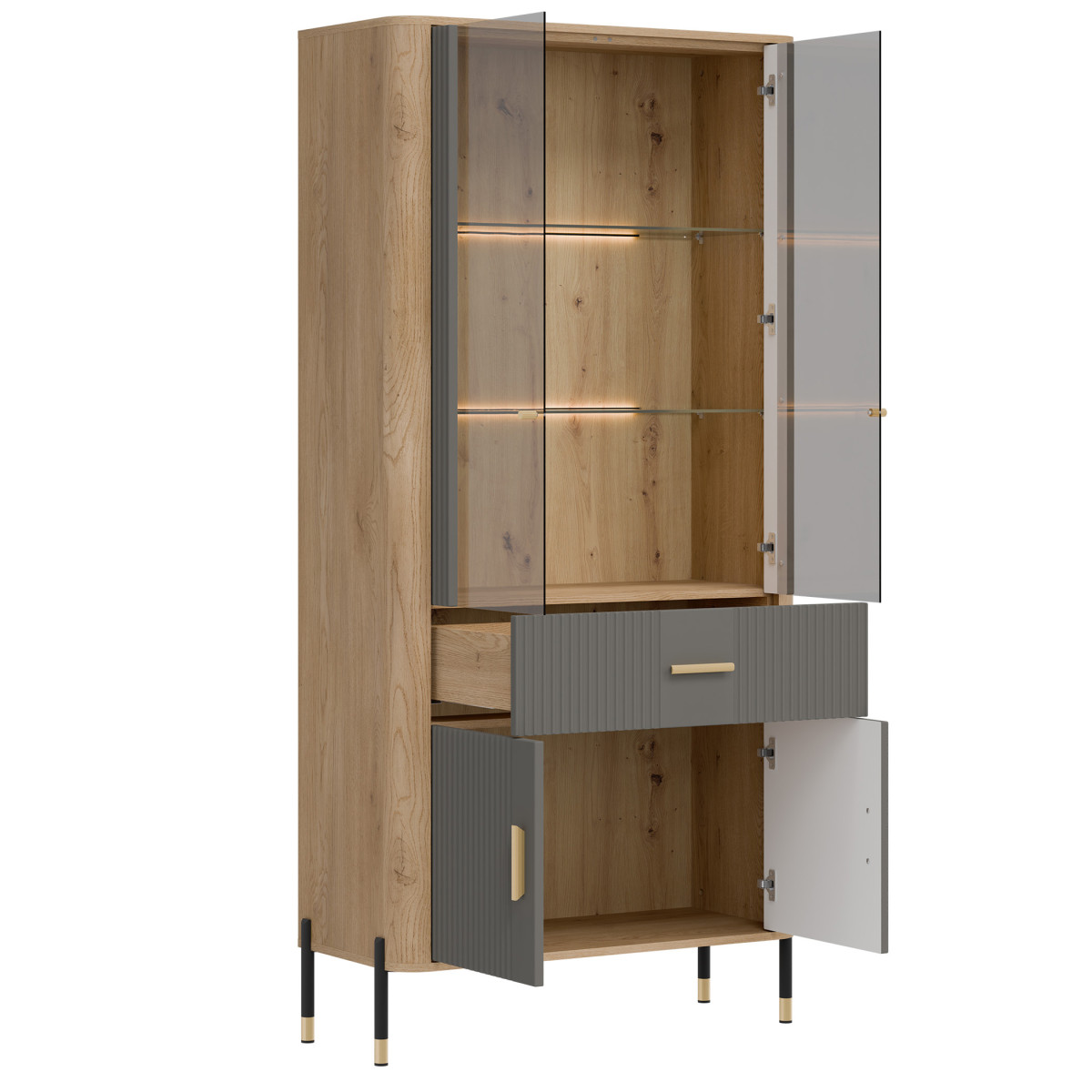 Width 93 cm Depth 40 cm Height 197 cm Product weight with packaging 67.70 kg Manufacturer’s code / symbol DT14 Collection name DANTE Name in the b2b system DANTE DT14 CREMONA OAK T/MATT GREY DISPLAY CABINET SET Number of product packages 5 Style Modern Equipment Assembly instructions / assembly accessories Assembly For self-assembly Body color Cremona Torro Oak Body material / type / thickness 16 mm furniture board / Strip 32 mm MDF furniture board Top body material / type / thickness 16 mm furniture board Bottom body material / type / thickness 16 mm furniture board Back wall material / type / thickness 2.5 mm HDF furniture board Back wall visible part color Artisan Oak Front color Matte Grey Front material / type / thickness 18 mm MDF furniture board Hinge Front ⌀ 35 mm adjustable in three planes Front handle / finish / color Metal / Black or gold Glazed front finish / glass color Tempered / Antisol graphite Glazed front glass thickness 4 mm Glass shelf glass color Colorless Glass shelf glass thickness 6 mm Glass shelf quantity 2 Soft-close door system Standard Soft-close drawer system Standard Drawer guides Favorit Q2 Leg / finish / color Non-adjustable / metal / black – gold Leg height 118 mm Number of doors 4 Number of drawers 1 Number of recesses closed behind the glass front 3 Number of recesses closed 1