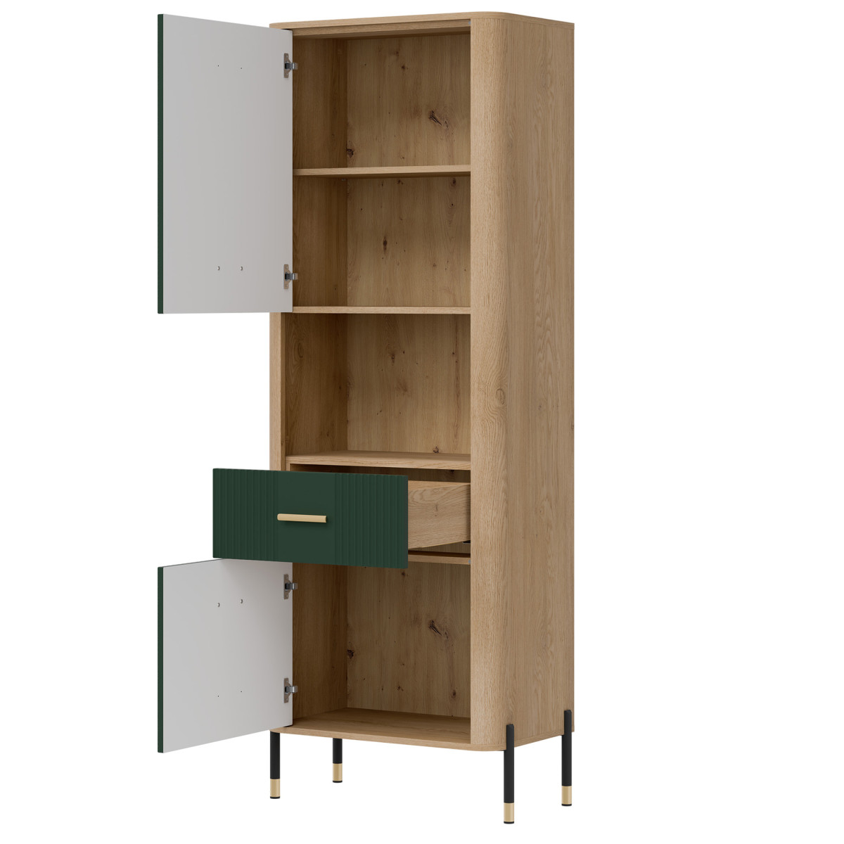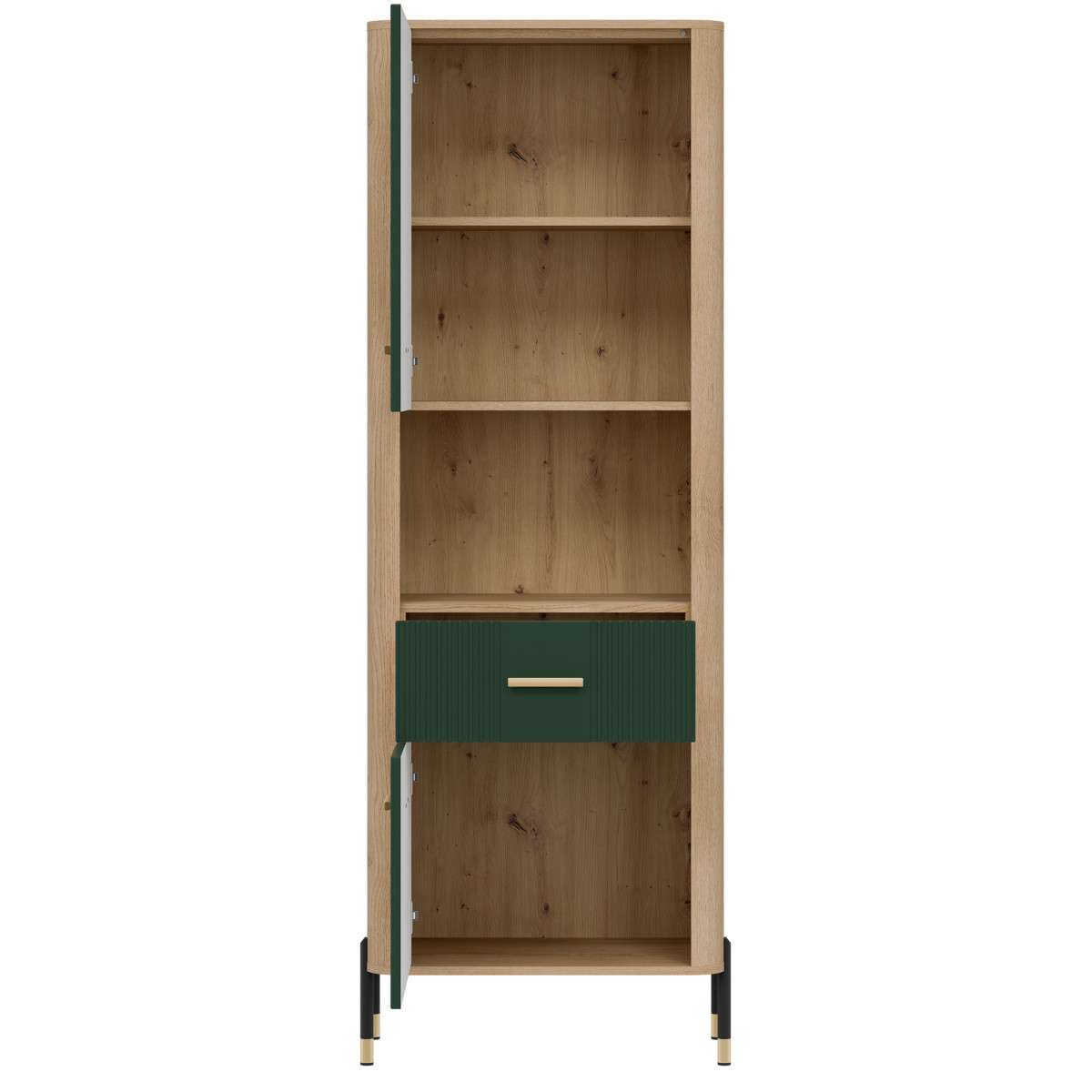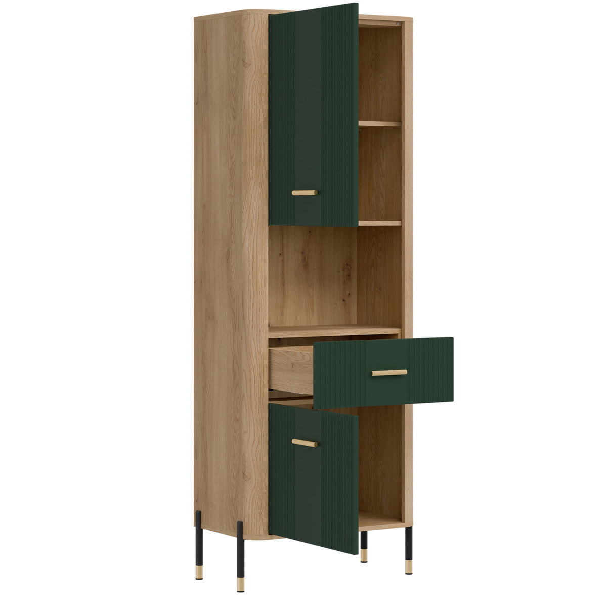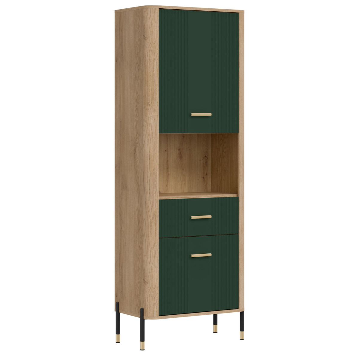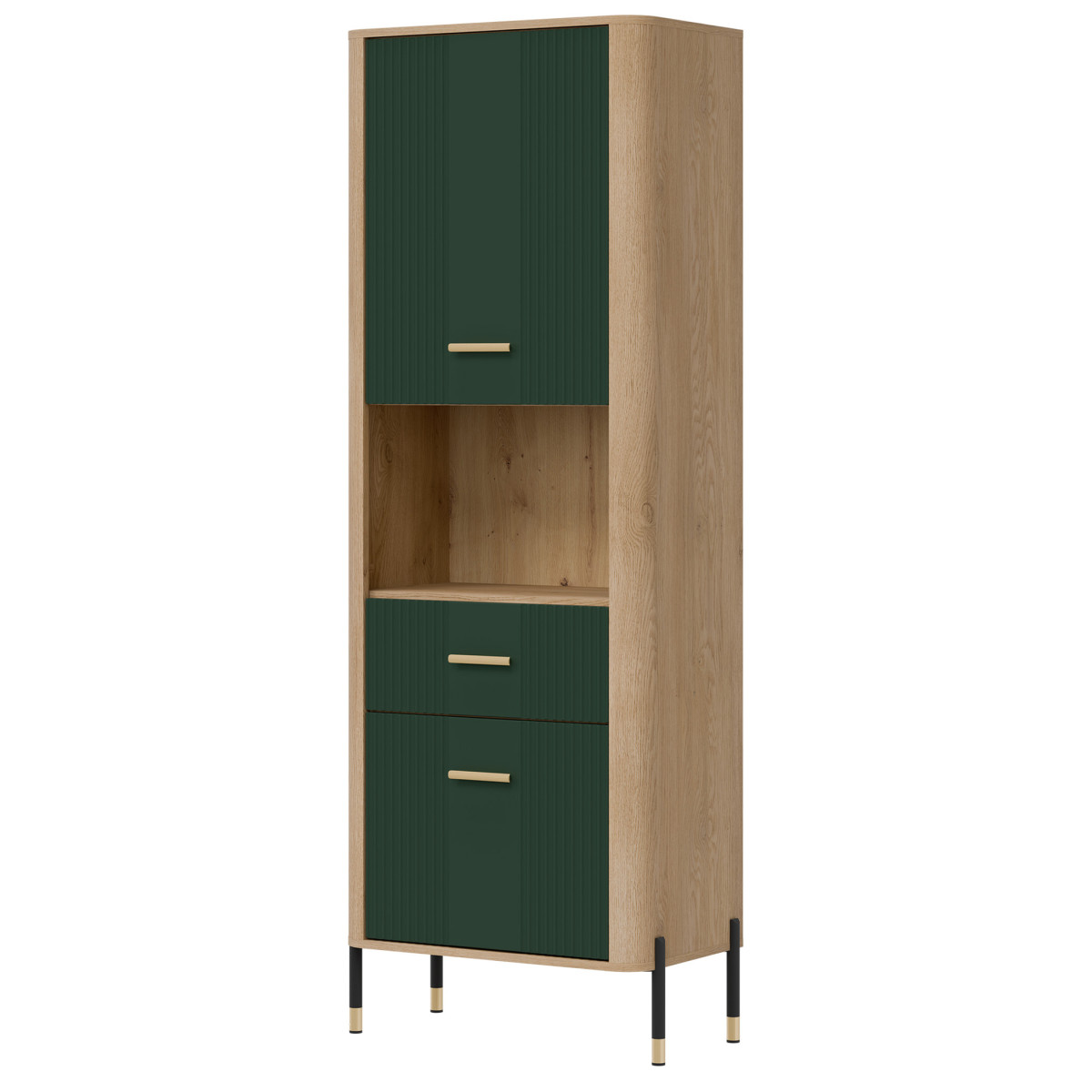 The Dante DT15 Cabinet – modern functionality in an elegant setting. The Dante DT15 is a choice for those who value minimalist elegance combined with maximum practicality. This tall, slender shelving unit is perfect for the living room, study, hallway, or even the bedroom – anywhere you need organized space and a stylish look. The shelving unit is divided into three functional zones. The upper and lower sections of the unit are lockable cabinets with solid fronts, ideal for storing items you want close at hand, but not necessarily on display. The middle, open shelf, finished in a natural oak finish, is perfect for displaying books, photo frames, or decorations, adding a unique character to the interior. Matte fronts in a choice of five elegant color shades contrast with the warm wood decor, creating a modern yet cozy effect. Subtle gold or black handles and slender legs with metallic accents complete the look, adding a touch of lightness and a stylish finish. The DT15 cabinet – a design that organizes space and attracts attention. This model is the perfect choice for those seeking stylish and practical furniture solutions. Introduce functionality to your interior in an elegant form.