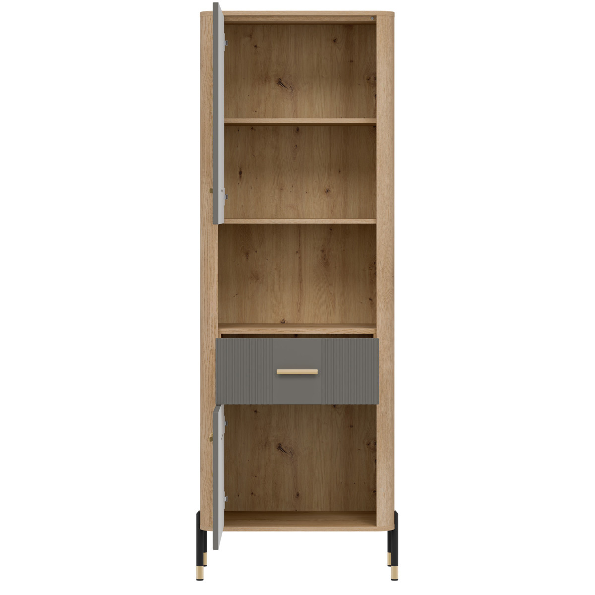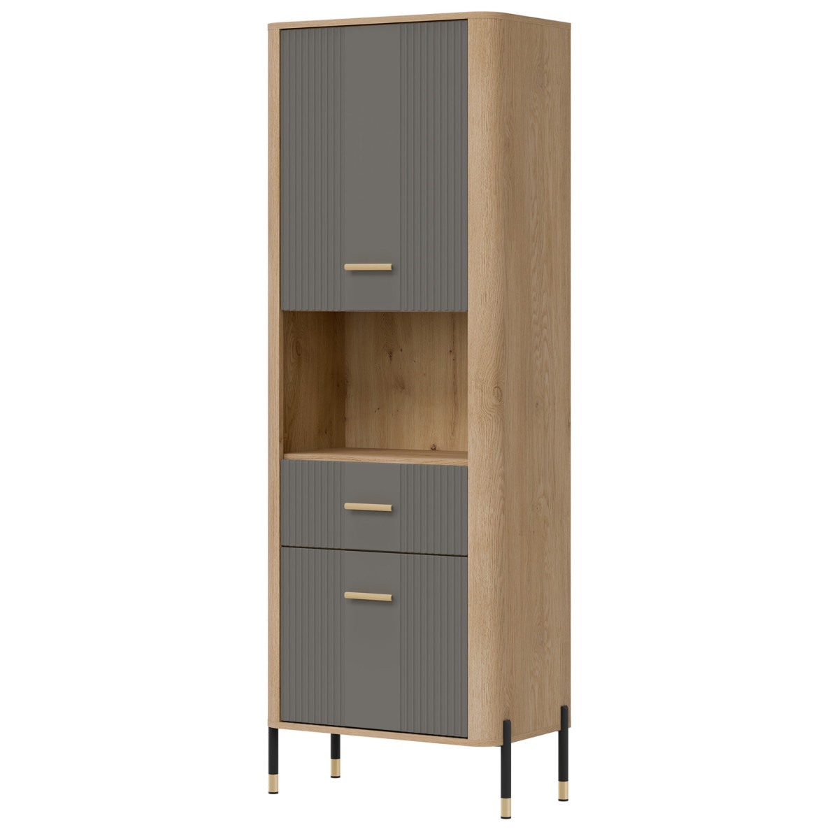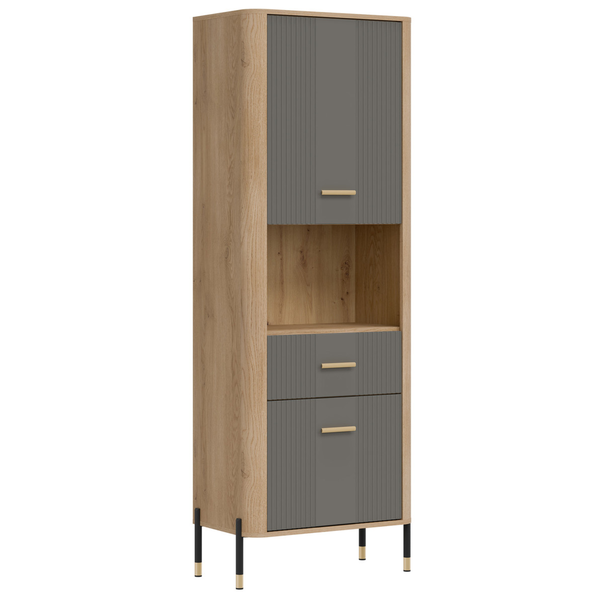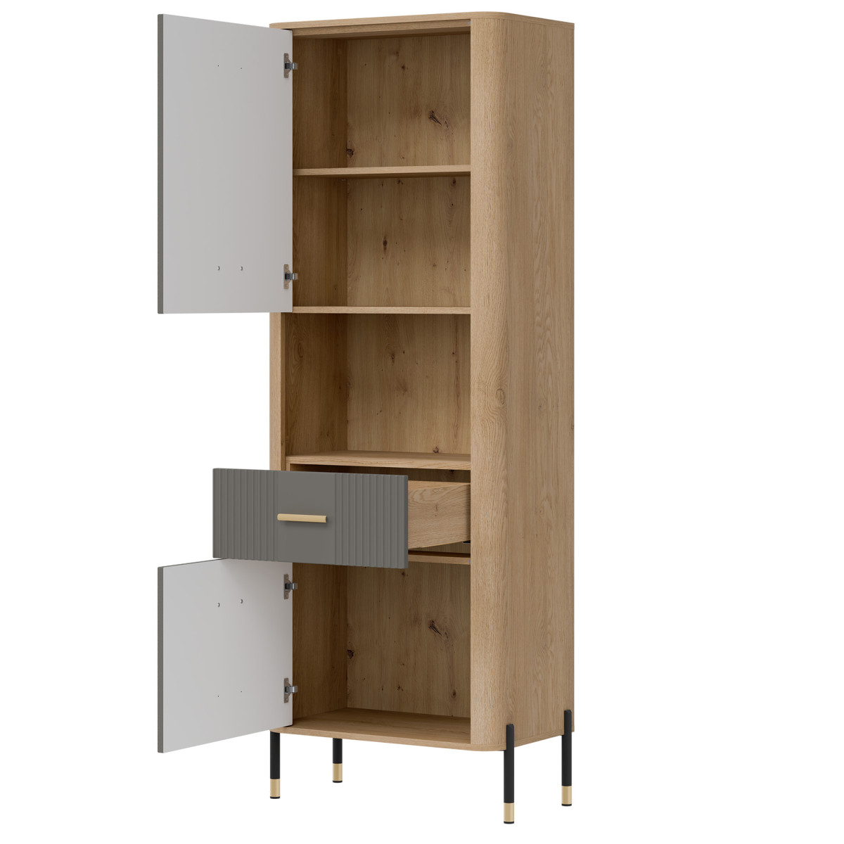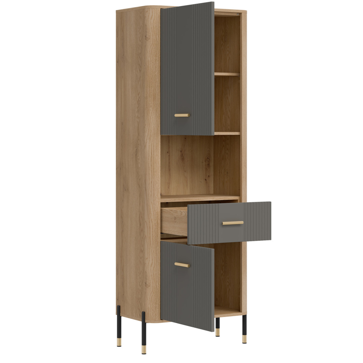 Width 70.5 cm Depth 40 cm Height 197 cm Product weight with packaging 52.95 kg Manufacturer’s code / symbol DT15 Collection name DANTE Name in the b2b system DANTE DT15 CREMONA OAK T/MATT GREY CABINET LP SET Number of product packages 5 Style Modern Equipment Assembly instructions / assembly accessories Assembly For self-assembly Body color Cremona Torro Oak Body material / type / thickness 16 mm furniture board / Strip 32 mm MDF furniture board Top of the body material / material / type / thickness 16 mm furniture board Bottom of the body material / material / type / thickness 16 mm furniture board Shelf color Cremona Torro Oak Shelf material / type / thickness 16 mm furniture board Shelf quantity 1 Back wall material / type / thickness 2.5 mm HDF furniture board Back wall part visible color Artisan Oak Front color Matte Gray Front finish material / type / thickness 18 mm MDF furniture board Front hinge ⌀ 35 mm adjustable in three planes Front opening universal left / right YES Front handle / finish / color Metal / Black or gold Soft-close door system Standard Soft-close drawer system Standard Drawer guides Favorit Q2 Leg / finish / color Non-adjustable / metal / black – gold Leg height 118 mm Number of doors 2 Number of drawers 1 Number of open niches 1 Number of closed niches 3