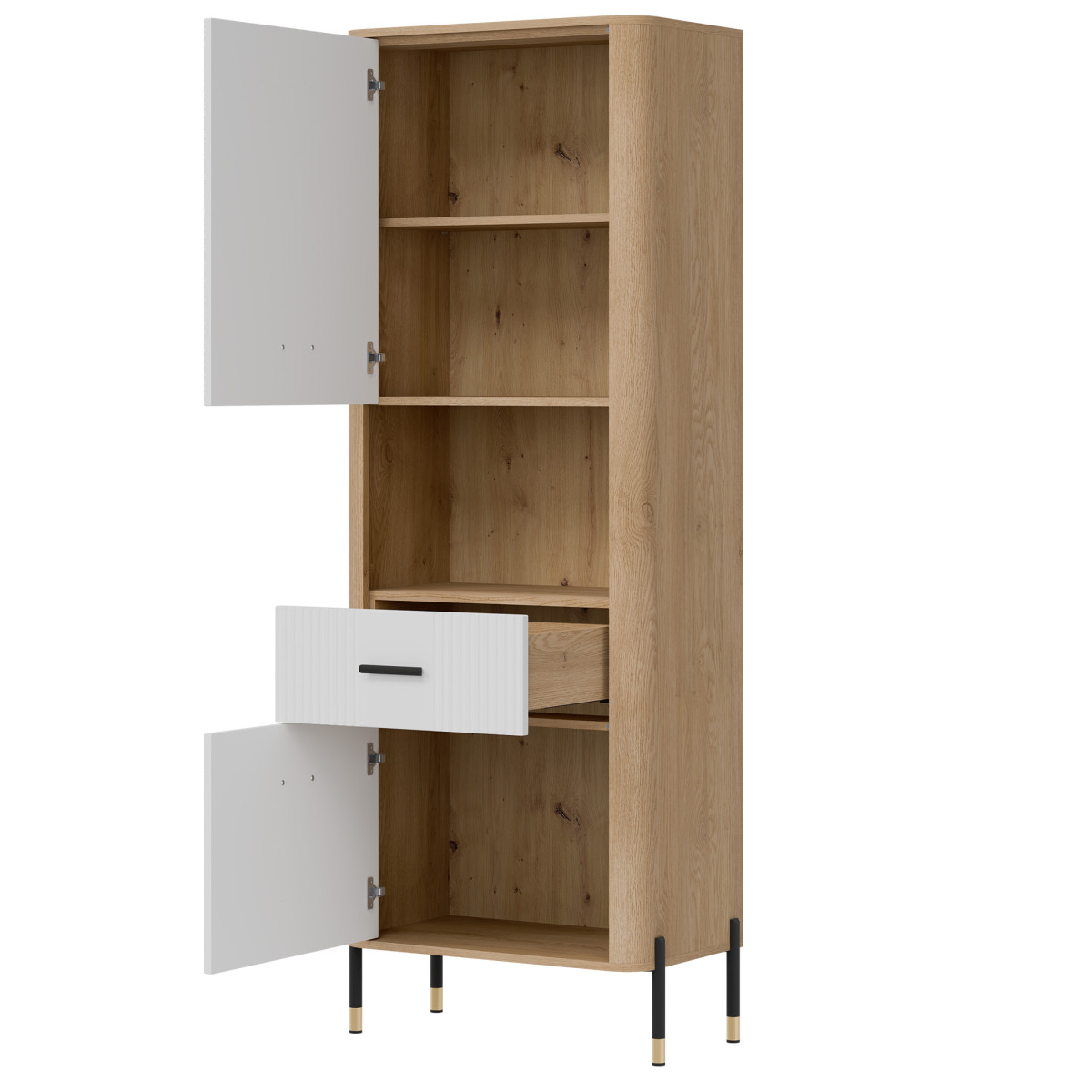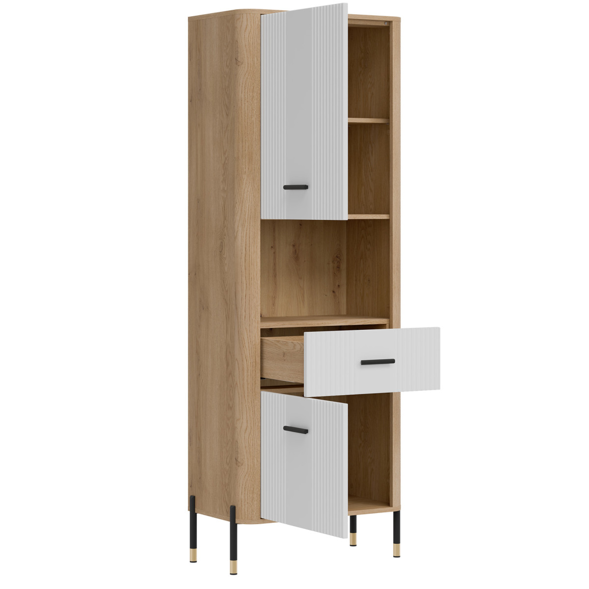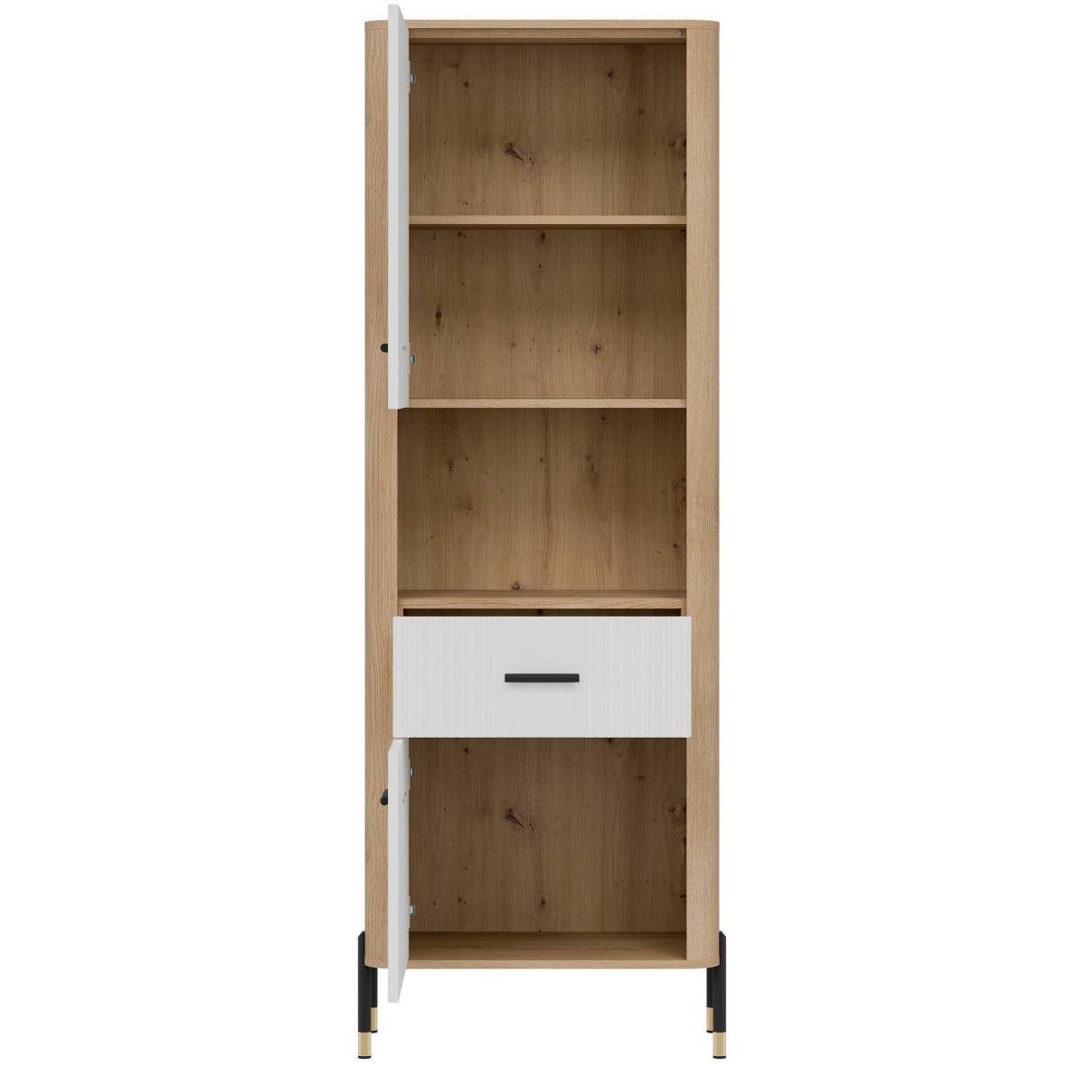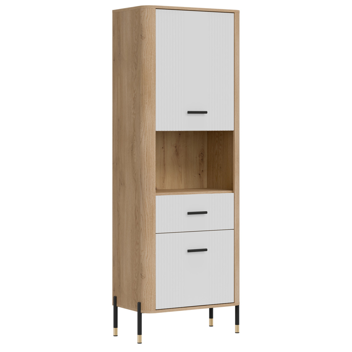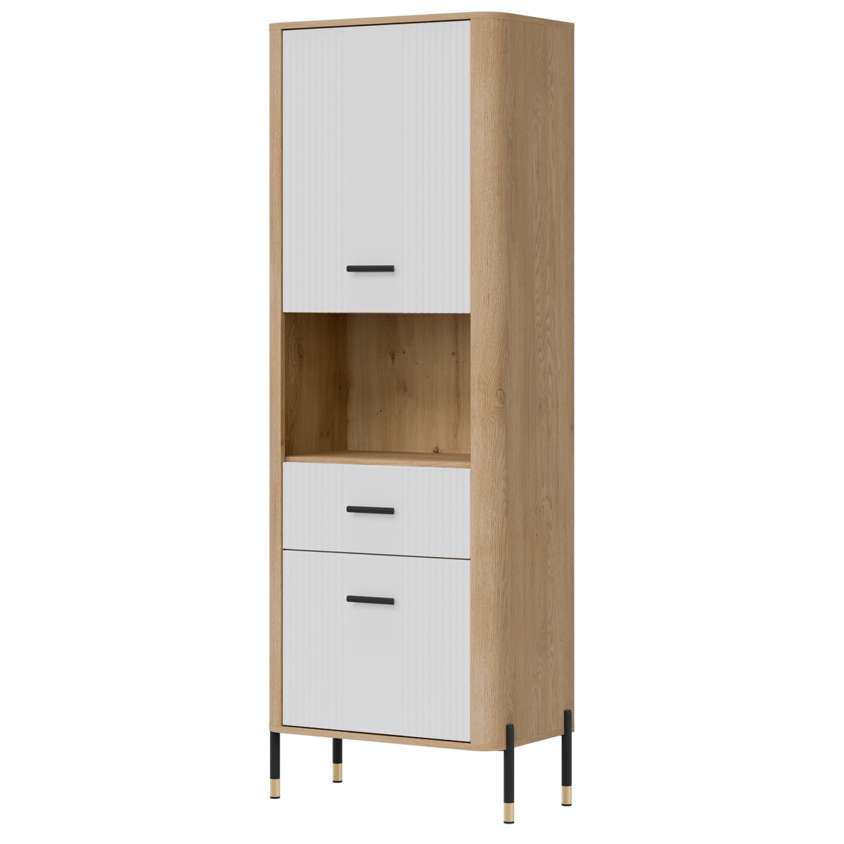 The Dante DT15 Cabinet – modern functionality in an elegant setting. The Dante DT15 is a choice for those who value minimalist elegance combined with maximum practicality. This tall, slender shelving unit is perfect for the living room, study, hallway, or even the bedroom – anywhere you need organized space and a stylish look. The shelving unit is divided into three functional zones. The upper and lower sections of the unit are lockable cabinets with solid fronts, ideal for storing items you want close at hand, but not necessarily on display. The middle, open shelf, finished in a natural oak finish, is perfect for displaying books, photo frames, or decorations, adding a unique character to the interior. Matte fronts in a choice of five elegant color shades contrast with the warm wood decor, creating a modern yet cozy effect. Subtle gold or black handles and slender legs with metallic accents complete the look, adding a touch of lightness and a stylish finish. The DT15 cabinet – a design that organizes space and attracts attention. This model is the perfect choice for those seeking stylish and practical furniture solutions. Introduce functionality to your interior in an elegant form.