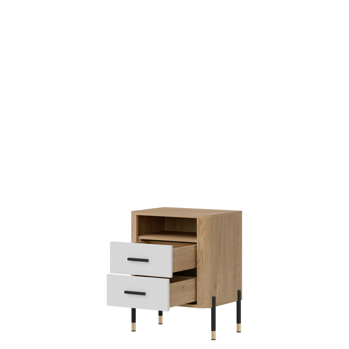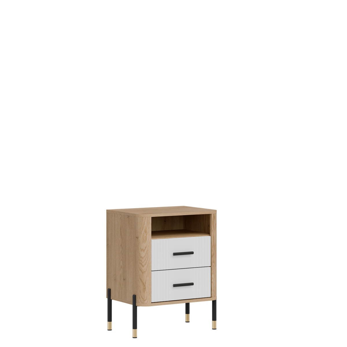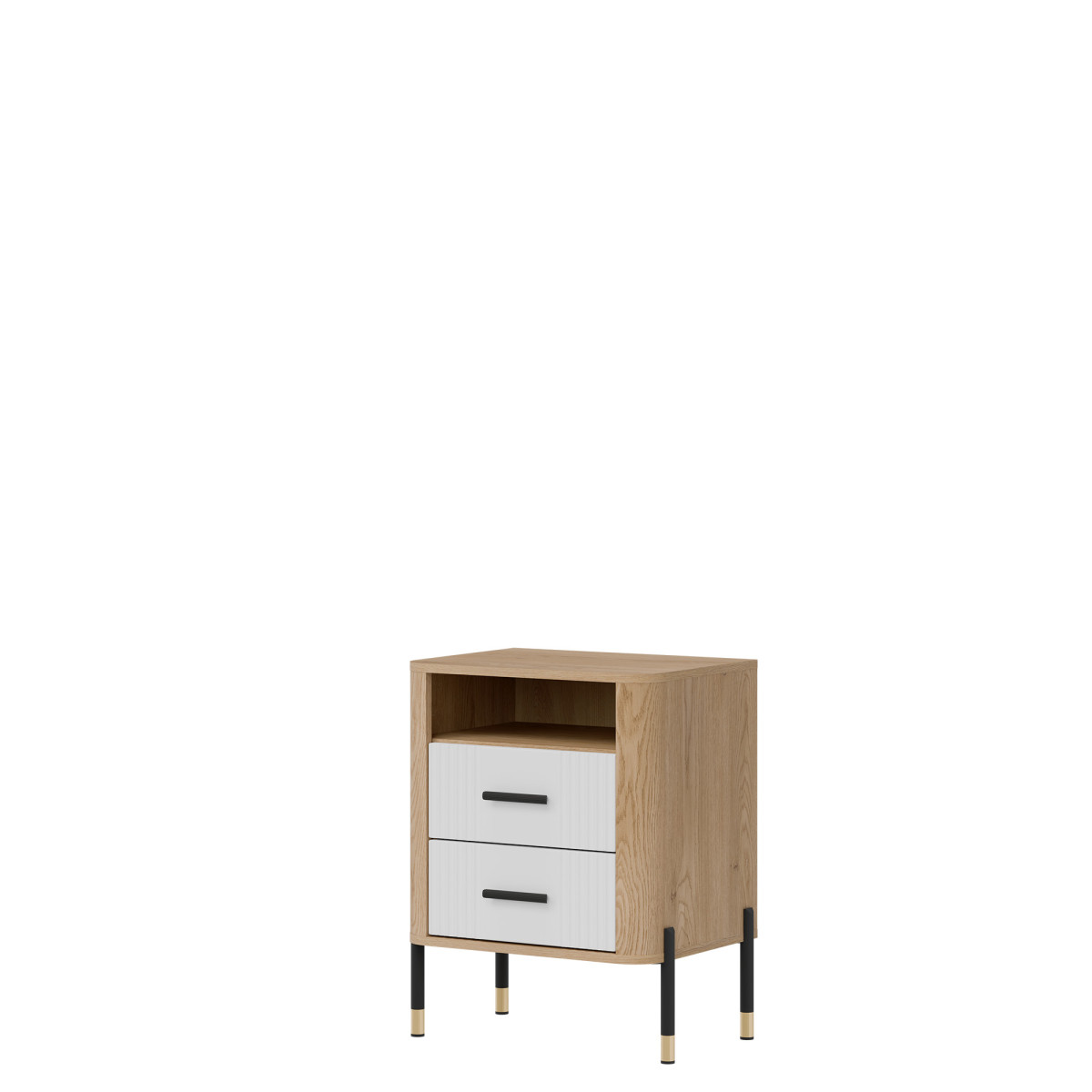 The Dante DT22 Nightstand – functionality with a touch of elegance. The Dante DT22 Nightstand is the perfect choice for those who value thoughtful design, functionality, and modern style in one compact form. Whether placed next to the bed in the bedroom or the sofa in the living room, it will always bring elegance with an industrial edge to the interior. The wide range of colors characteristic of the collection – combined with the warm shade of wood – creates a harmonious composition that will perfectly complement both modern and loft interiors. The fronts of the two spacious drawers are adorned with a choice of gold or black handles, which attract the eye and add a sophisticated, glamorous style to the overall design. Above the drawers, a practical open recess is perfect for a book, remote control, phone, or decorations. It’s the perfect solution for those who like to have everything they need always at hand. The solid structure rests on slender metal legs with a delicate gold finish, lending the piece a lightness and modern elegance. Dante DT22 – a practical detail with class. A nightstand is more than just a piece of furniture – it’s a functional interior decoration that will enhance its character and make everyday use of the space even more enjoyable.