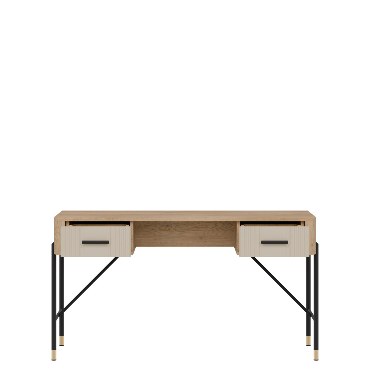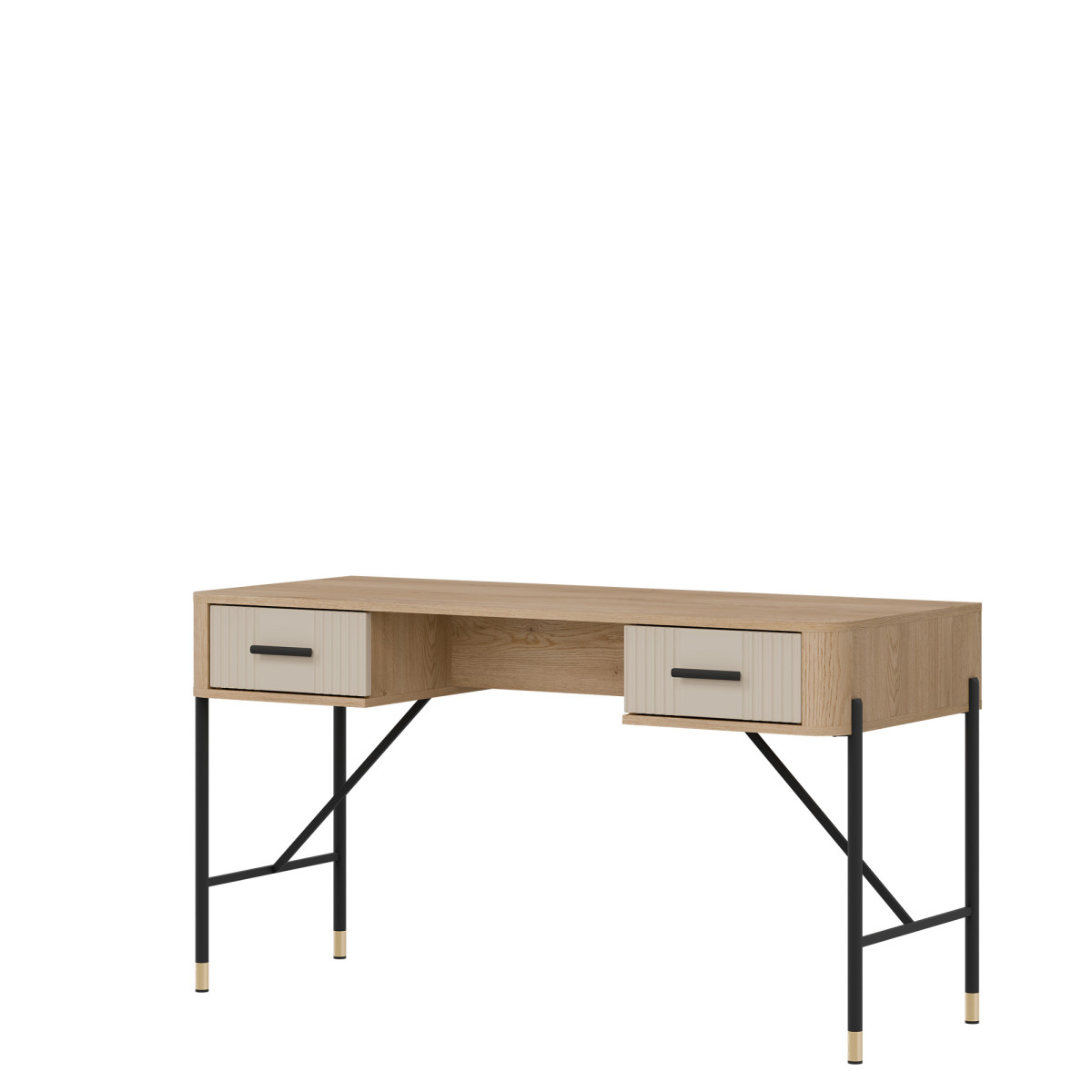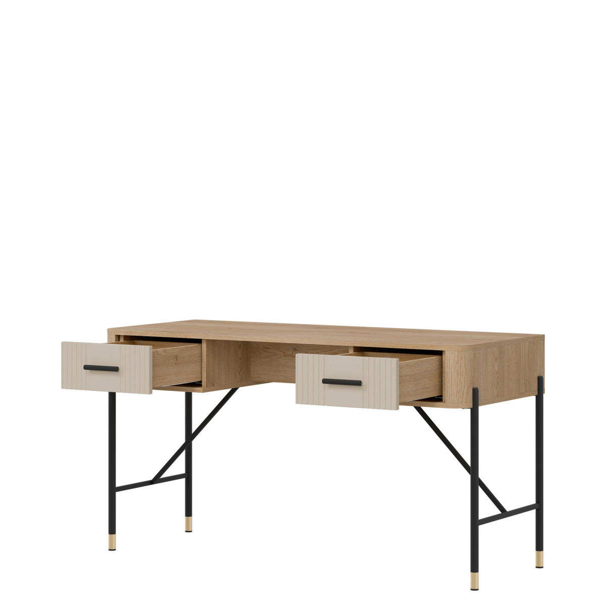 The Dante DT23 Desk – style and functionality in a modern form. The Dante Desk is a perfect blend of sophisticated design and a functional approach to workspace. Designed with modern interiors in mind, it will work perfectly in both elegant offices, home offices, and stylish study spaces. Its distinctive form, with a warm wood finish and fronts in five shades, is enhanced by a choice of gold or black handles and slender metal legs, making this piece an exceptionally aesthetic and versatile design element. The desk not only impresses with its appearance but also with its functionality – it is equipped with two practical drawers and an open recess, perfect for small accessories, notes, or a laptop. Metal legs with a decorative gold finish ensure stability and lend the entire structure a visual lightness. This makes it a perfect fit for both loft décor and elegant, minimalist interiors. Colors: Oak / Matte Black / Gold Accents. Dante DT23 – a desk that inspires action. It’s more than just a workspace. It’s a piece of furniture that combines style with comfort, creating the perfect environment for learning, working, or pursuing creative passions. The DT23 desk is a reliable companion for everyday challenges, further enhancing the character of your interior.