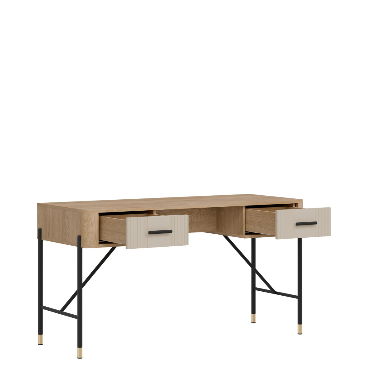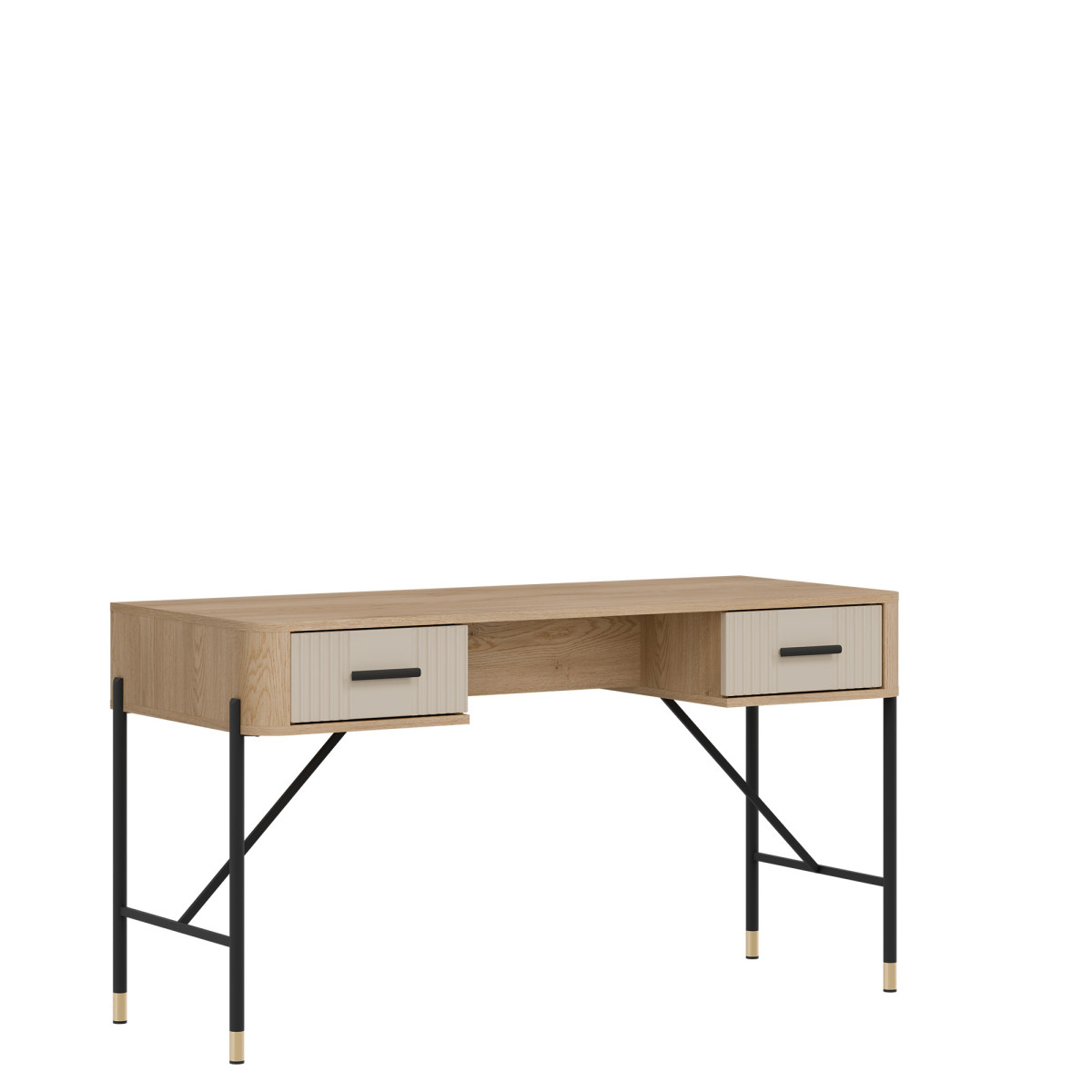 Width 140.5 cm Depth 56.5 cm Height 75 cm Product weight with packaging 32.15 kg Manufacturer’s code / symbol DT23 Collection name DANTE Name in the b2b system DANTE DT23 CREMONA OAK T/MATT CASHMERE DESK SET Number of product packages 4 Style Modern Equipment Assembly instructions / assembly accessories Assembly For self-assembly Body color Cremona Torro Oak Body finish material / type / thickness 16 mm furniture board / Strip 32 mm MDF furniture board Top body finish / material / type / thickness 16 mm furniture board Bottom body finish / material / type / thickness 16 mm furniture board Front color Cashmere Matte Front finish material / type / thickness 18 mm MDF furniture board Front handle / finish / color Metal / Black or gold Soft-close drawer system Standard Drawer guides Favorit Q2 Leg / finish / color Non-adjustable / metal / black – gold Number of drawers 2