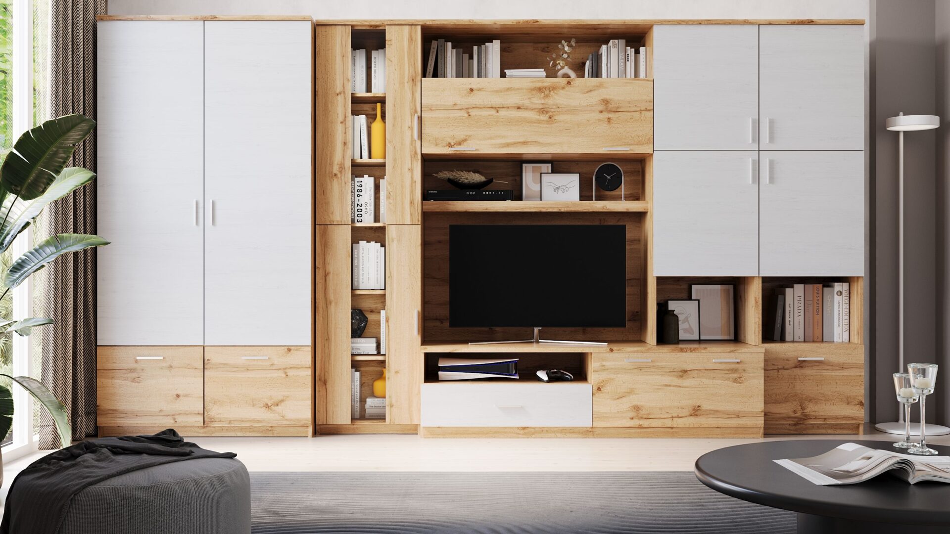 The DELI set features a modern and elegant design, solidity, and functionality. Made of high-quality laminated board, it will last for years, and its simple construction ensures comfortable use even for the most demanding users. Additionally, the frames are edged with ABS. The furniture is perfect for living rooms and lounges. The furniture is spacious and available in a variety of colors.