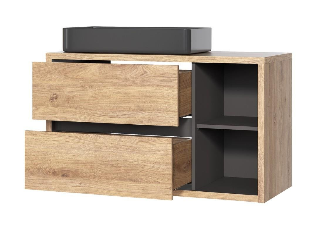 The DEVON collection combines a simple, understated form with a wood-effect Shetland Oak finish, creating a harmonious and unique interior. Open shelves and graphite-colored interiors complete the look. All doors and drawers feature a soft-close system. The set includes a vanity unit, a mirror cabinet, and a tall cabinet. Optionally, an LED lamp and a stylish countertop washbasin can be added.