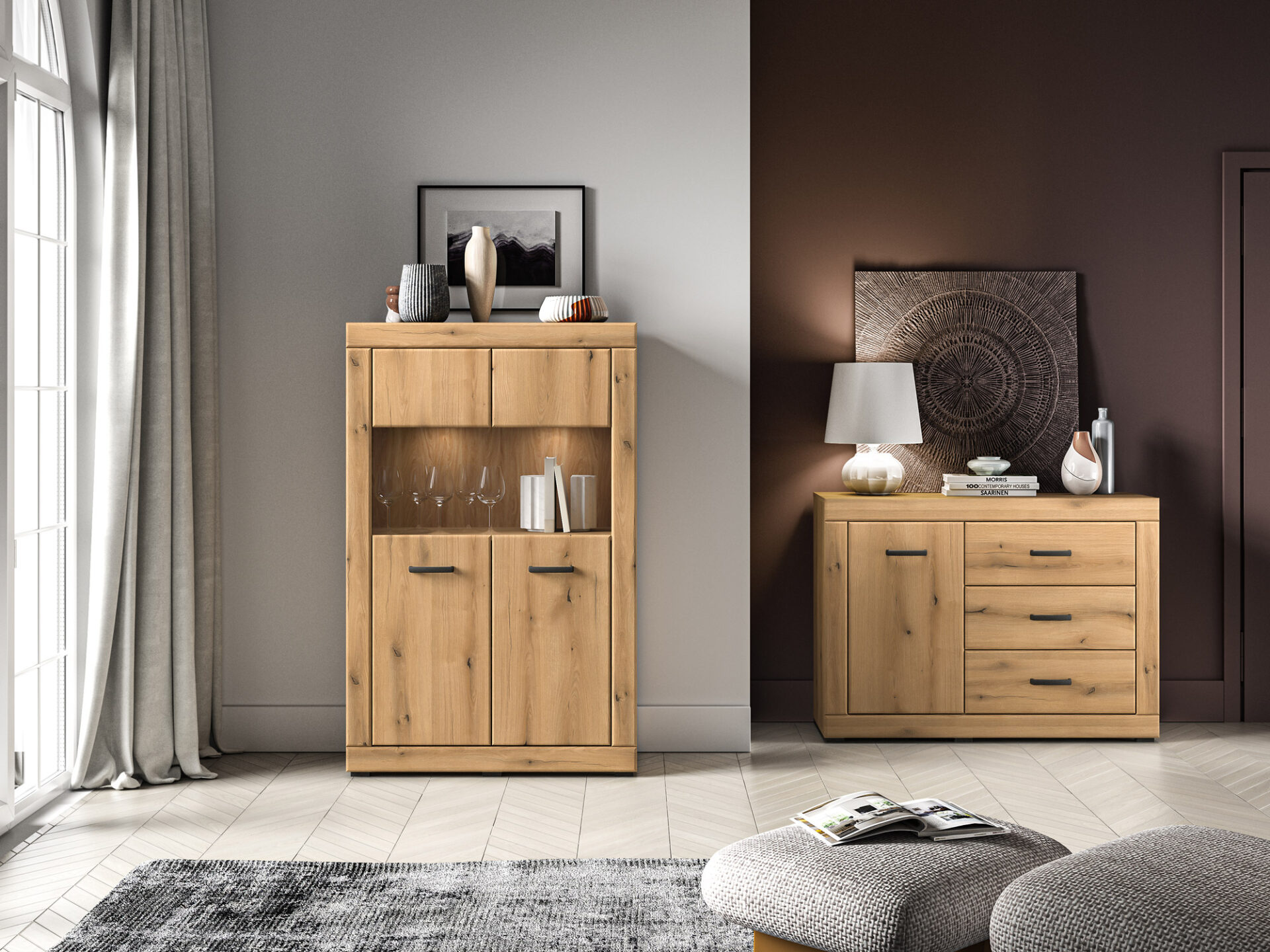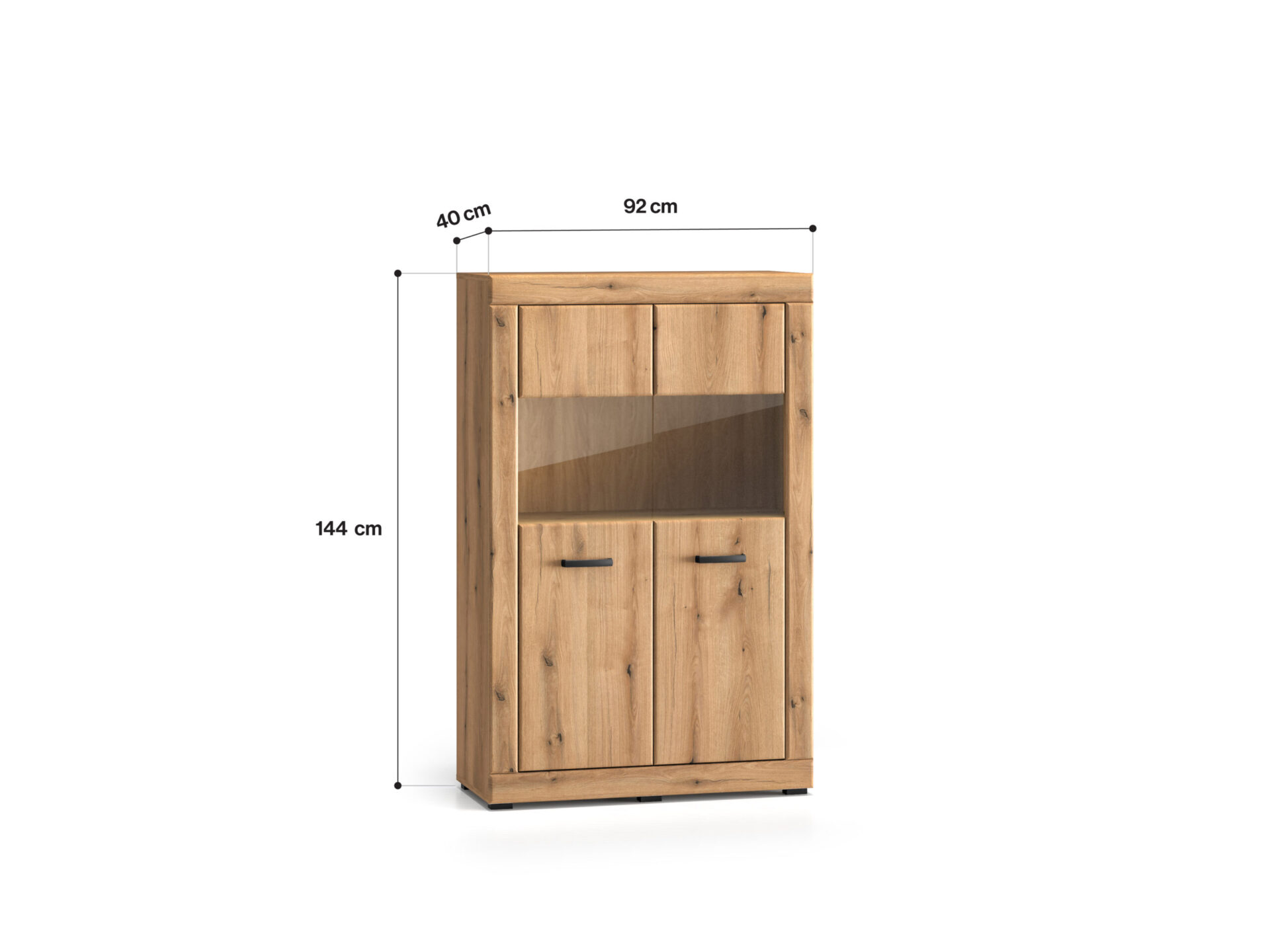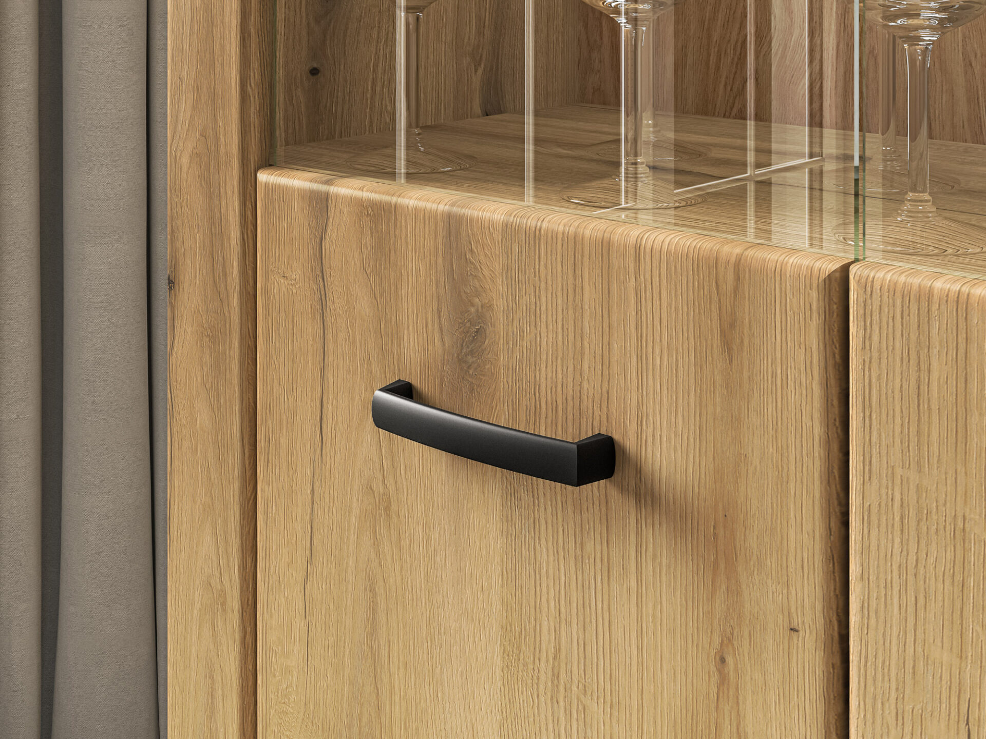 The Dora 03 display cabinet is a piece of furniture that lets you store and display your favorite items. It’s divided into three sections. The upper and lower sections are hidden from view by your guests. Three spacious recesses offer space for tablecloths, towels, or other home textiles. The middle section is a glass-enclosed area. This space allows you to display your favorite items—porcelain cups or beautiful, stylish tableware. Choose the Dora display cabinet and keep your interior organized.