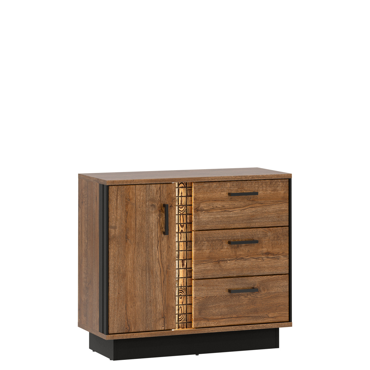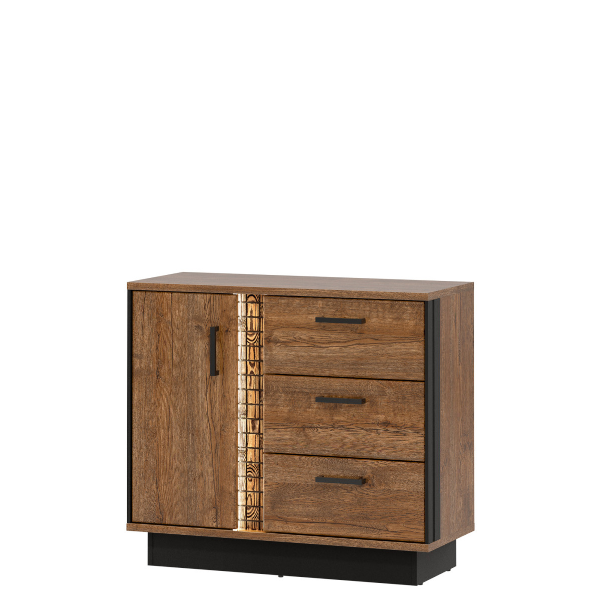 The DORIAN DN02 chest of drawers is a versatile, compact chest of drawers that will work well in both living rooms and den spaces. It features two spacious, lockable alcoves and three generous drawers. You can easily store all your essentials and accessories inside. The April Oak color scheme is complemented by black accents, highlighting the overall style of the chest of drawers. A natural wood strip with LED lighting adds further charm. The chest of drawers’ warm colors and minimalist form will create an engaging, modern interior and create a cozy atmosphere. The chest of drawers will work perfectly in combination with other pieces from the DORIAN series or as a standalone piece, adapting to your room’s décor.