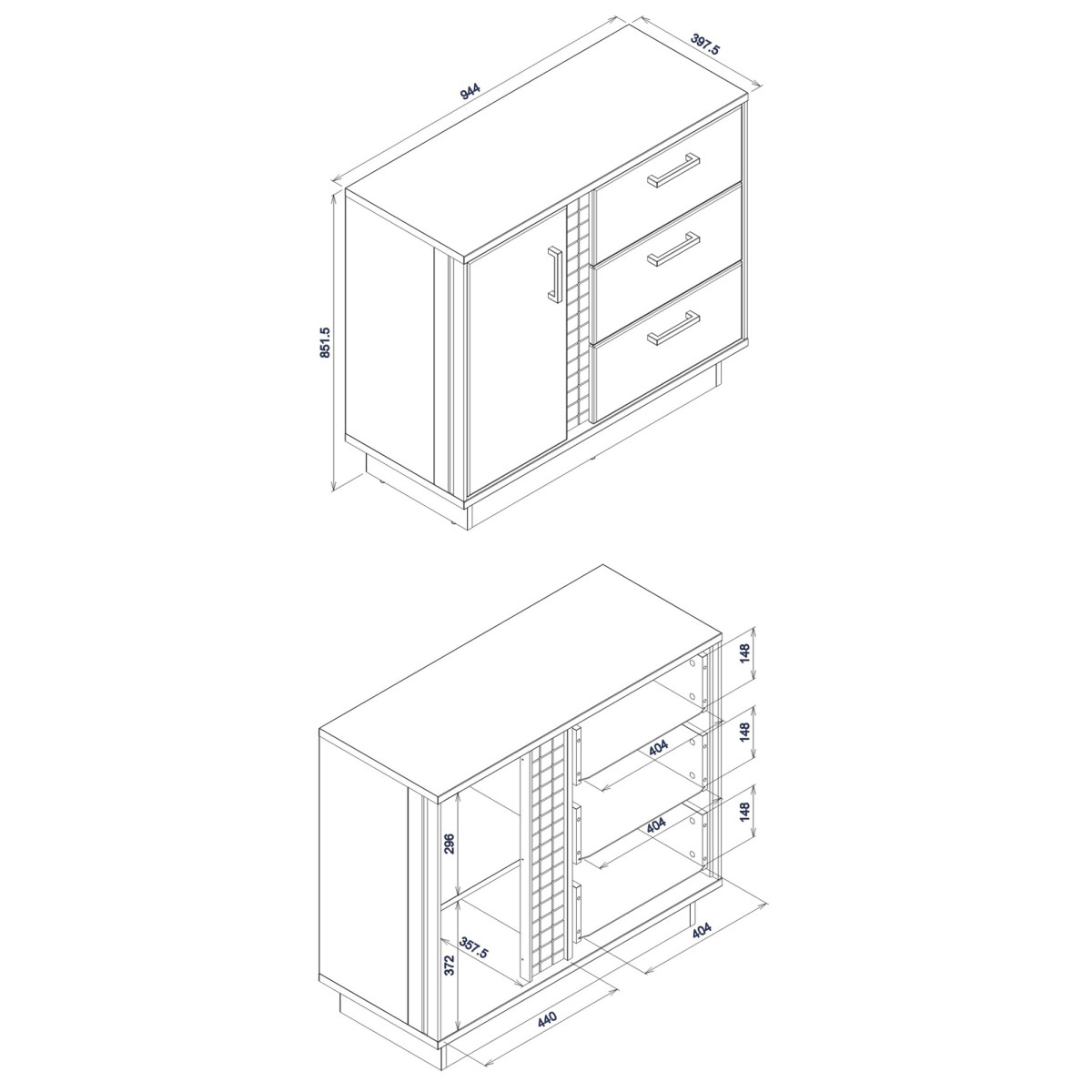 Width 94.5 cm Depth 39.5 cm Height 84 cm Product weight with packaging 45.35 kg Manufacturer’s code / symbol DN02 Collection name DORIAN Name in the b2b system DORIAN DN-2 april oak/black CHEST OF DRAWERS set Number of product packages 3 Style Modern Equipment Assembly instructions / assembly accessories Assembly For self-assembly Body color April Oak / Black Body material / type / thickness 16 mm furniture board / Strip 16 mm MDF furniture board Top body material / type / thickness 22 mm furniture board Bottom body material / type / thickness 22 mm furniture board Base body material / type / thickness 16 mm furniture board Shelf color April Oak Shelf material / type / thickness 16 mm furniture board Crown type shelf quantity 1 Back wall material / type / thickness 2.5 mm HDF furniture board Back wall – visible part color Black Front color April Oak Front material / type / thickness 18 mm MDF furniture board Front hinge ⌀ 35 mm adjustable in three planes Front handle / material / color Plastic / black Lighting External lighting Standard External lighting light color Warm white External lighting energy class A++ Soft-close door system Standard Full extension drawer guides Foot / finish / color Non-adjustable / Furniture glide / plastic / Black Number of doors 1 Number of drawers 3 Number of closed niches 2