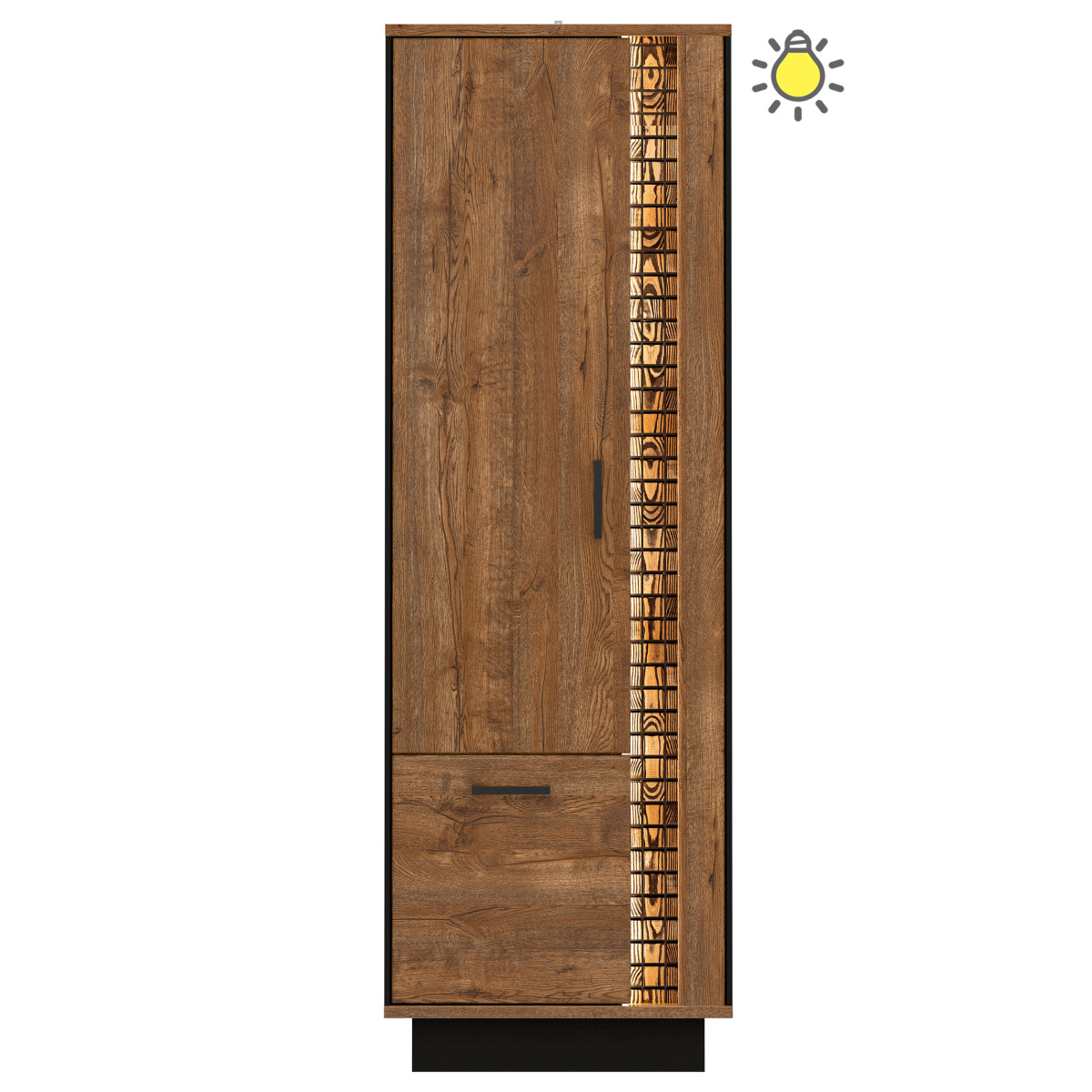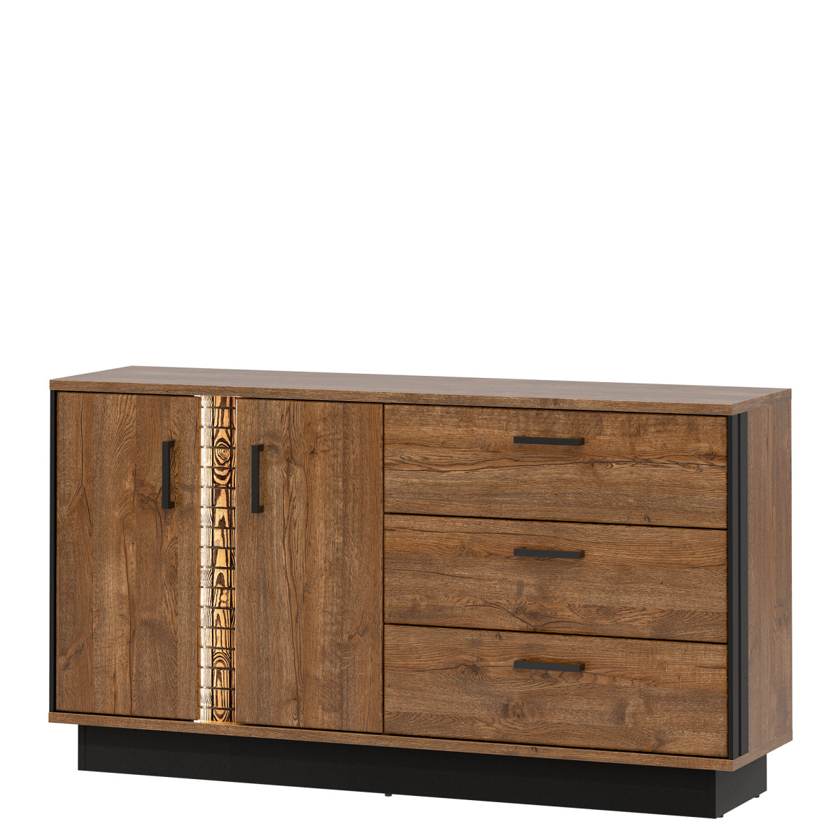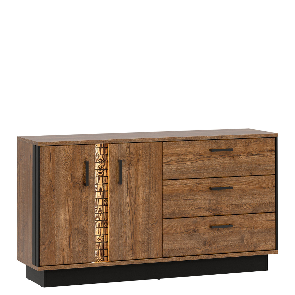 The DORIAN DN03 chest of drawers is perfect for a living room, den, or dining room. This modern chest of drawers with three drawers and one opening cabinet offers ample storage for essential items in any home. The top can be used to display stylish decorations, keepsakes, or photographs. The April Oak color scheme is complemented by black accents, emphasizing the overall design of the chest of drawers. A natural wood strip with LED lighting adds further charm. The chest of drawers’ warm colors and minimalist form will create an engaging, modern interior and create a cozy atmosphere. The chest of drawers will work perfectly in combination with other pieces from the DORIAN series or as a standalone piece, adapting to your room’s décor.