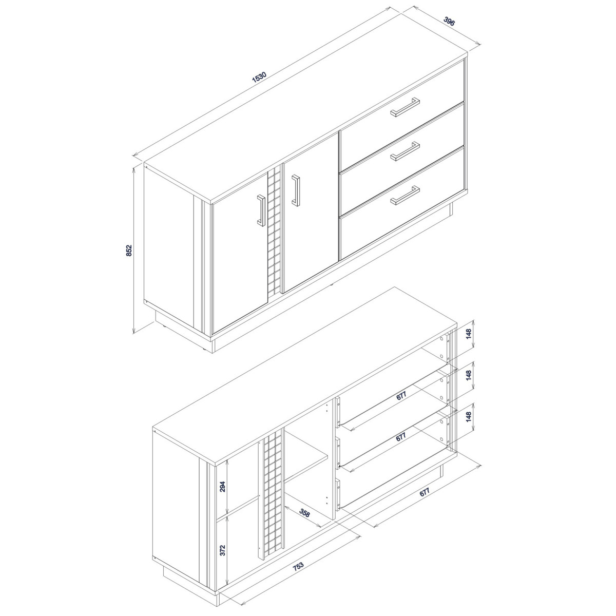 Width 153 cm Depth 39.5 cm Height 84 cm Product weight with packaging 63.85 kg Manufacturer’s code / symbol DN03 Collection name DORIAN Name in the b2b system DORIAN DN-3 april oak/black CHEST OF DRAWERS set Number of product packages 3 Style Modern Equipment Assembly instructions / assembly accessories Assembly For self-assembly Body color April Oak / Black Body material / type / thickness 16 mm furniture board / Strip 16 mm MDF furniture board Top body material / type / thickness 22 mm furniture board Bottom body material / type / thickness 22 mm furniture board Base body material / type / thickness 16 mm furniture board Shelf color April Oak Shelf material / type / thickness 16 mm furniture board Crown type shelf quantity 1 Back wall material / type / thickness 2.5 mm HDF furniture board Back wall – visible part color Black Front color April Oak Front material / type / thickness 18 mm MDF furniture board Front hinge ⌀ 35 mm adjustable in three planes Front handle / material / color Plastic / black Lighting External lighting As standard External lighting light color Warm white External lighting energy class A++ Soft-close door system As standard Full extension drawer guides Foot / finish / color Non-adjustable / Furniture glide / plastic / Black Number of doors 2 Number of drawers 3 Number of closed niches 2