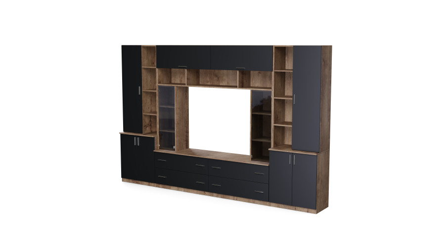 The MODENA wall unit in Lefkas Oak with a black onyx accent is a spacious unit combining open shelves, drawers, and closed cabinets, designed for clear organization of living space. The 340 x 220 cm design provides ample storage space while maintaining a cohesive and orderly layout.