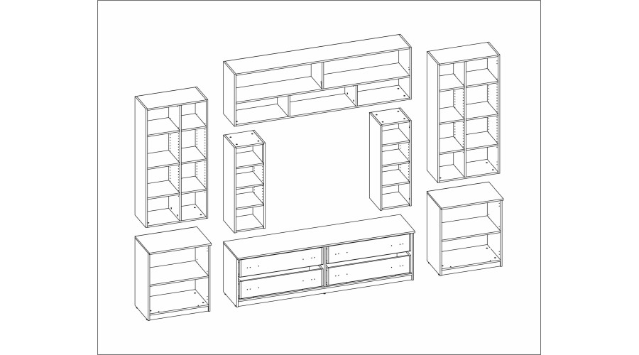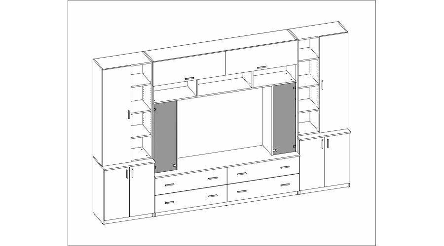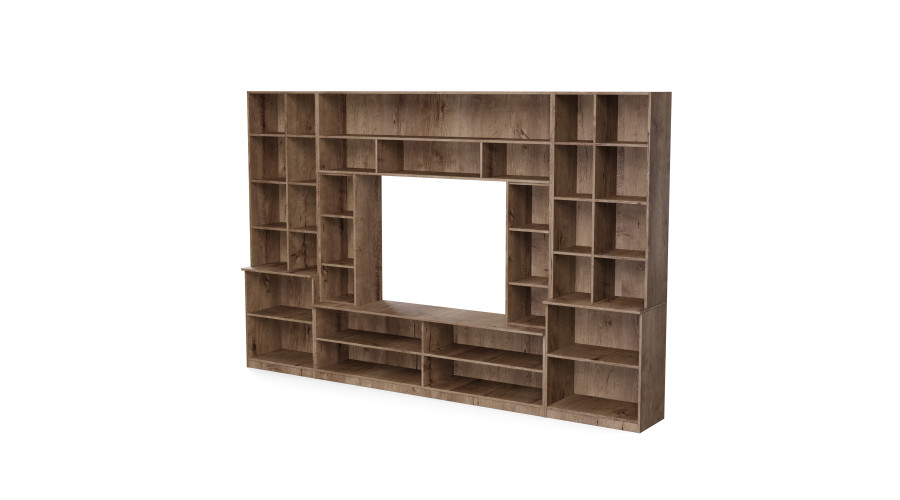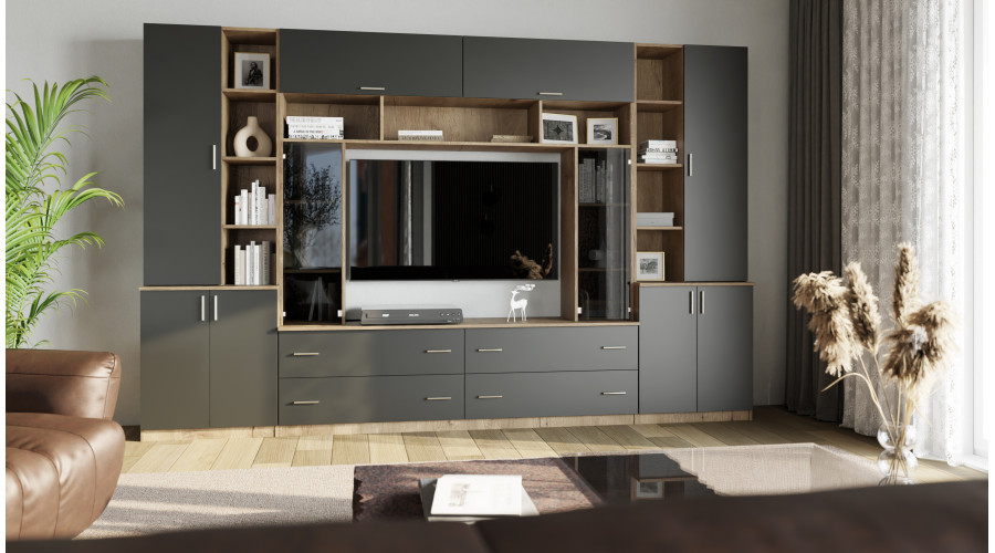 Open shelves allow for the aesthetic display of decorations, books, or personal items, giving the unit a unique character. The central section with space for a TV creates a functional multimedia zone, while the thoughtful arrangement of modules facilitates the convenient arrangement of electronics and accessories.